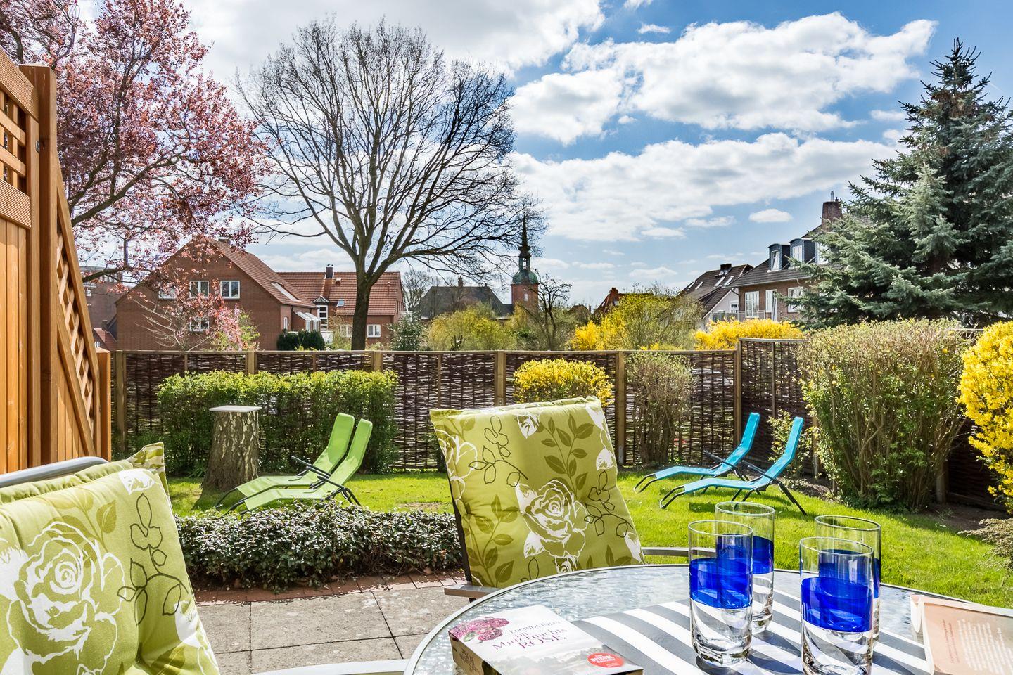 Von der Terrasse mit Sonnenschirm, Liegen und Grill haben Sie einen schönen Blick in den Garten.
