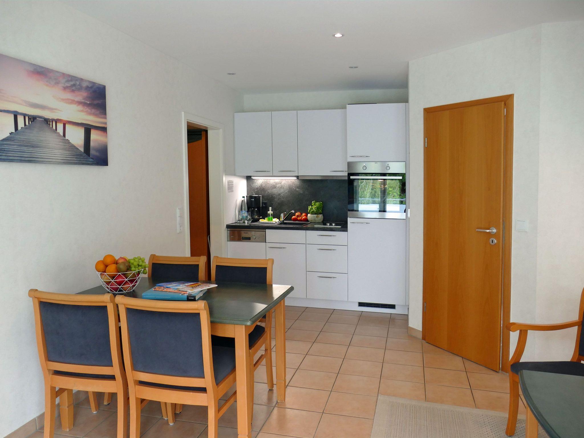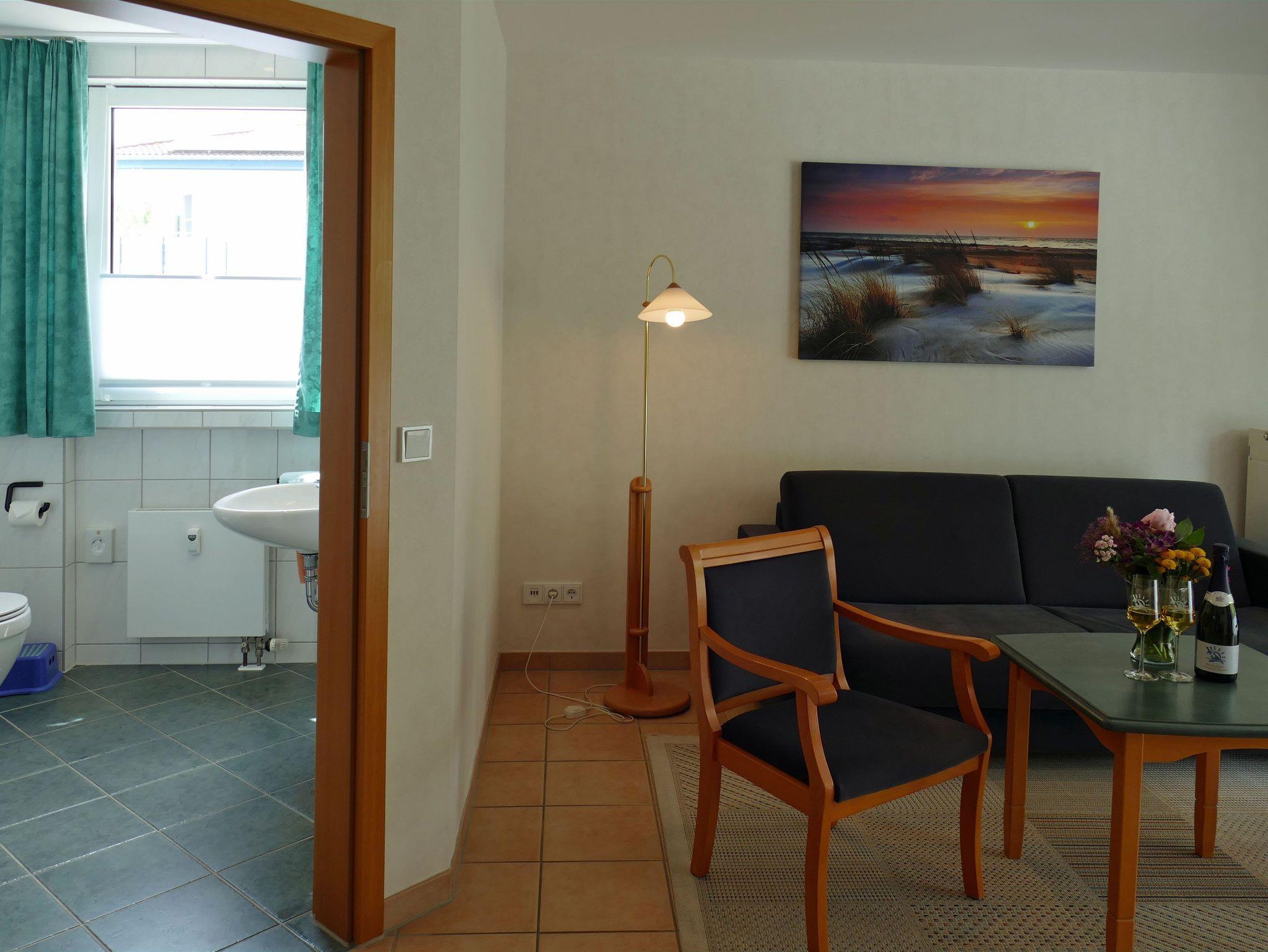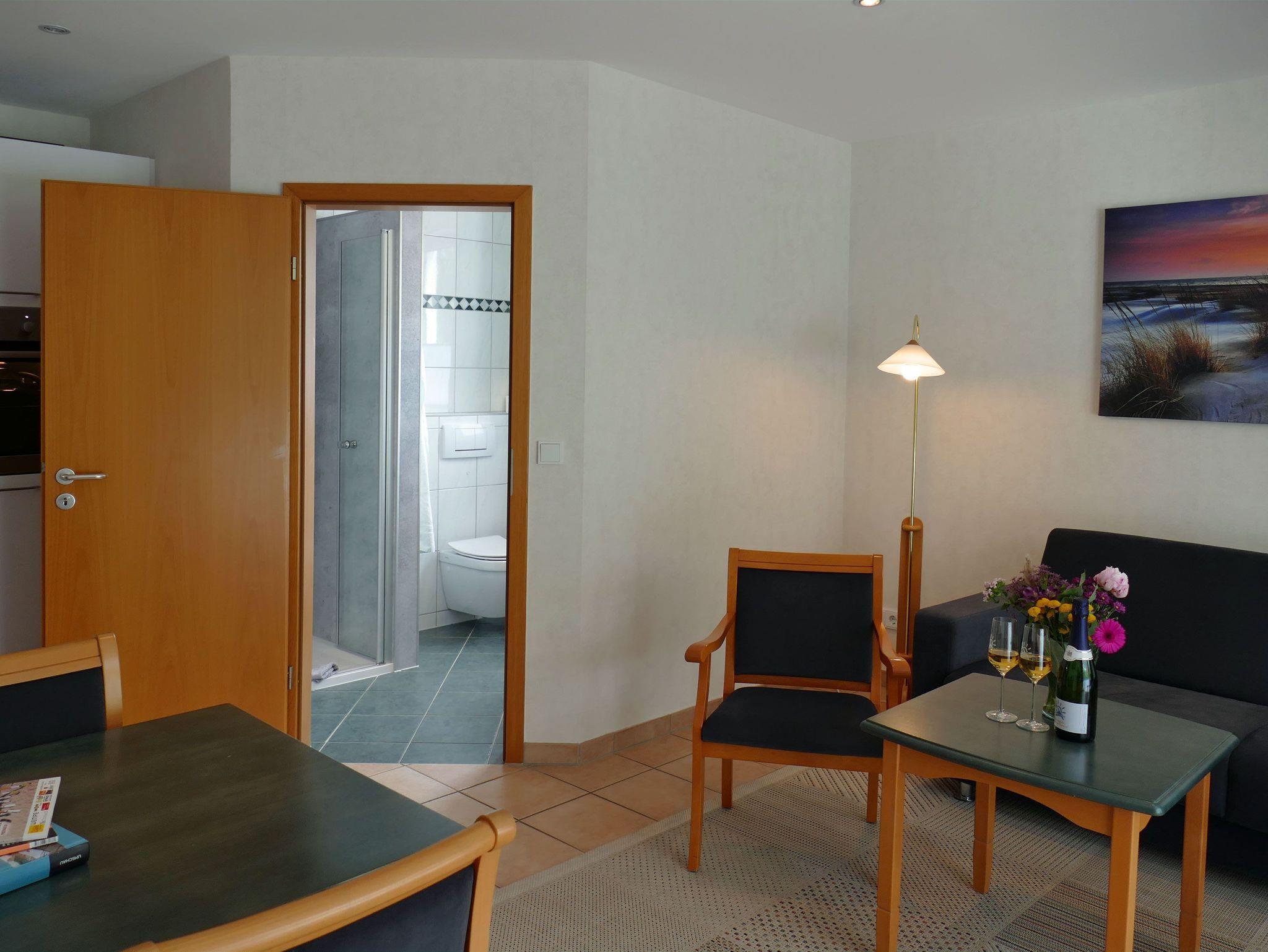 Die großzügige Zwei-Raum-Wohnung (ca. 50m²) liegt im 1. OG des Ferienhauses und ist mit Kochnische, Duschbad, Balkon, SAT-TV u.v.m. ausgestattet. Im Wohnbereich steht ein gemütliches Sofa mit Schlaffunktion für Sie bereit sowie der TV-Schrank mit HiFi Anlage und der Essplatz mit vier bequemen Stühlen. Hinter der gropßen Fensterfront nach Westen befindet sich der große Balkon mit seinen Balkonmöbeln für 4 Personen zum verweilen einläd. Die Küchenzeile ist mit einem Zwei-Plattenherd und Backofen, Kühlschrank, Kaffeemaschine u.v.m. ausgestattet.