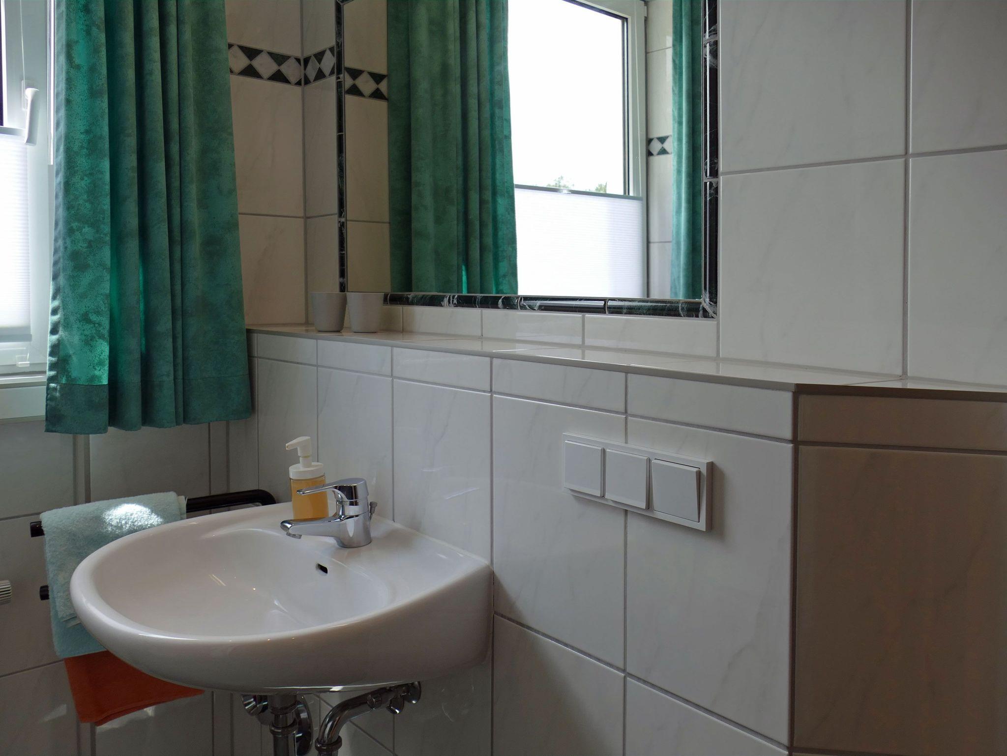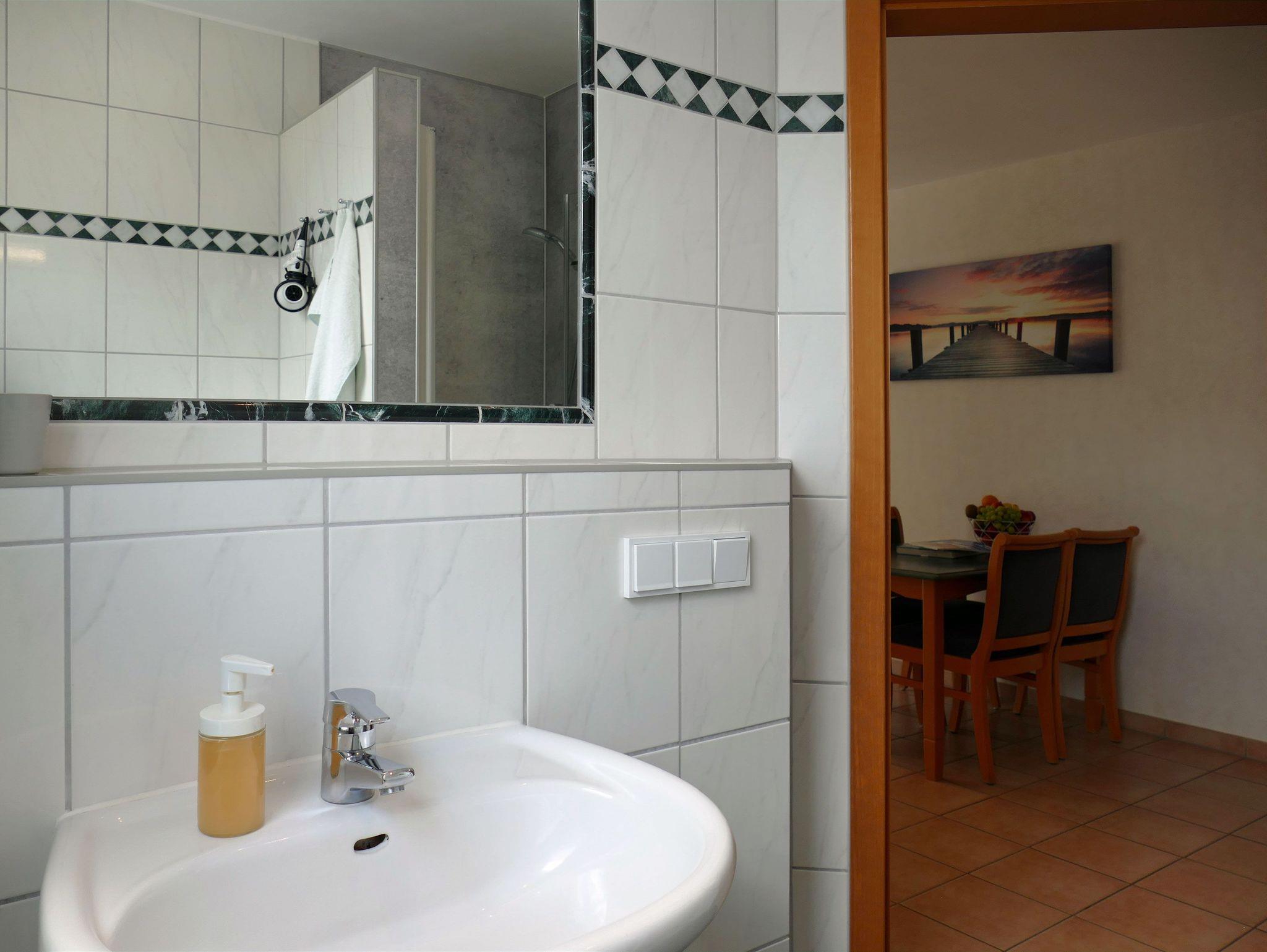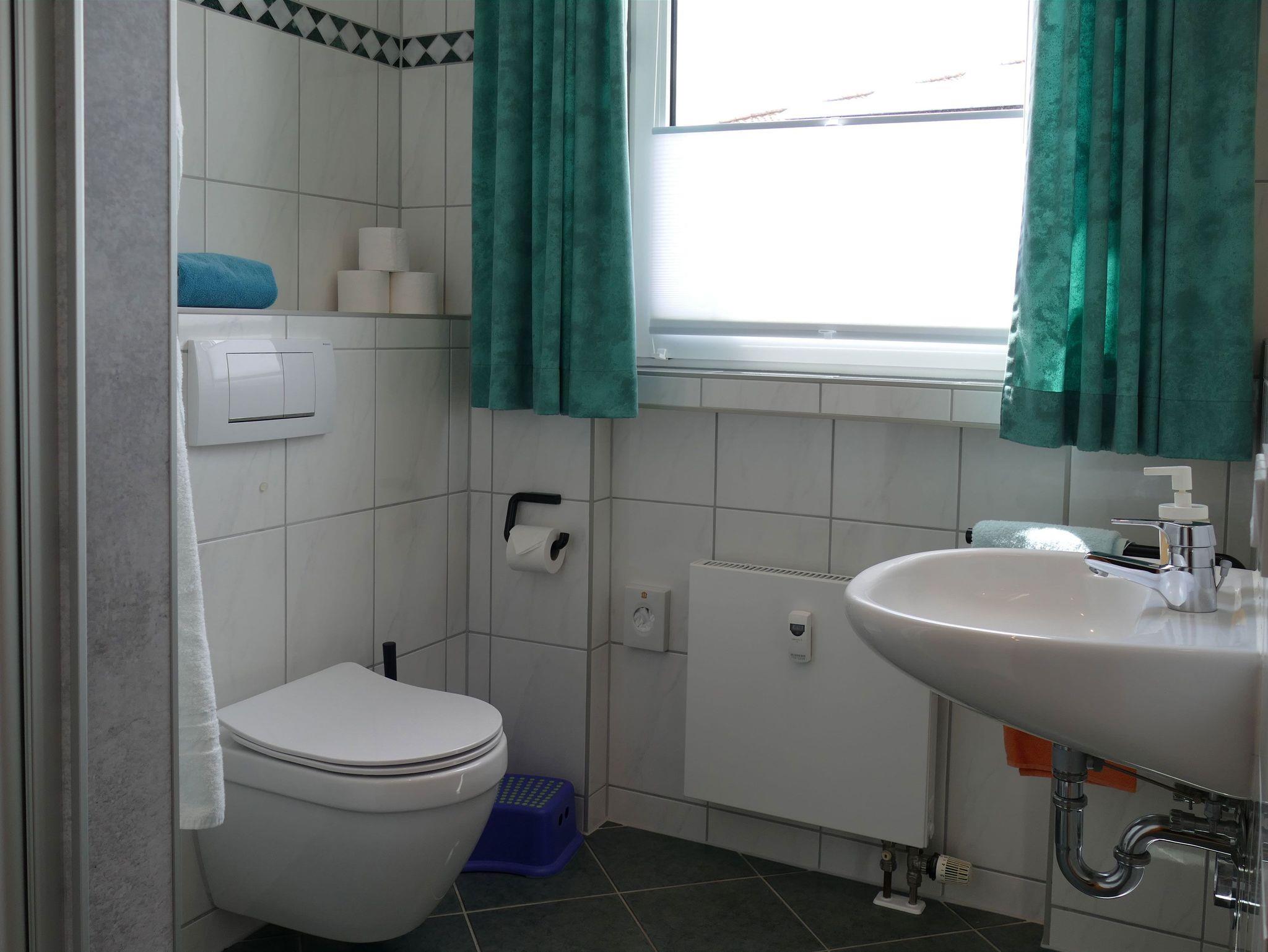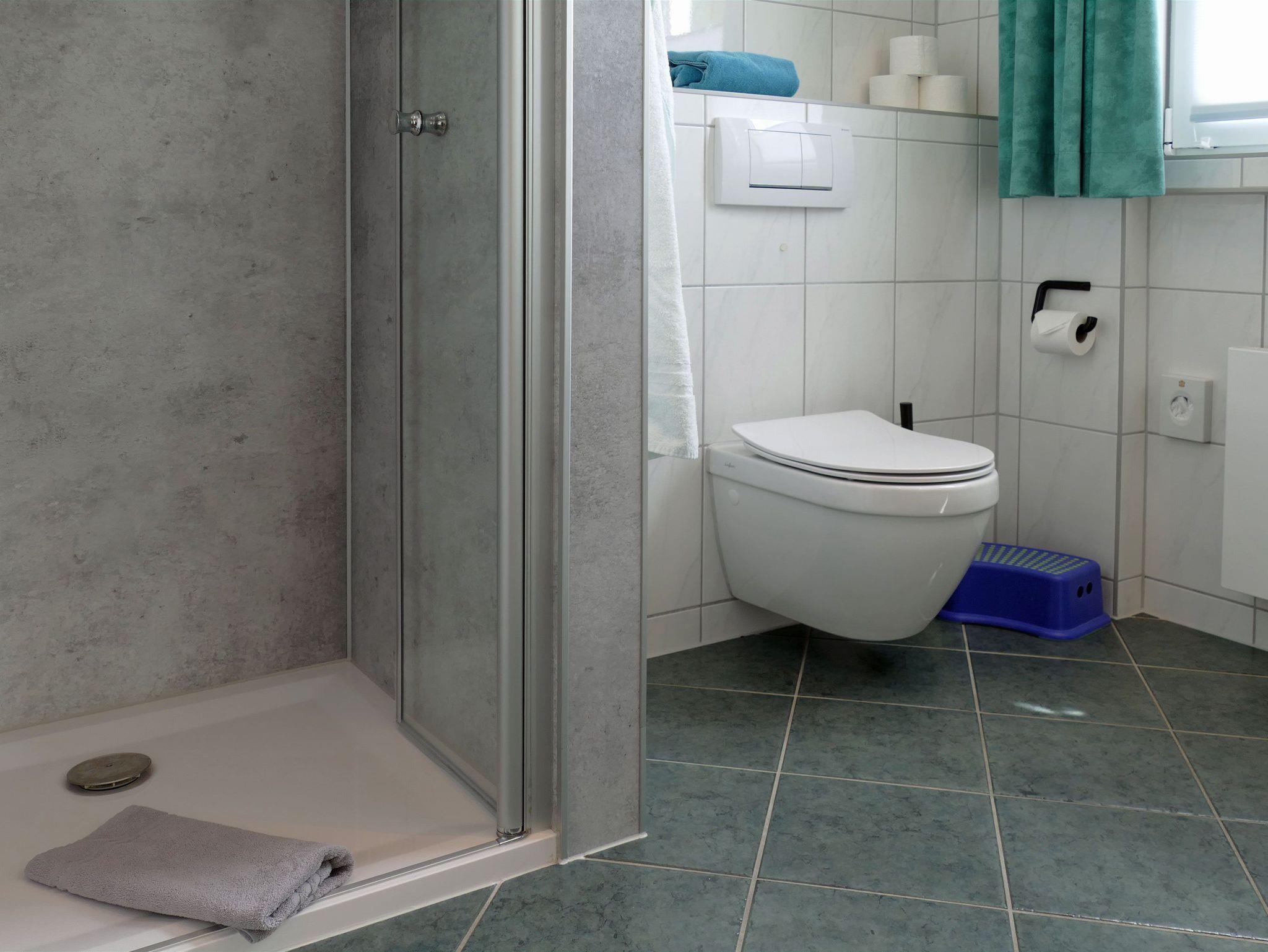 Im Bad befindet sich eine Dusche, ein Waschtisch und ein WC.