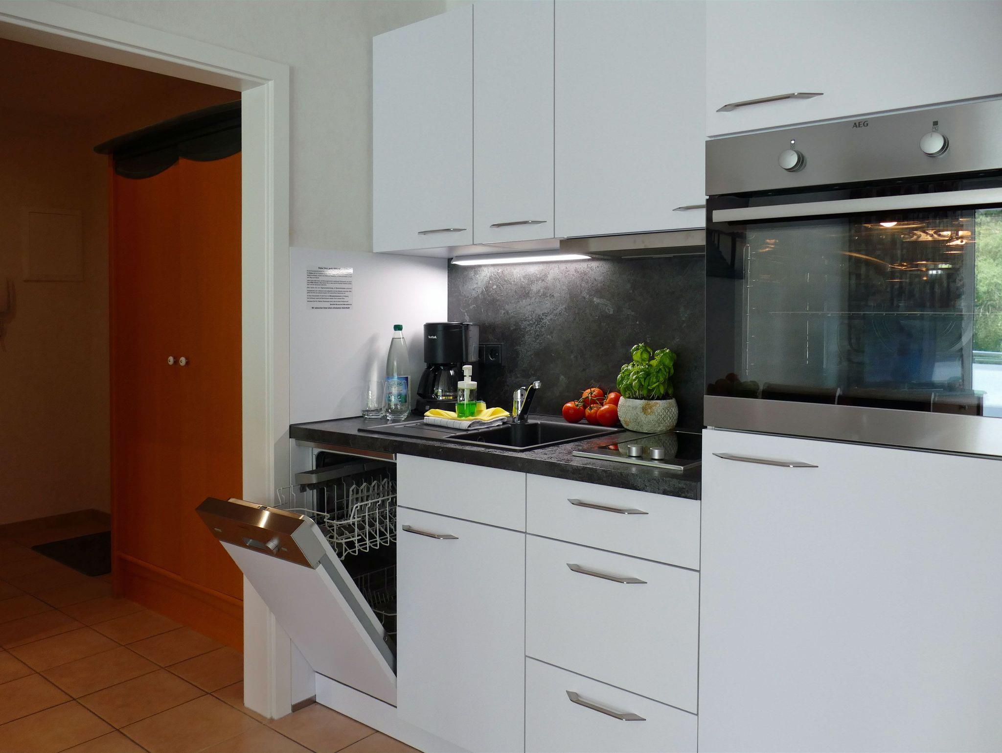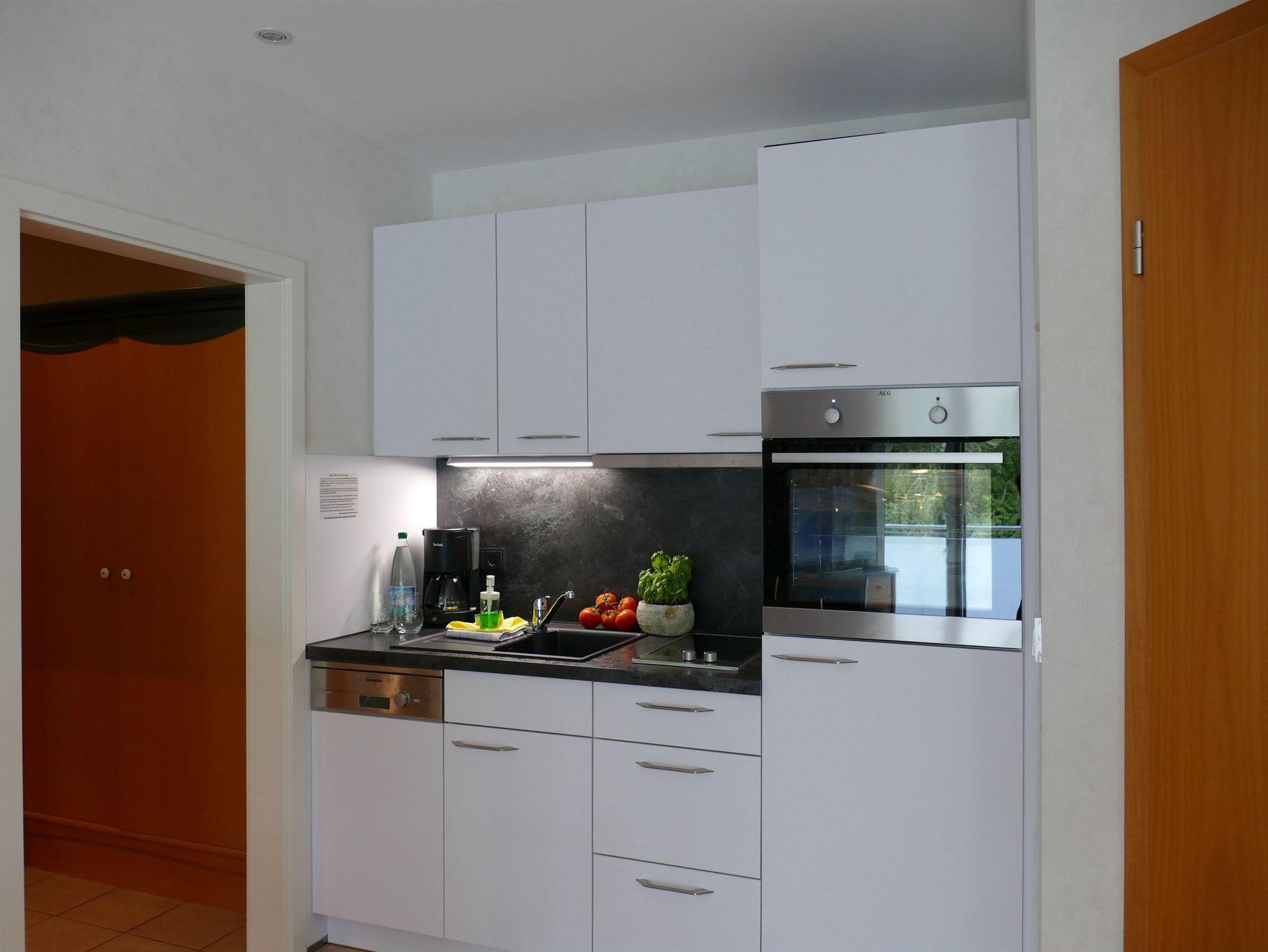 Die Küchenzeile ist bestens ausgestattet mit Zwei-Platten-Herd, Backofen, Kühlschrank, Kaffeemaschine und allem, was Sie für die Zubereitung kleiner Mahlzeiten benötigen.