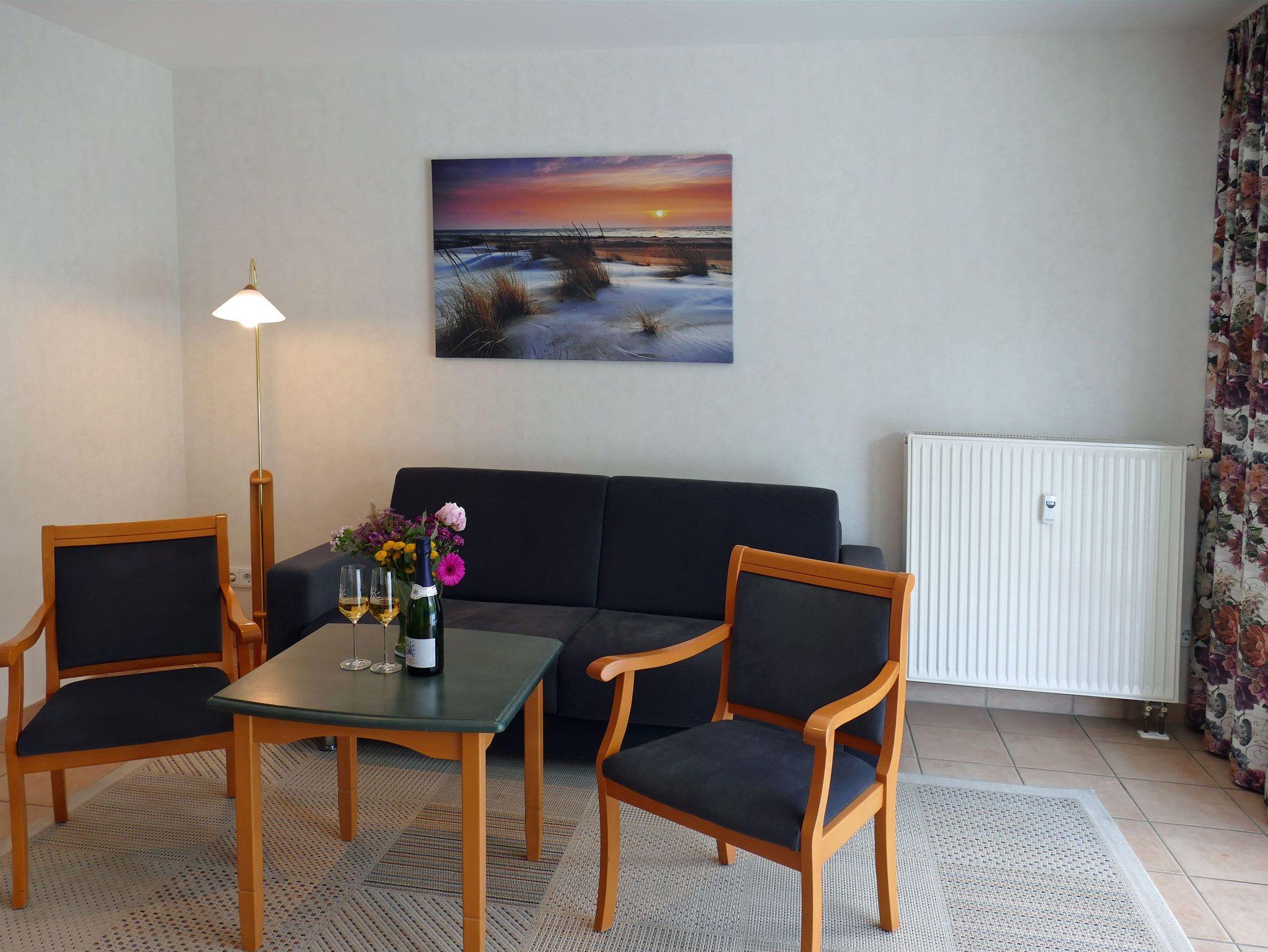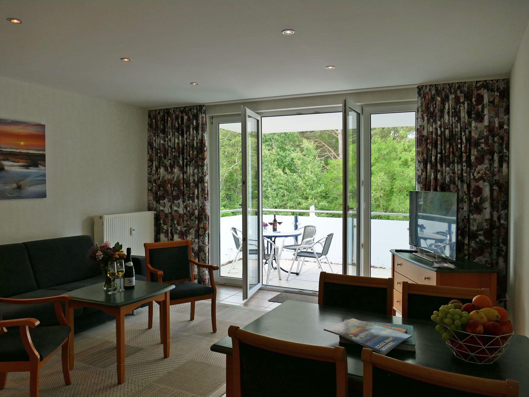 Im Wohnbereich erwartet Sie ein gemütliches Sofa mit Schlaffunktion, ein TV-Schrank mit HiFi-Anlage sowie ein Essplatz mit vier bequemen Stühlen. Die große Fensterfront nach Westen sorgt für viel Tageslicht und führt direkt auf den großzügigen Balkon, der mit Sitzmöbeln für vier Personen zum Entspannen und Genießen der Abendsonne einlädt.