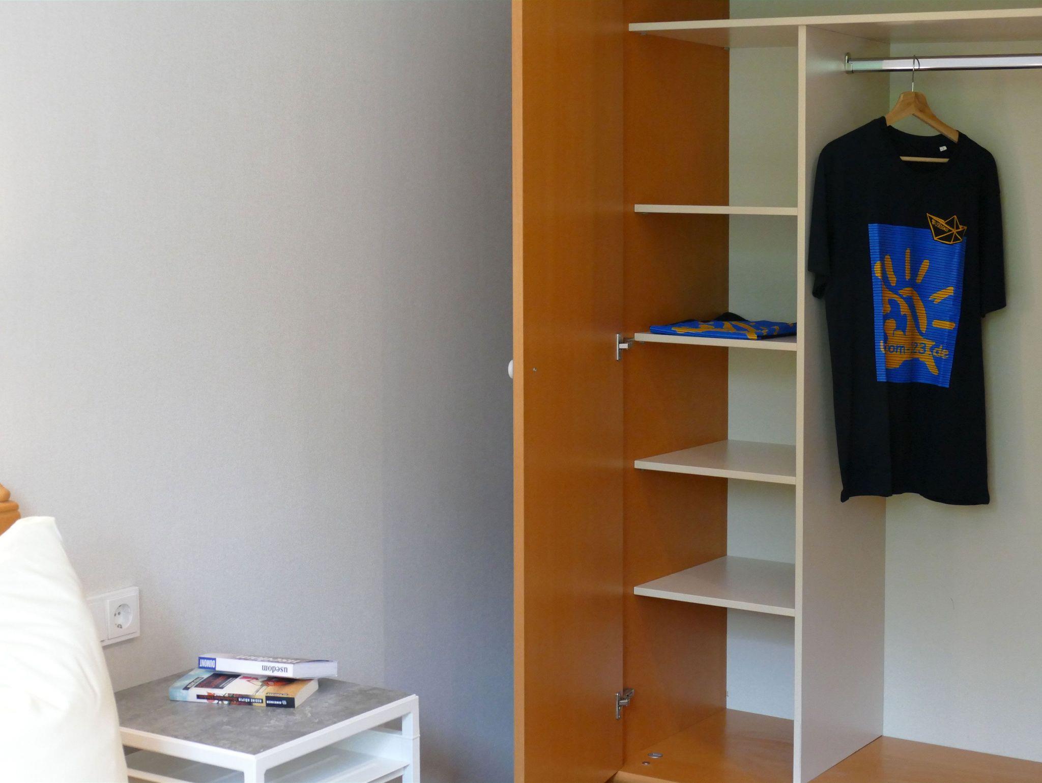 Im Schlafzimmer sorgt ein komfortables Doppelbett (2 x 90 x 200 cm) für erholsamen Schlaf. Ein großer Kleiderschrank bietet ausreichend Stauraum für Ihr Gepäck.