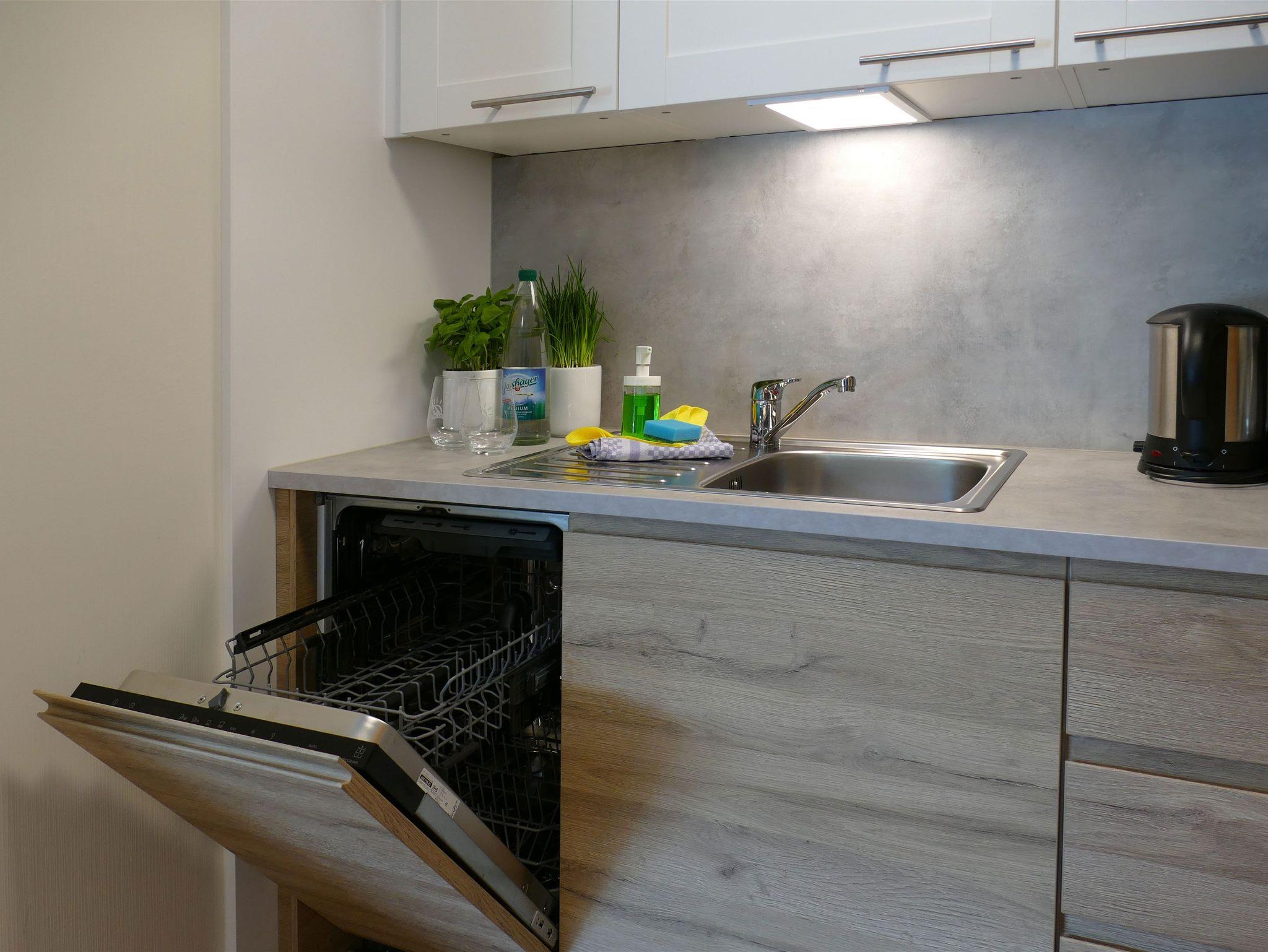 Küche mit 2-Platten-Herd, Geschirrspüler, Kühlschrank, Kaffeemaschine, Wasserkocher, Geschirr u. Besteck u.v.m.