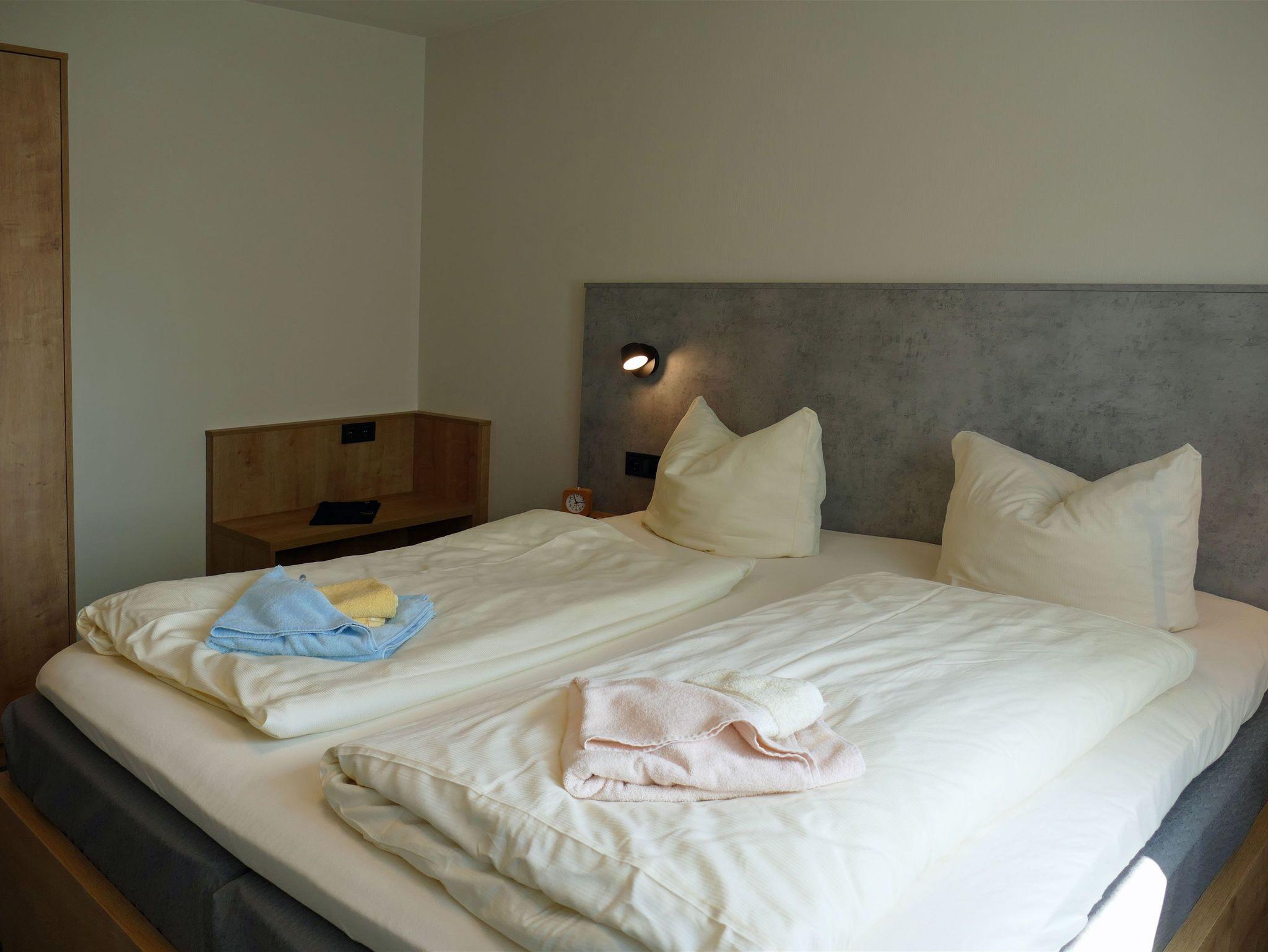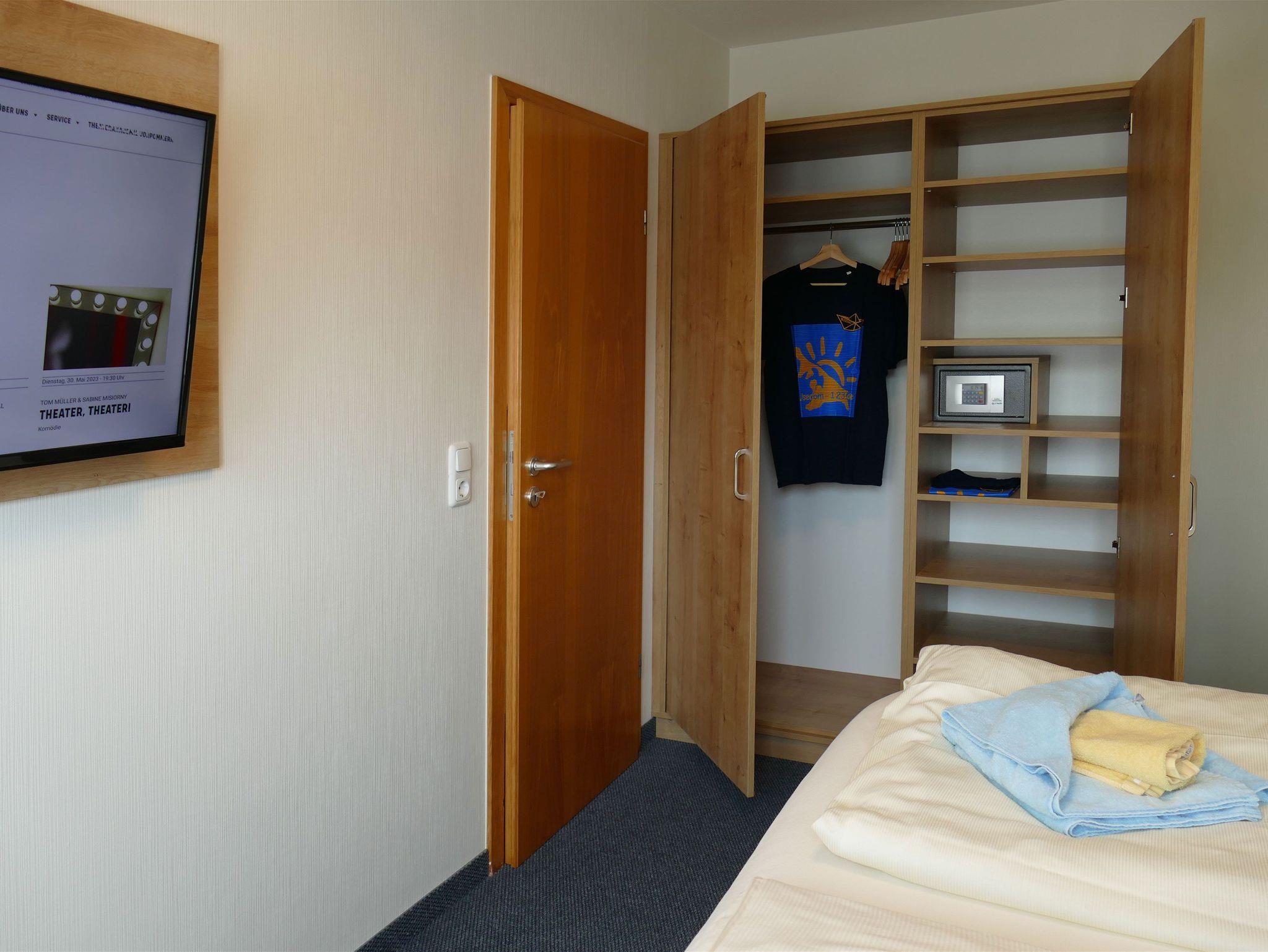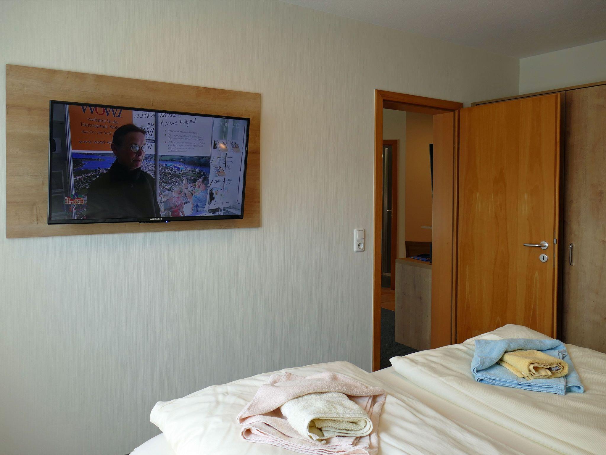 1 Schlafzimmer mit 2 vollwertigen Betten (90/200), Kleiderschrank und einem zusätzlichem Fernseher