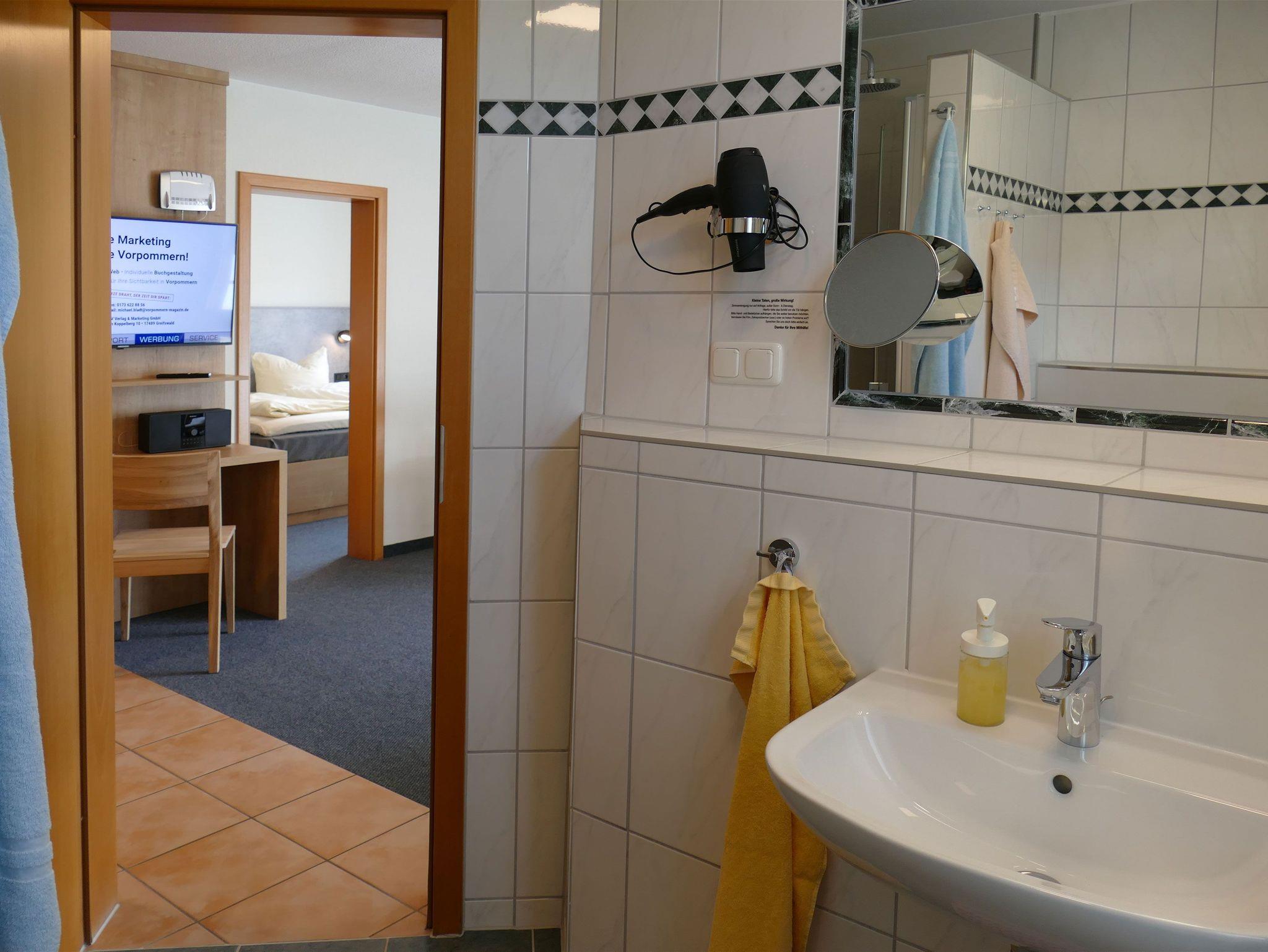 Das Badezimmer überzeugt mit einer großzügigen Regendusche, einem modernen Waschtisch und weiteren Annehmlichkeiten wie einem Haartrockner und hochwertigem Duschgel. Für zusätzlichen Komfort stehen ein Badezimmerhocker und weitere praktische Details bereit.