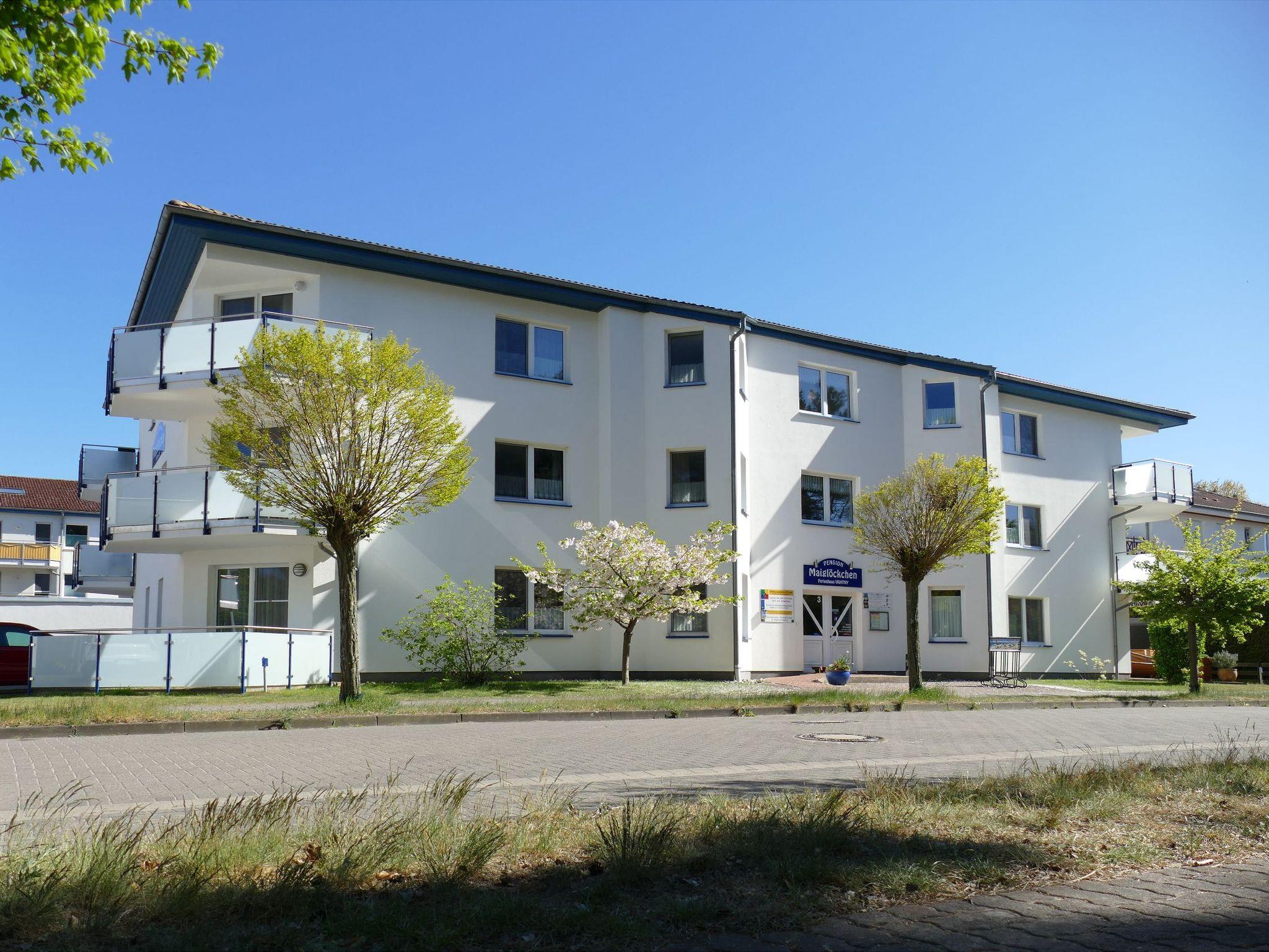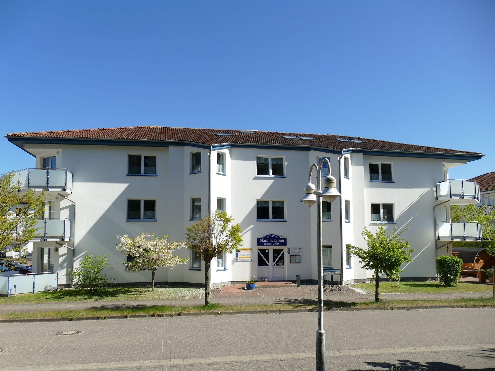Die Pension Maiglöckchen befindet sich in ruhiger Lage direkt am Waldrand im Ostseebad Karlshagen und zugleich nur wenige Gehminuten vom feinsandigen Ostseestrand entfernt. Das im Jahr 1999 erbaute Haus verbindet naturnahe Erholung mit einer attraktiven Lage und verfügt über 20 modern ausgestattete Ferienwohnungen auf drei Etagen mit Wohnflächen von etwa 15 m² bis 50 m².