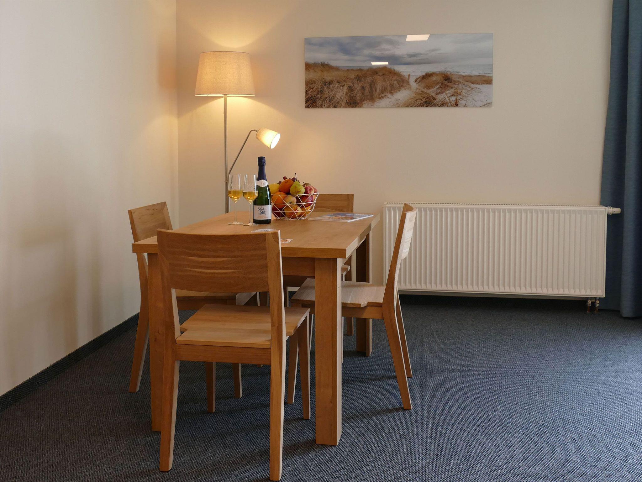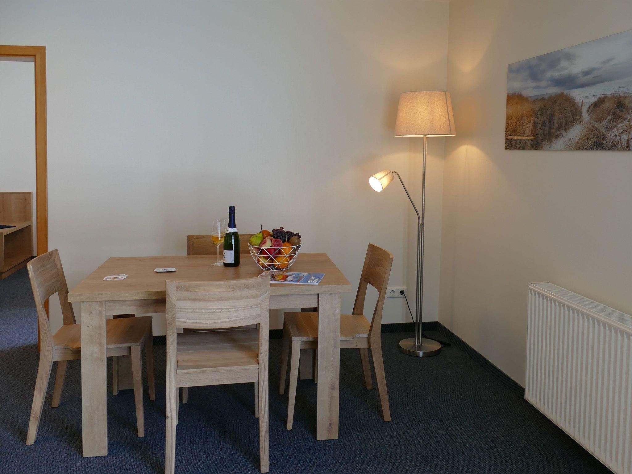 Der Wohnbereich ist einladend gestaltet und mit einem Flachbildfernseher, einer HiFi-Anlage, einer gemütlichen Sofaecke (inklusive Schlaffunktion) sowie einem Essplatz für bis zu vier Personen ausgestattet. Direkt angrenzend befindet sich die funktionale Küchenzeile mit Kühlschrank, Herdplatten und Geschirrspüler. Vom Wohnbereich gelangen Sie auf den Balkon oder die Terrasse, die mit Sitzgelegenheiten zum Entspannen einladen.
