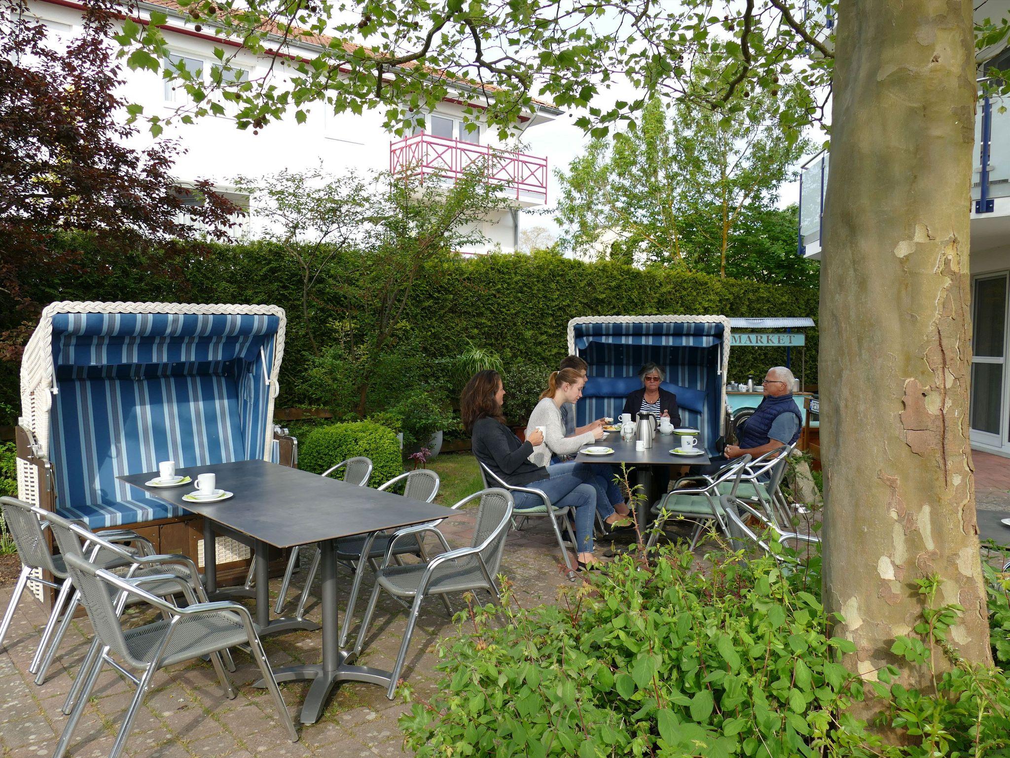Unser gepflegter Außenbereich eignet sich besonders für Gäste, deren Ferienwohnung über keinen eigenen Balkon oder keine eigene Terrasse verfügt.