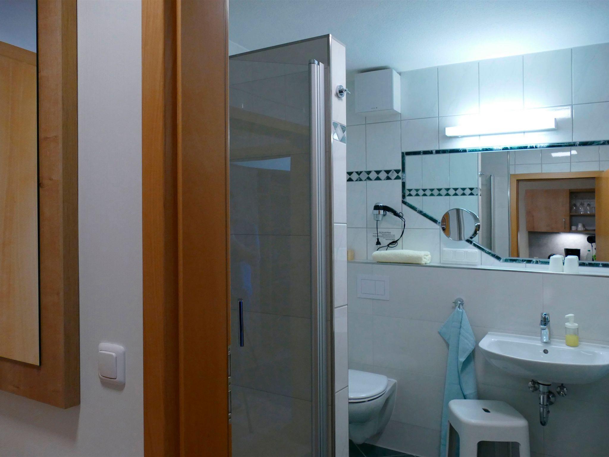 Das moderne Badezimmer ist mit einer großzügigen Regen-Shower-Dusche, einem eleganten Waschtisch und einem WC ausgestattet. Ein Haartrockner, ein Badezimmerhocker und hochwertiges Duschgel ergänzen die Ausstattung und sorgen dafür, dass Sie sich vom ersten Moment an wohlfühlen.