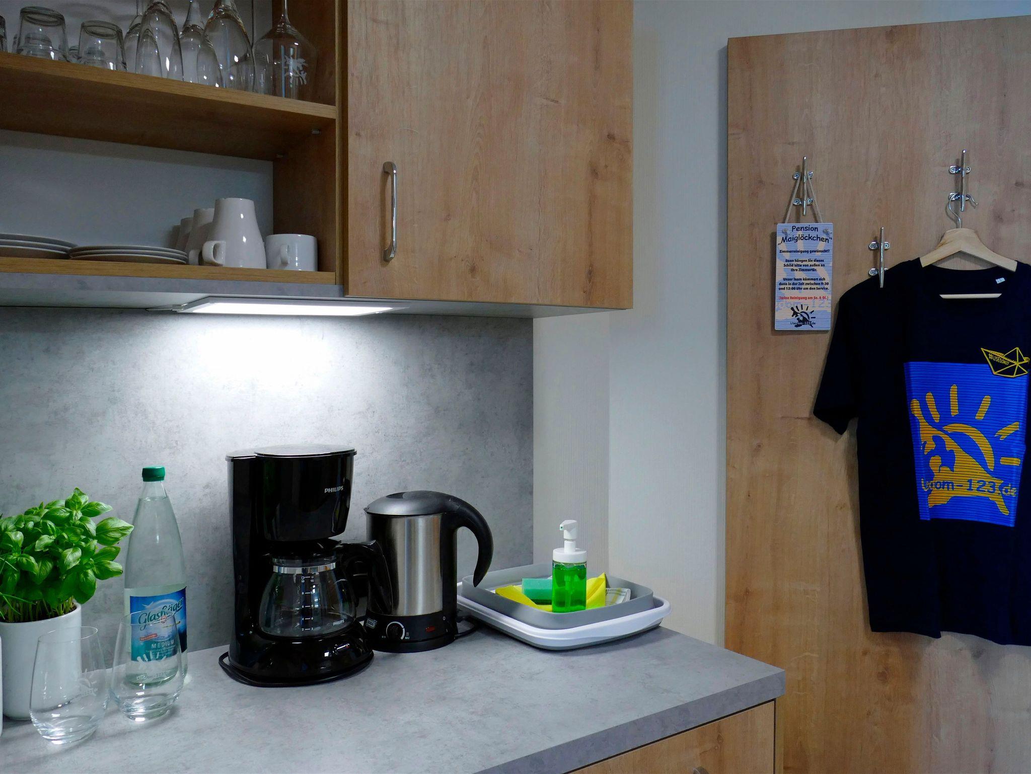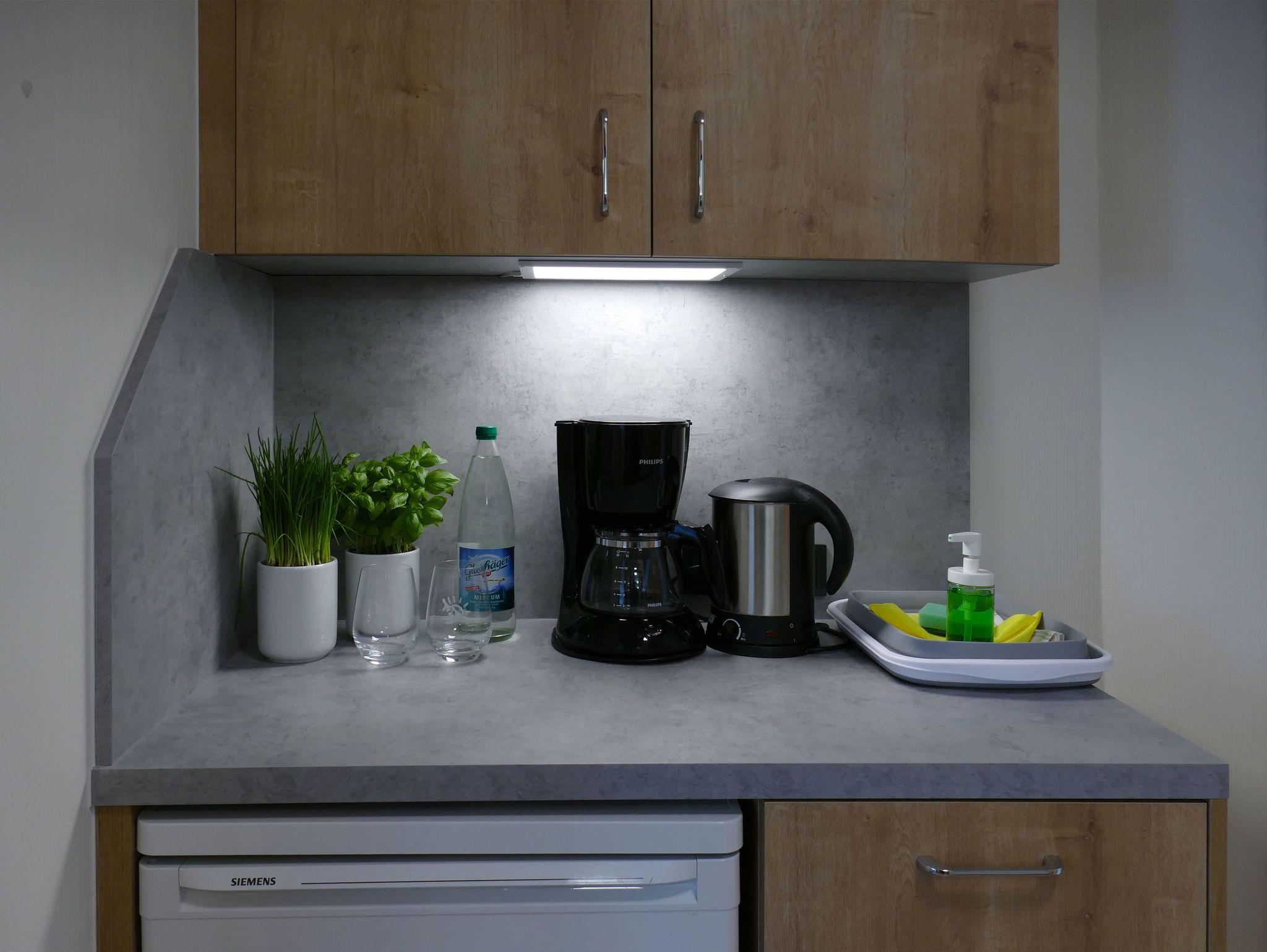 • Küchenblock mit Kühlschrank, Kaffeemaschine, Wasserkocher, Geschirr und Besteck u.v.m.; keine Kochmöglichkeit