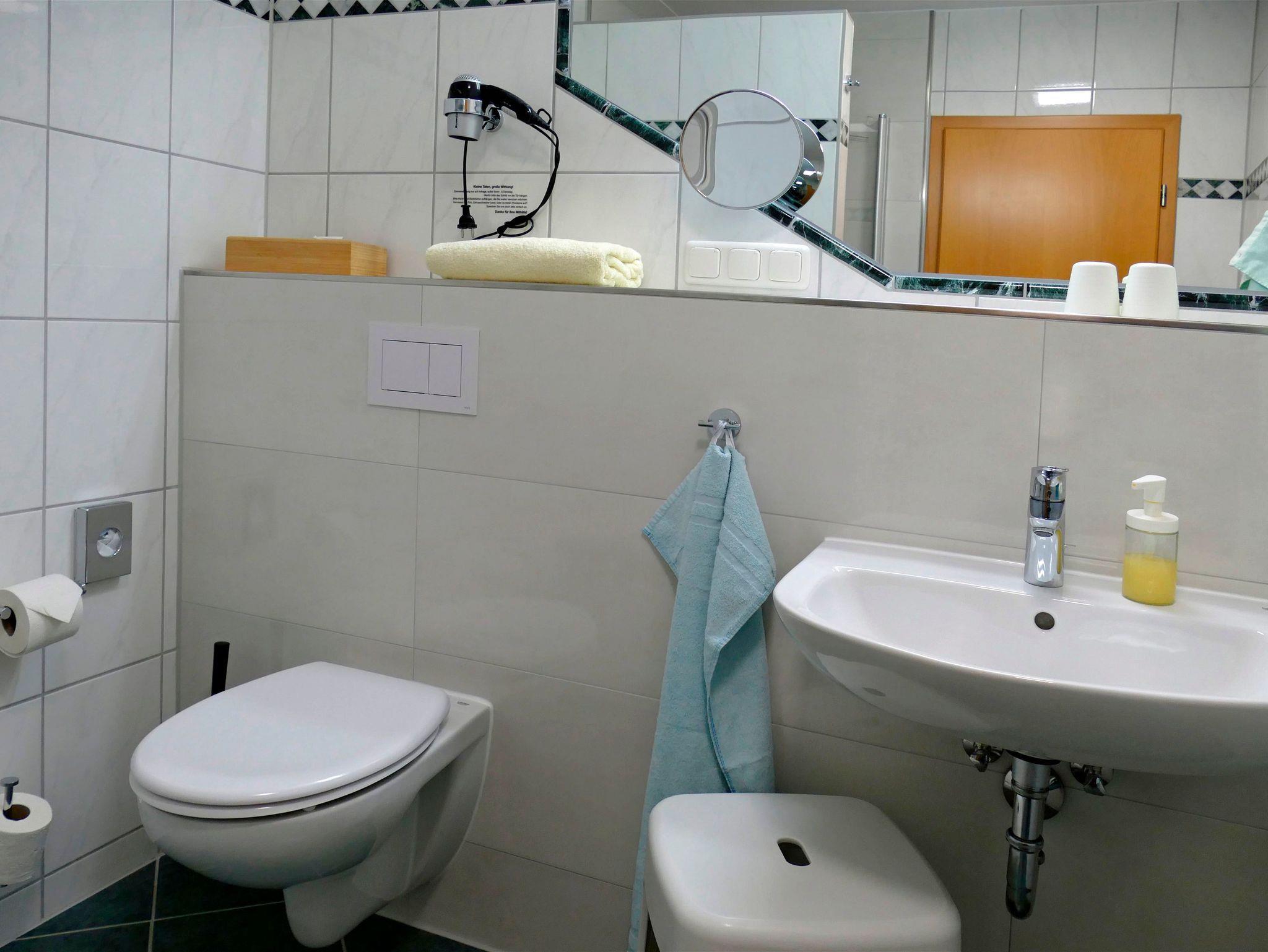 • Bad mit Dusche, Waschtisch und WC