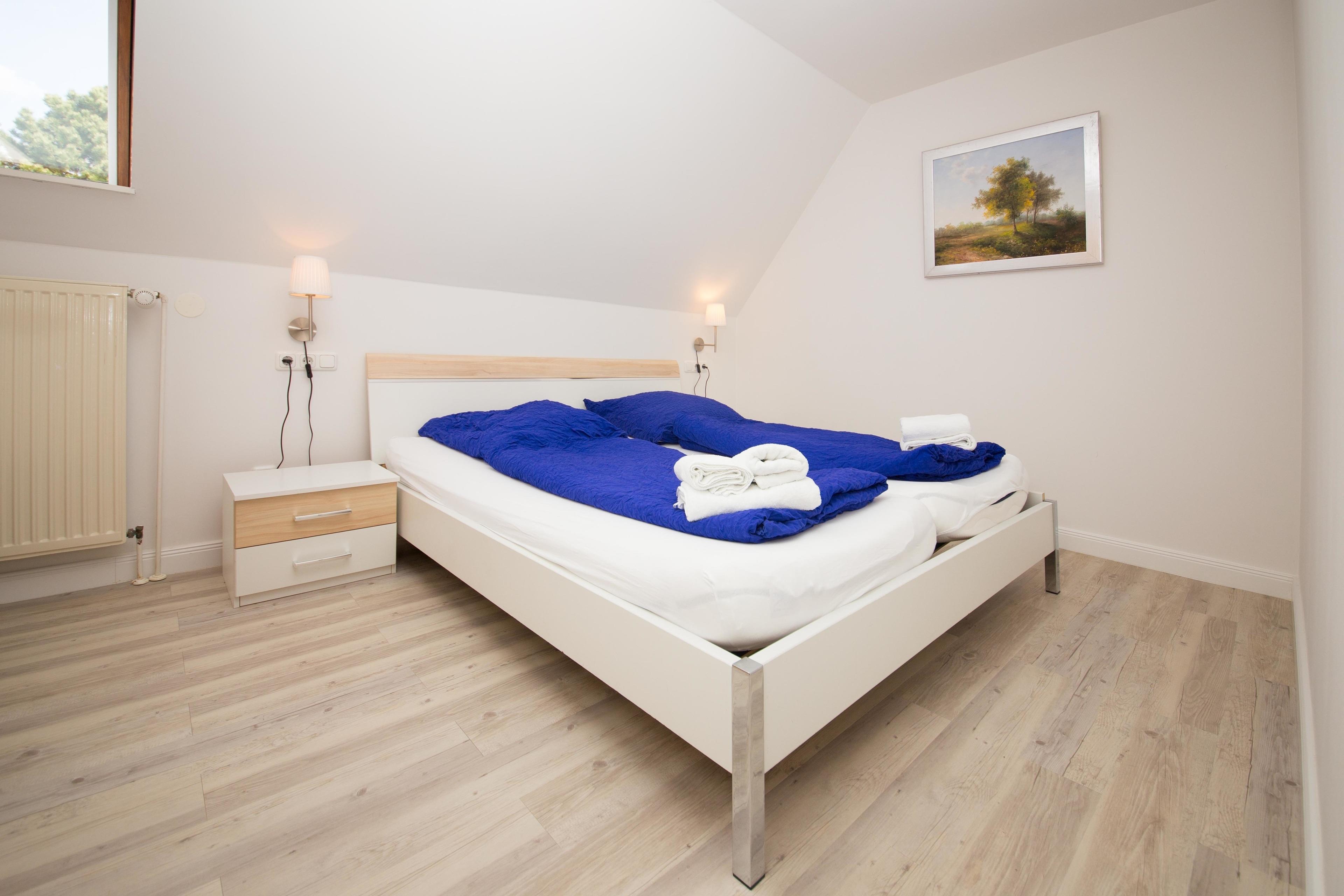 Ausstattung Schlafzimmer: 1 King Size Bett, 2 Nachtschränke mit Nachttischlampen, 1 3-türiger Kleiderschrank mit 6 Schubladen