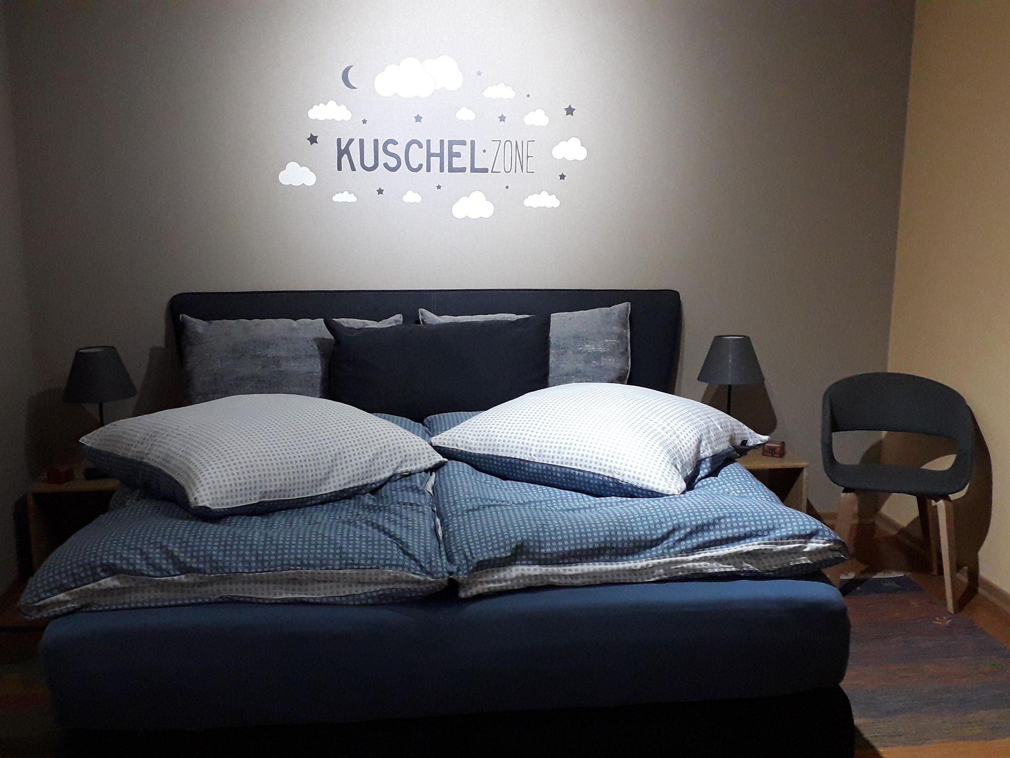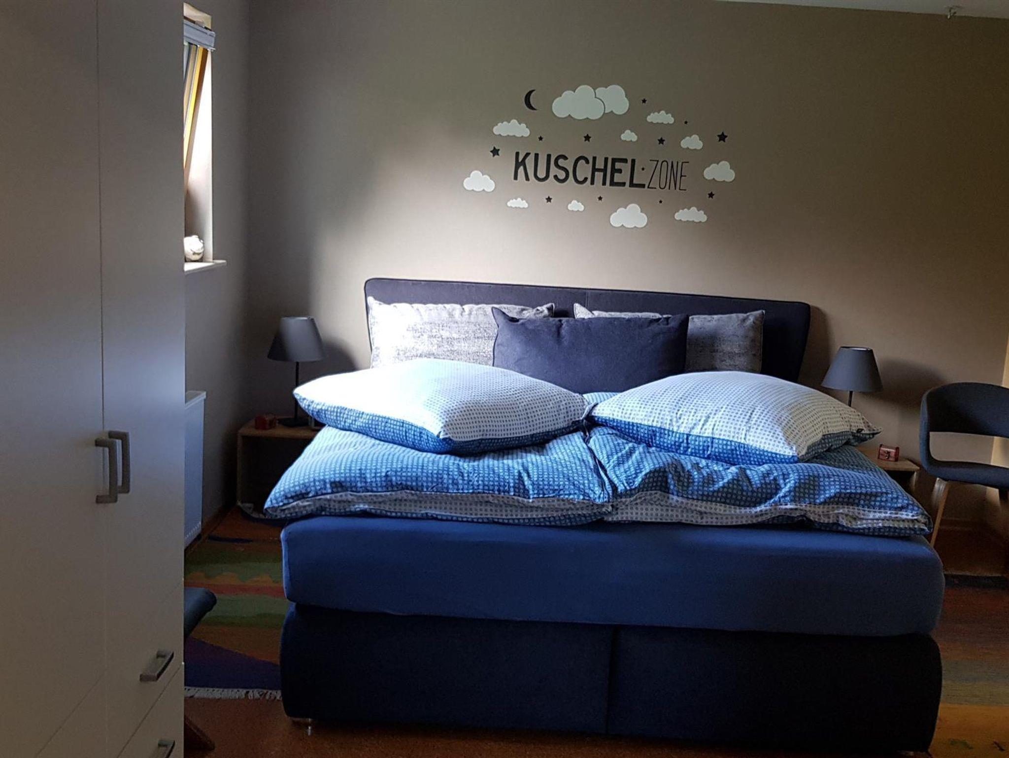 Sie schlafen in einem neuen Boxspringbett. Das Badezimmer hat eine große Dusche.