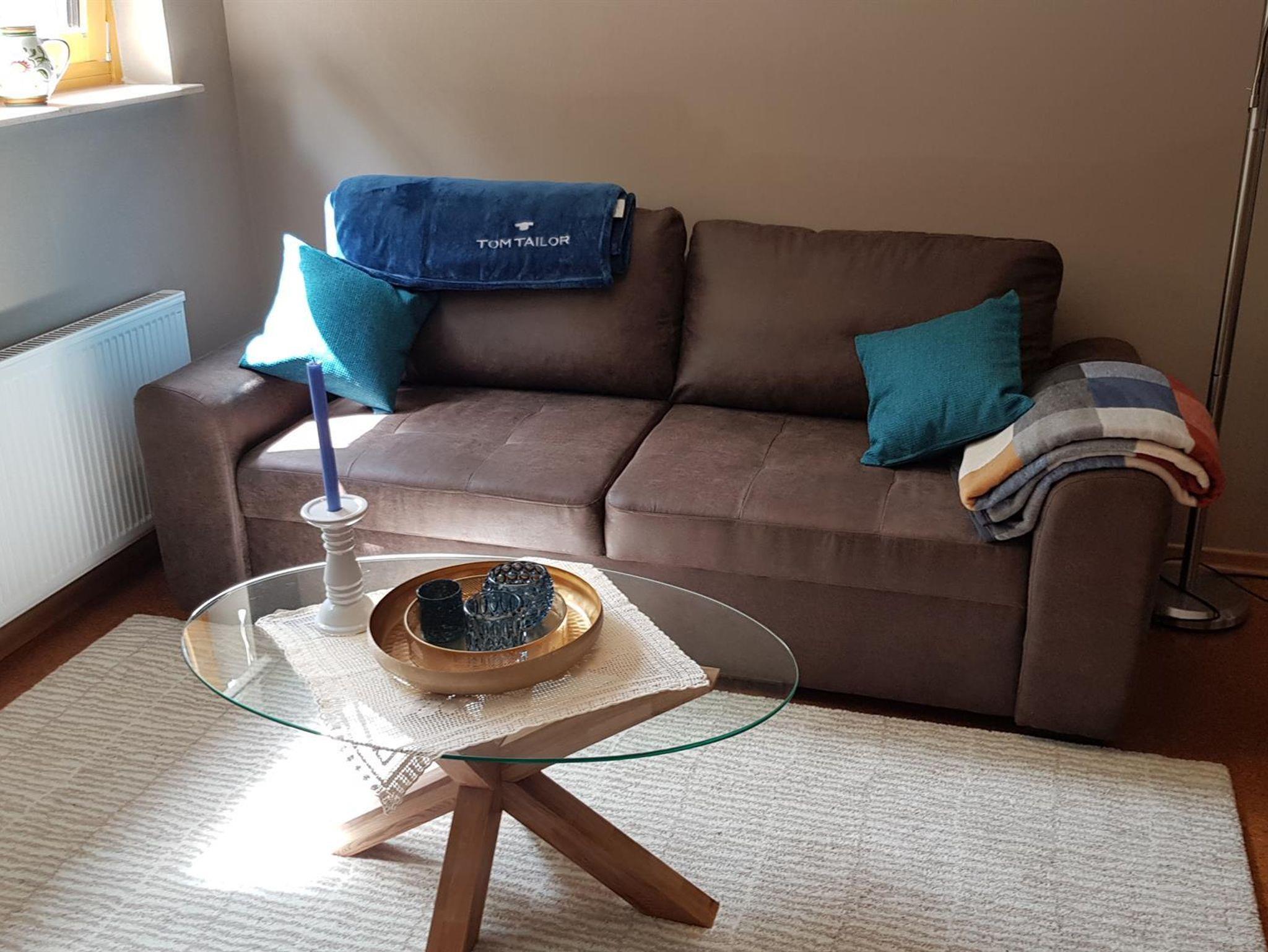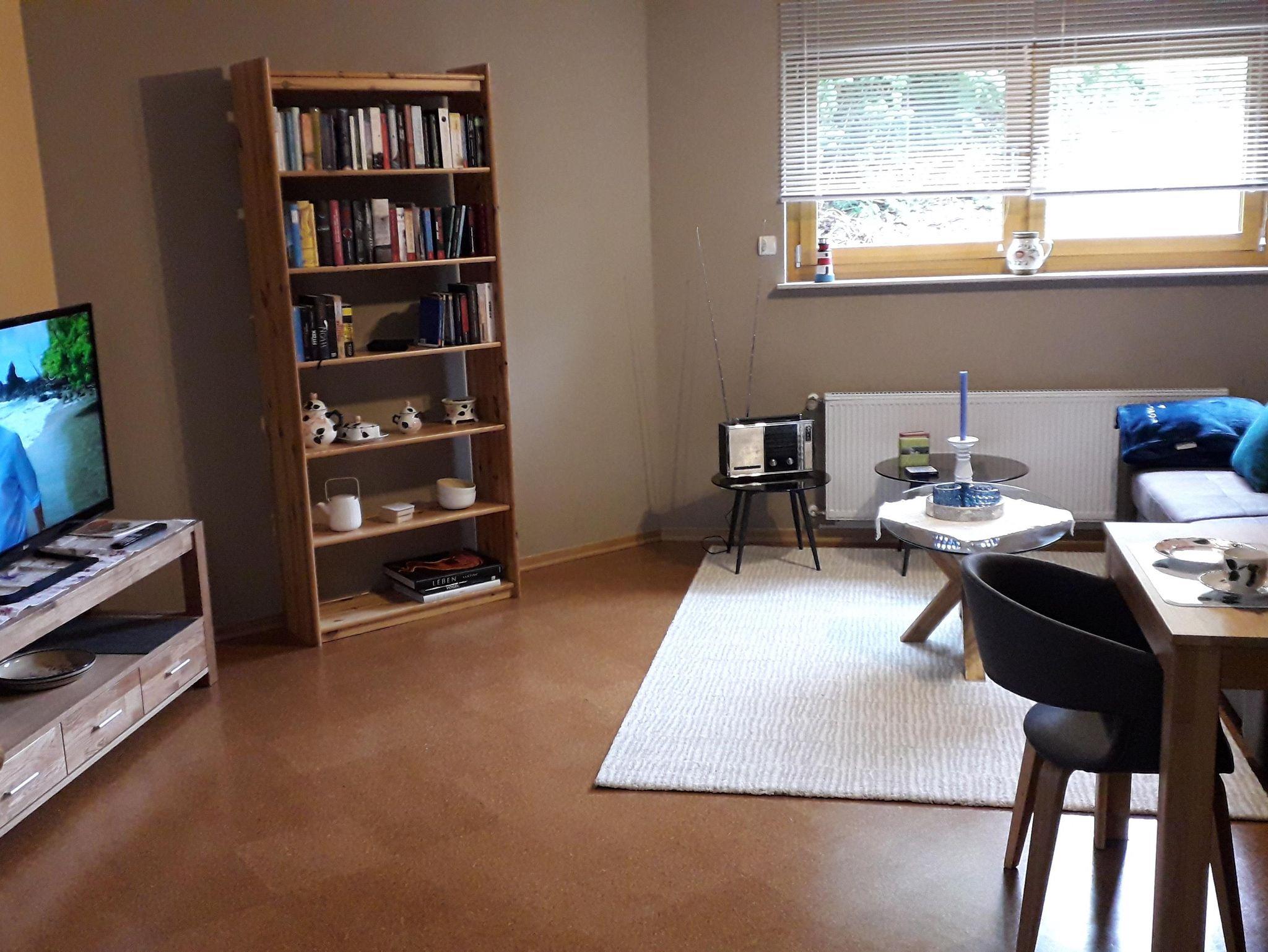 Im Wohnzimmer ist ein 49 Zoll Flachbildfernseher. Die Küche hat einen Elektroherd, eine Spülmaschine, Kühlschrank.