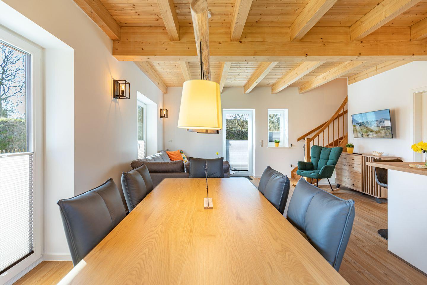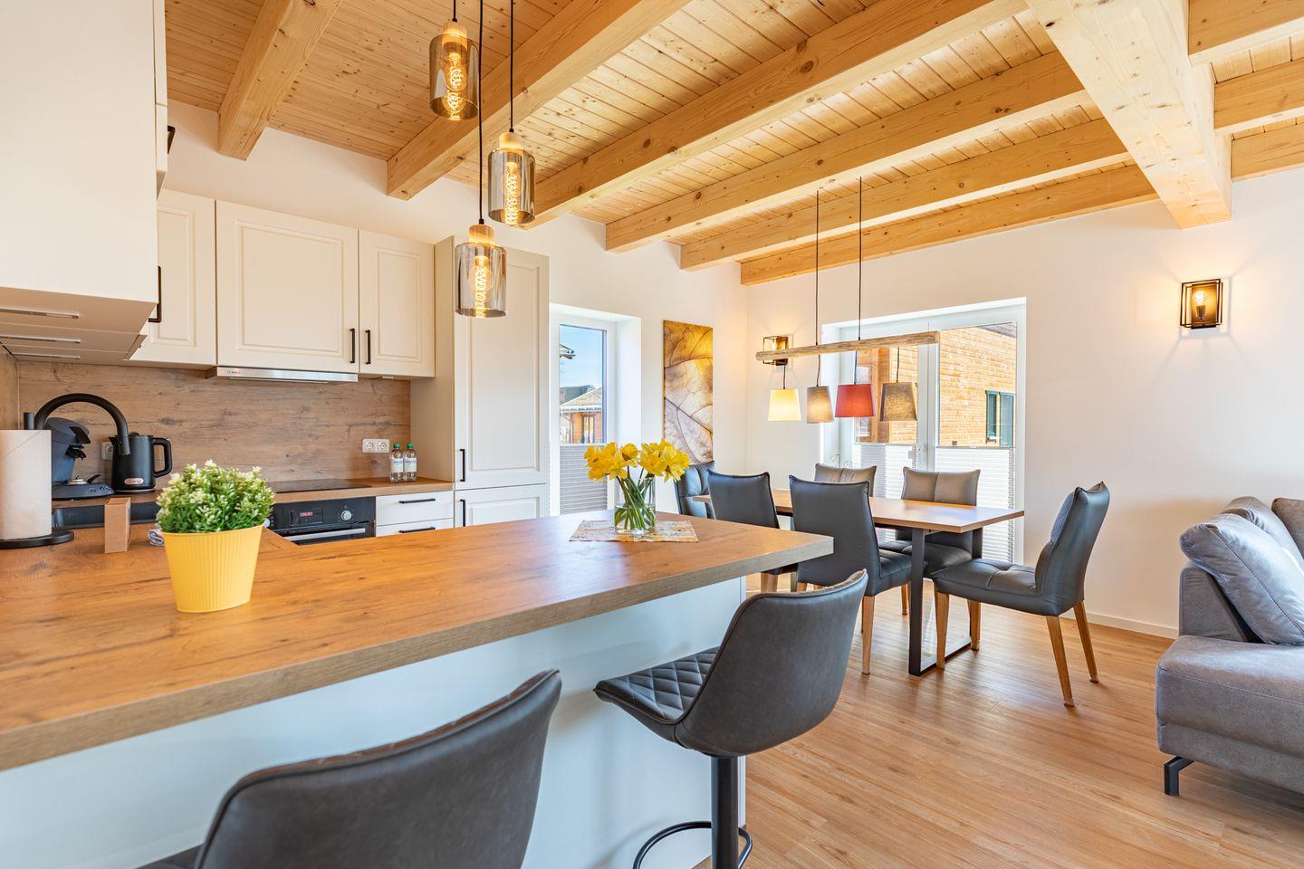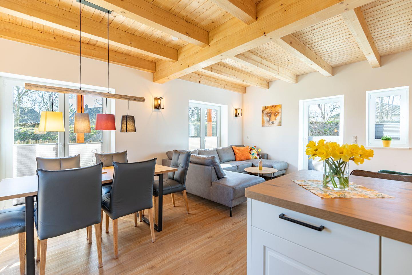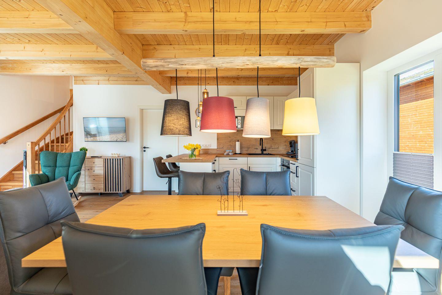 Die offene Küche ist voll ausgestattet mit Induktionskochfeld, Backofen, Mikrowelle, Spülmaschine, Senseo-Kaffeemaschine und Kühlschrank mit Gefrierfach – perfekt für gemeinsame Kochabende. Im gemütlichen Wohnbereich laden eine Sofaecke und ein SMART-Fernseher zum Verweilen ein. Kostenloses, schnelles WLAN hält Sie jederzeit online. Der angrenzende Essbereich bietet ausreichend Platz für alle Gäste.