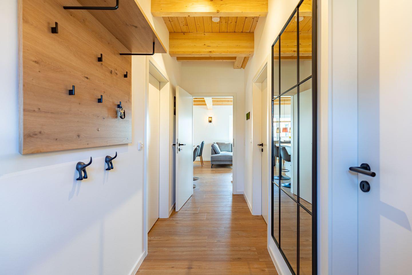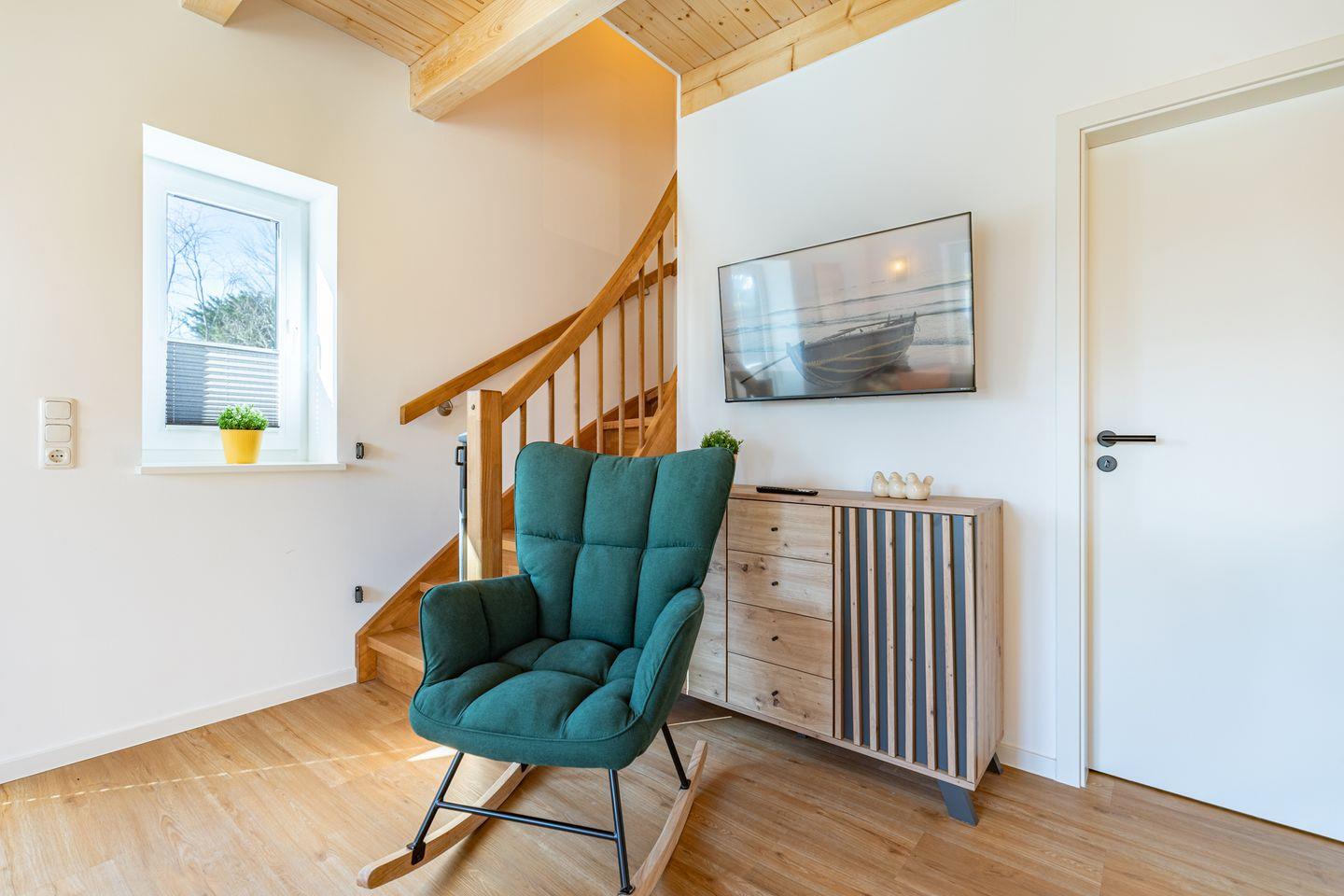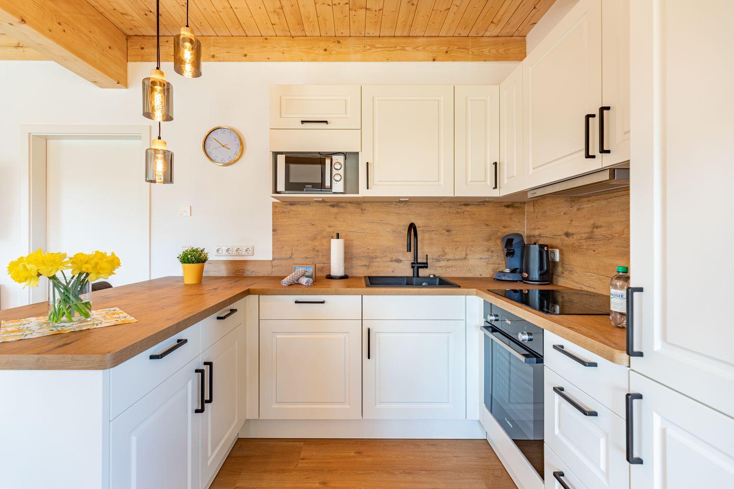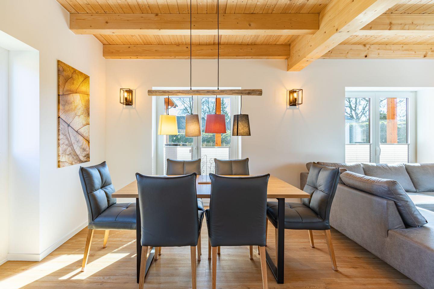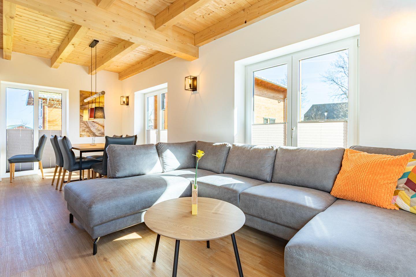 Die offene Küche ist voll ausgestattet mit Induktionskochfeld, Backofen, Mikrowelle, Spülmaschine, Senseo-Kaffeemaschine und Kühlschrank mit Gefrierfach – perfekt für gemeinsame Kochabende. Im gemütlichen Wohnbereich laden eine Sofaecke und ein SMART-Fernseher zum Verweilen ein. Kostenloses, schnelles WLAN hält Sie jederzeit online. Der angrenzende Essbereich bietet ausreichend Platz für alle Gäste.