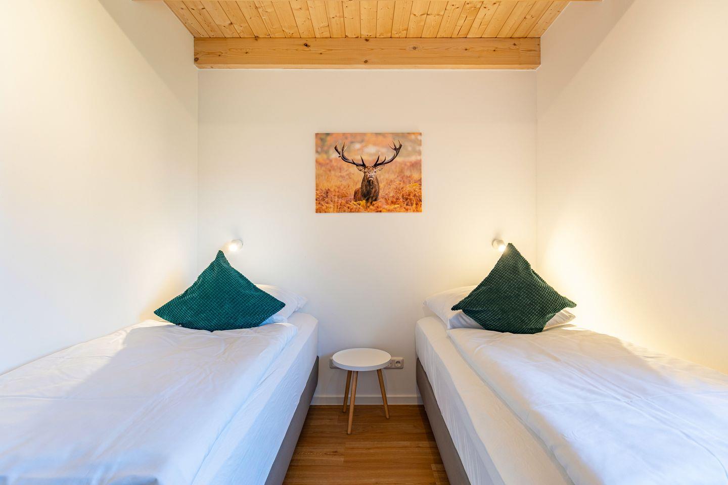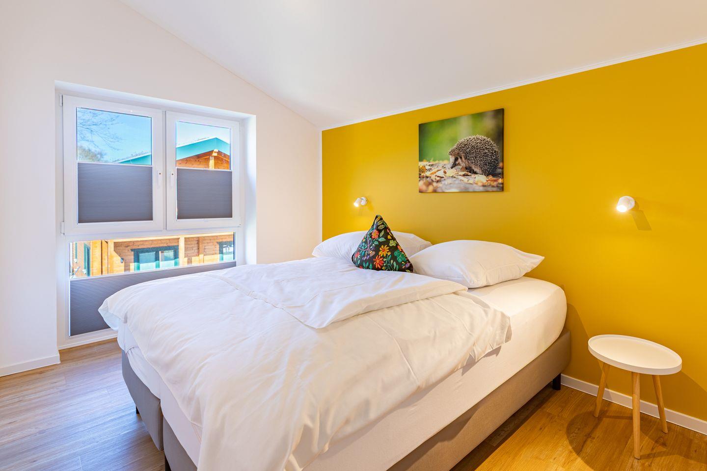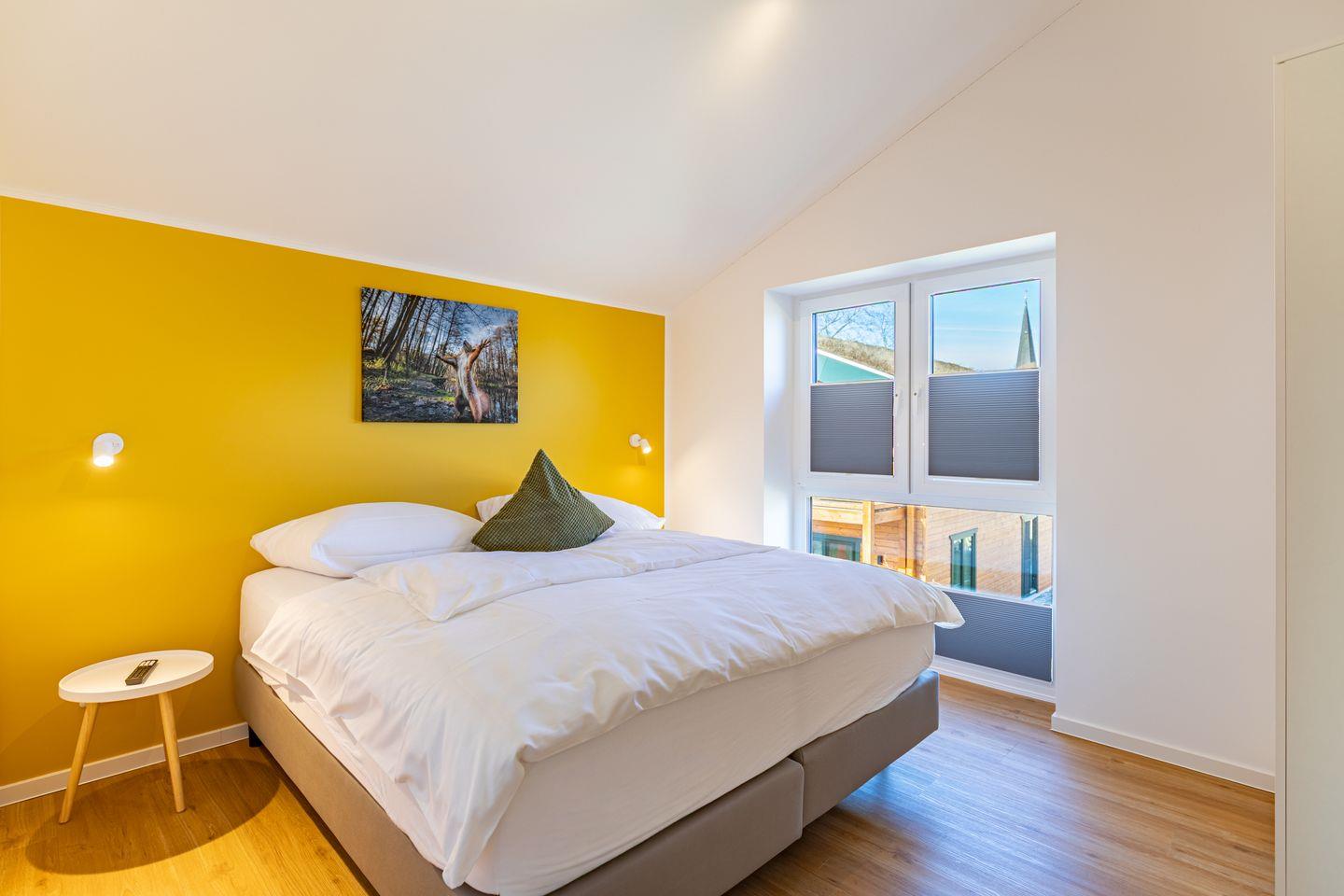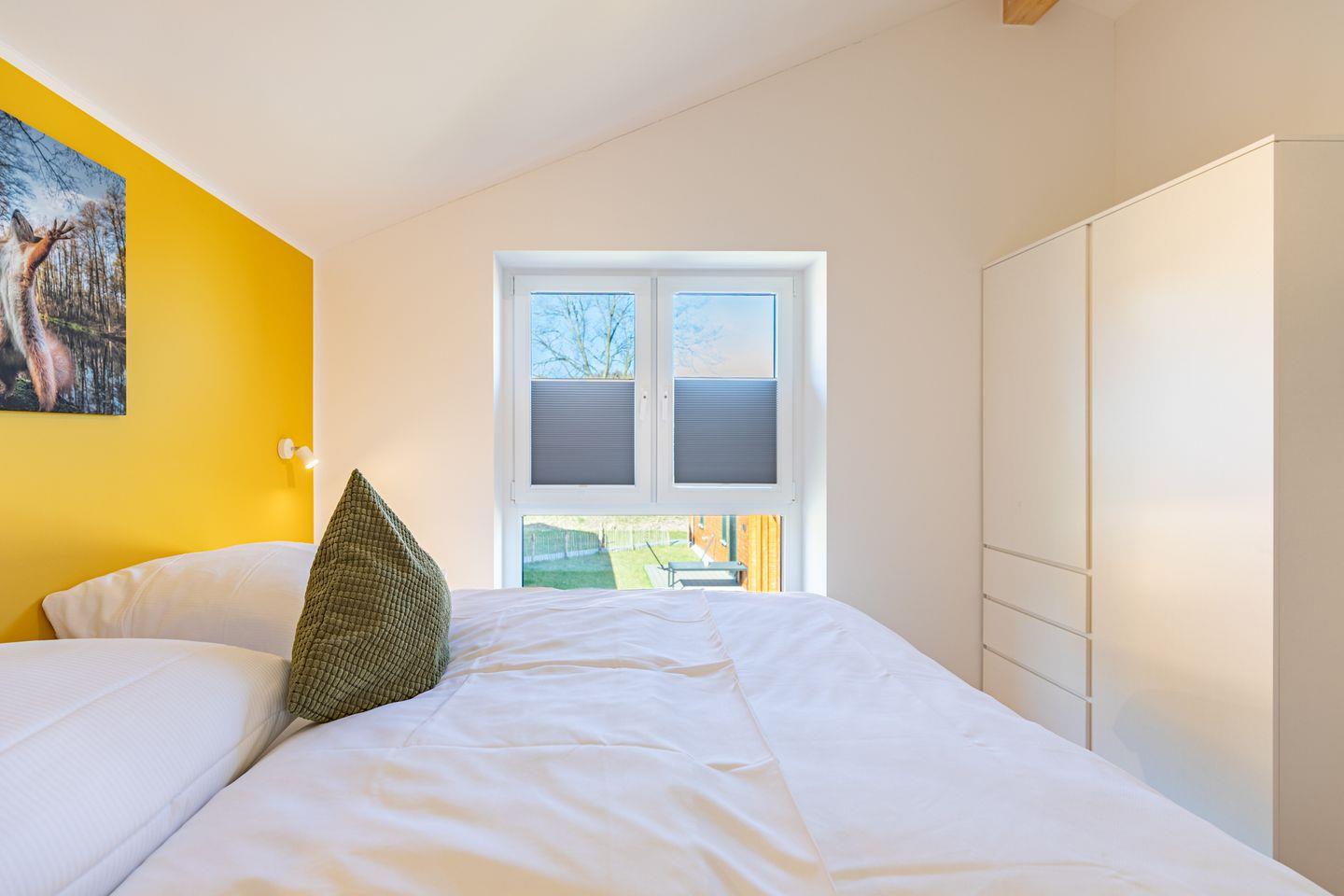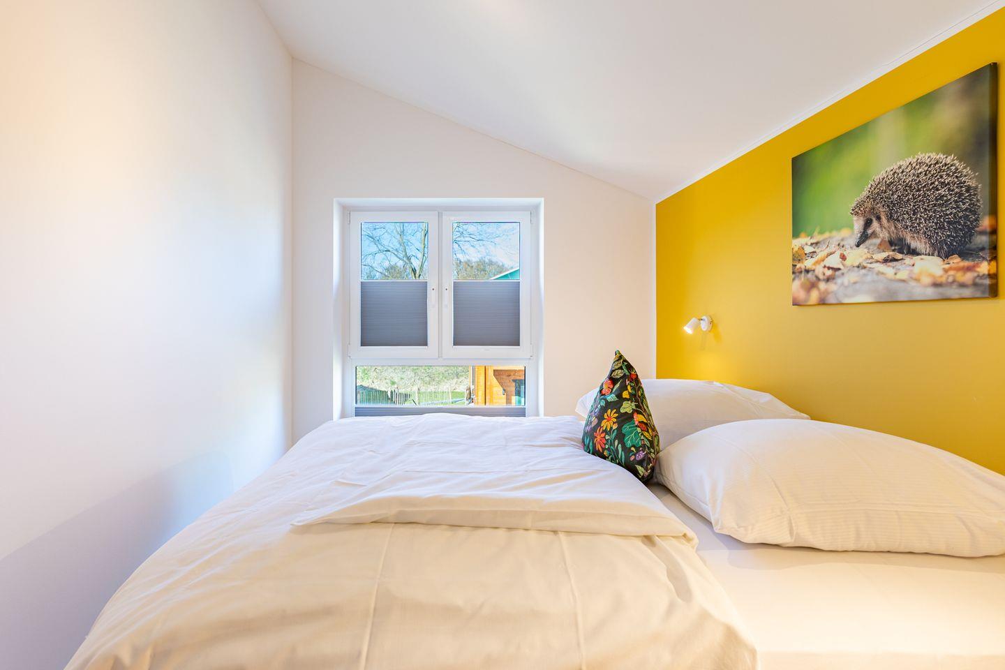 Das freistehende Ferienhaus bietet auf 105m² Platz für bis zu 6 Personen und ist ideal für Familien und Gruppen. Es verfügt über insgesamt 4 Zimmer, darunter 2 behagliche Schlafzimmer mit bequemen Boxspring-Doppelbetten (180x200) im Obergeschoss und Kleiderschränken. Ein drittes Schlafzimmer mit Kleiderschrank befindet sich im Erdgeschoss der Unterkunft, in dem zwei Einzelbetten zum Träumen einladen.
