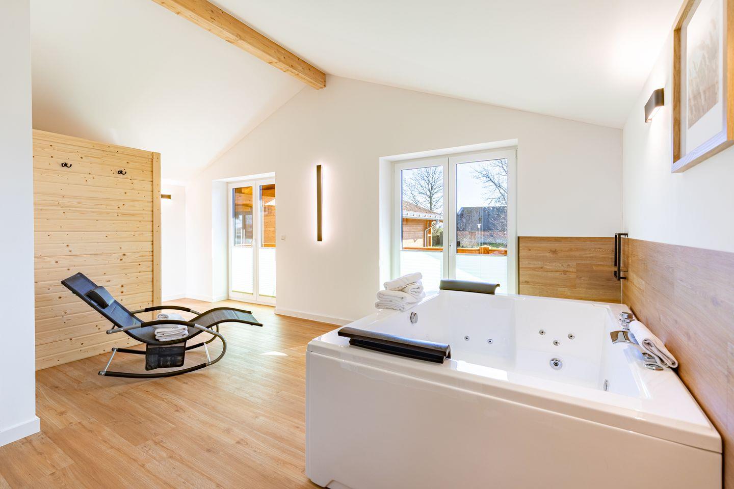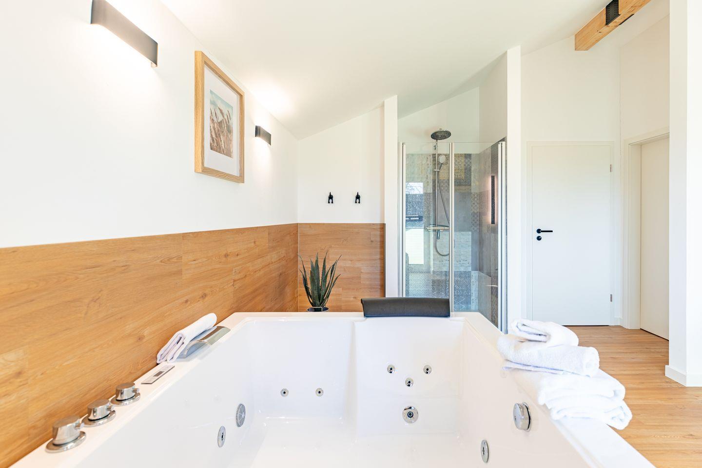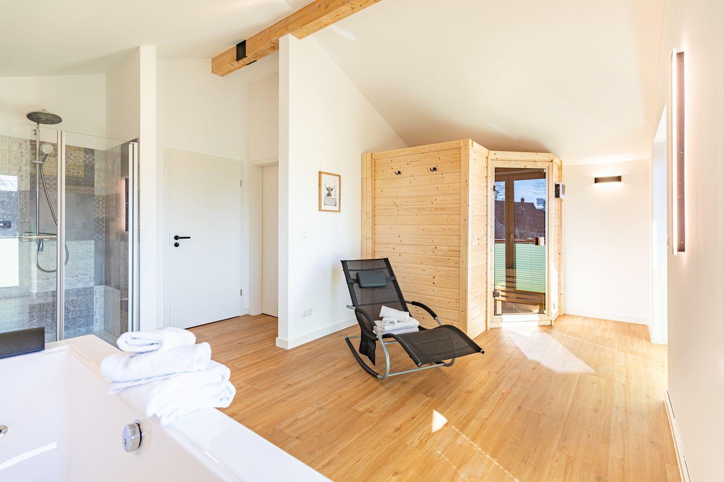 Ein modernes Badezimmer mit bodengleicher Dusche, WC sowie Sauna und einem Whirlpool sorgt für besonderen Komfort. Ein echtes Highlight ist der angrenzende Balkon mit wunderbarer Aussicht über das Katinger Watt!