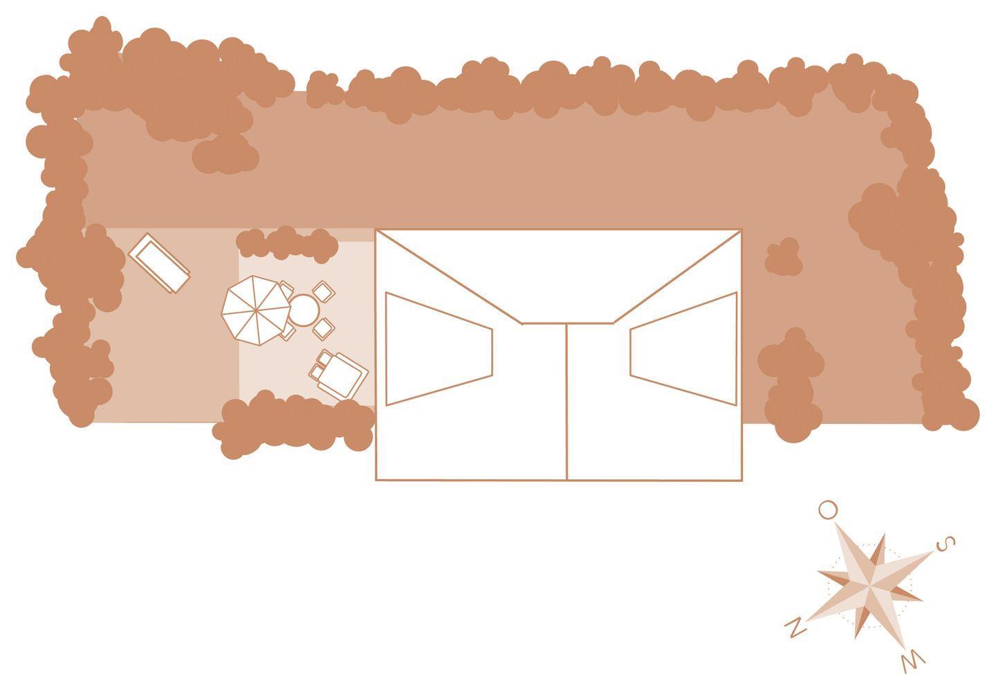Die nach Su¨den ausgerichtete Terrasse aus Naturstein ist mit Gartenmöbeln und einem Strandkorb ausgestattet. Sie öffnet den Wohnbereich zu den sonnigen Plätzen der großzu¨gigen 1.890 m² großen Gemeinschaftsgartenanlage, die den ganzen Tag u¨ber Sonne bietet.