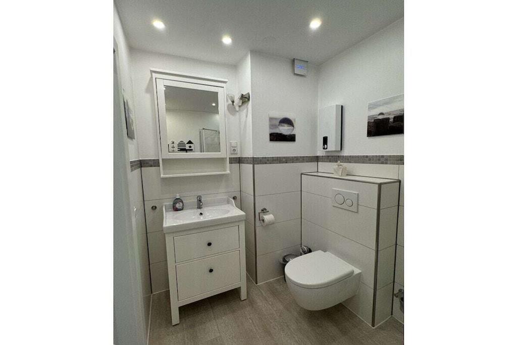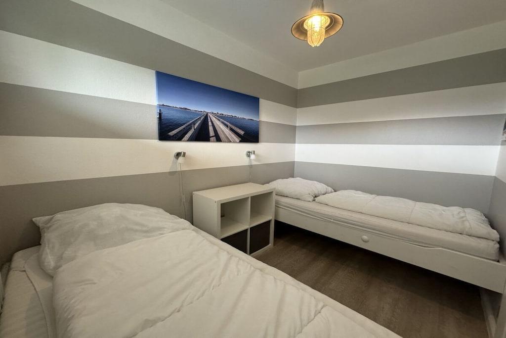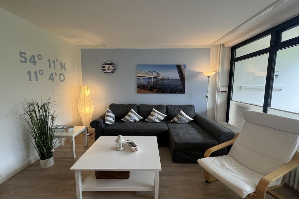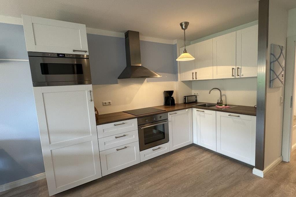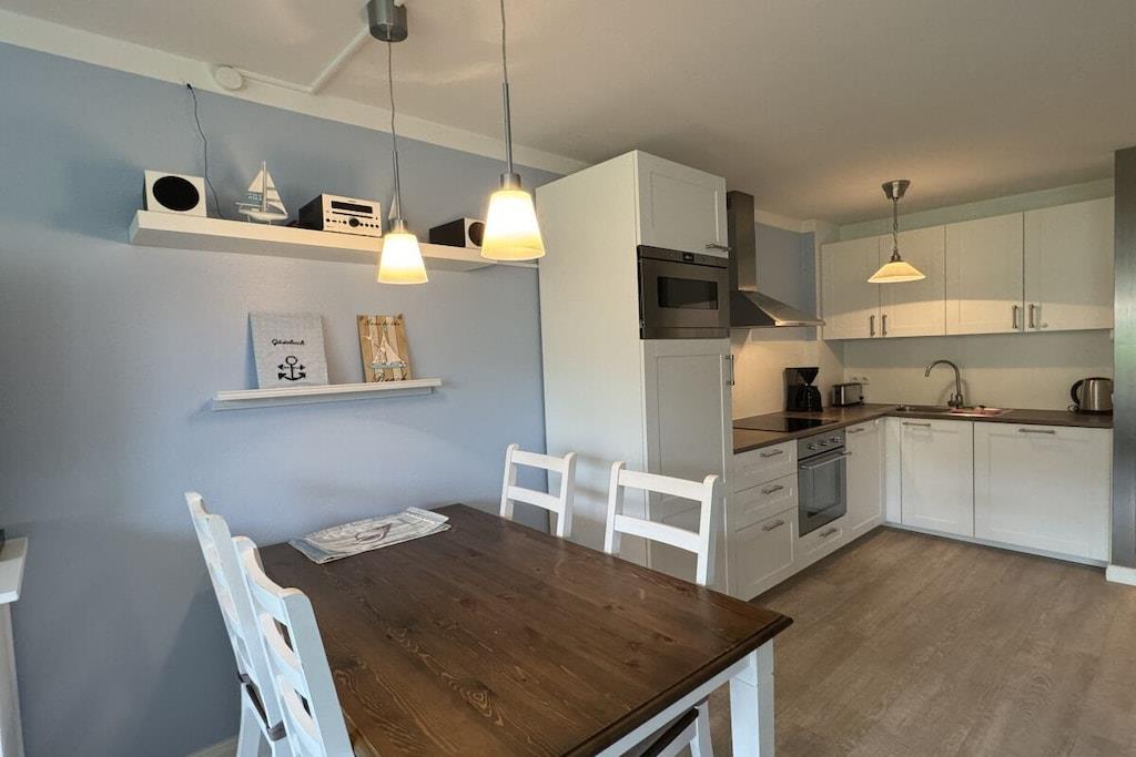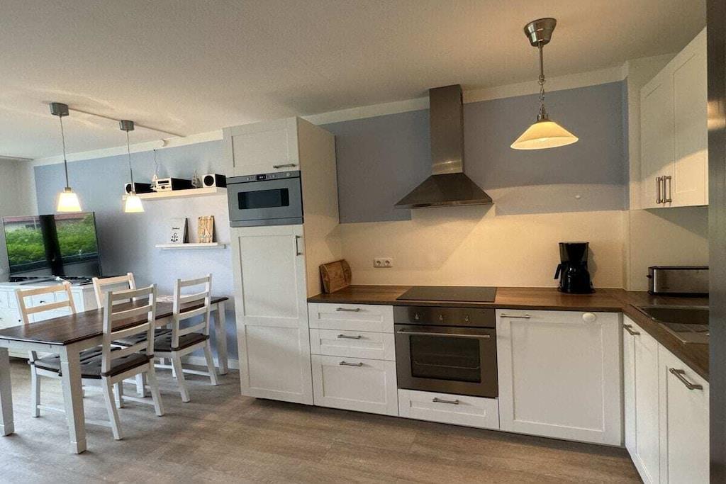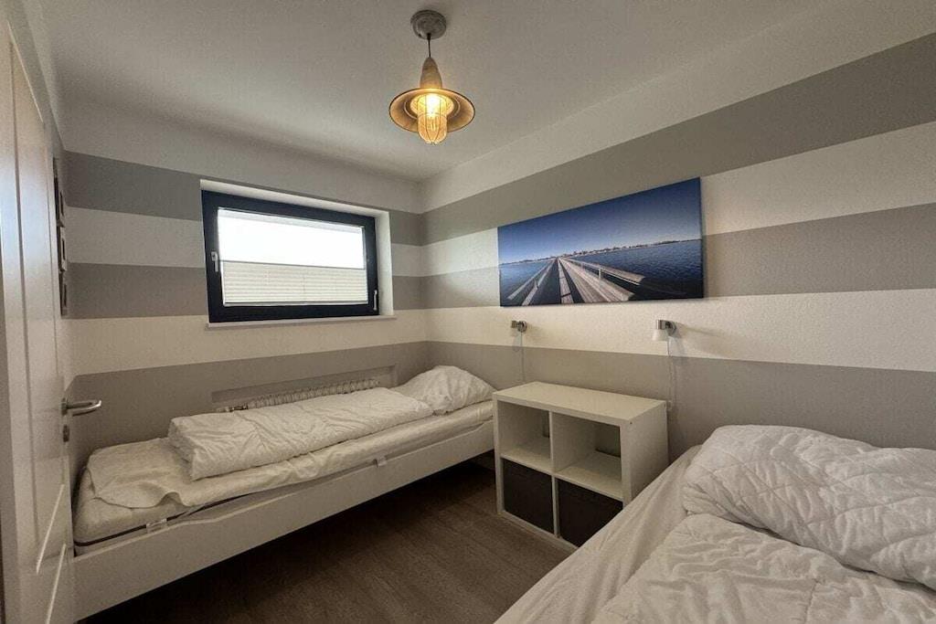 Welcome to our charming holiday apartment in Kellenhusen! With an area of 53 square meters and 1.5 rooms, our modernly equipped holiday apartment offers the ideal retreat for up to four people. The living room invites you to relax with a comfortable sofa and an impressive 55-inch TV. The adjoining dining area and the open kitchen offer everything you need for a relaxing holiday: a refrigerator with freezer compartment, a dishwasher, a stove with oven, a coffee machine, a kettle, a toaster and plenty of dishes. The sleeping area is divided by a curtain and offers a comfortable double bed (1.80 x 2.00 m) and a spacious wardrobe. The separate bedroom or children's room has two single beds (each 90 x 200 cm) as well as fly or mosquito protection and a pleated blind. The modern bathroom is equipped with a floor-to-ceiling shower, a toilet and a towel radiator. The apartment has a large south-west facing loggia with balcony furniture. A washing machine and dryer are available in the basement for a fee. The apartment also has its own parking space.