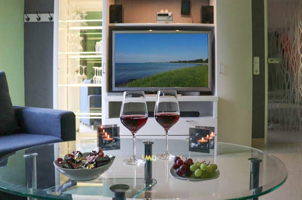 Im Wohnzimmer der Fewo finden Sie eine gemütliche Sofalandschaft (zum Doppelbett umfunktionierbar) mit Lesesessel und einen TV-Schrank mit großem Flachbildfernseher (3-D Gerät - Bluray-Player).