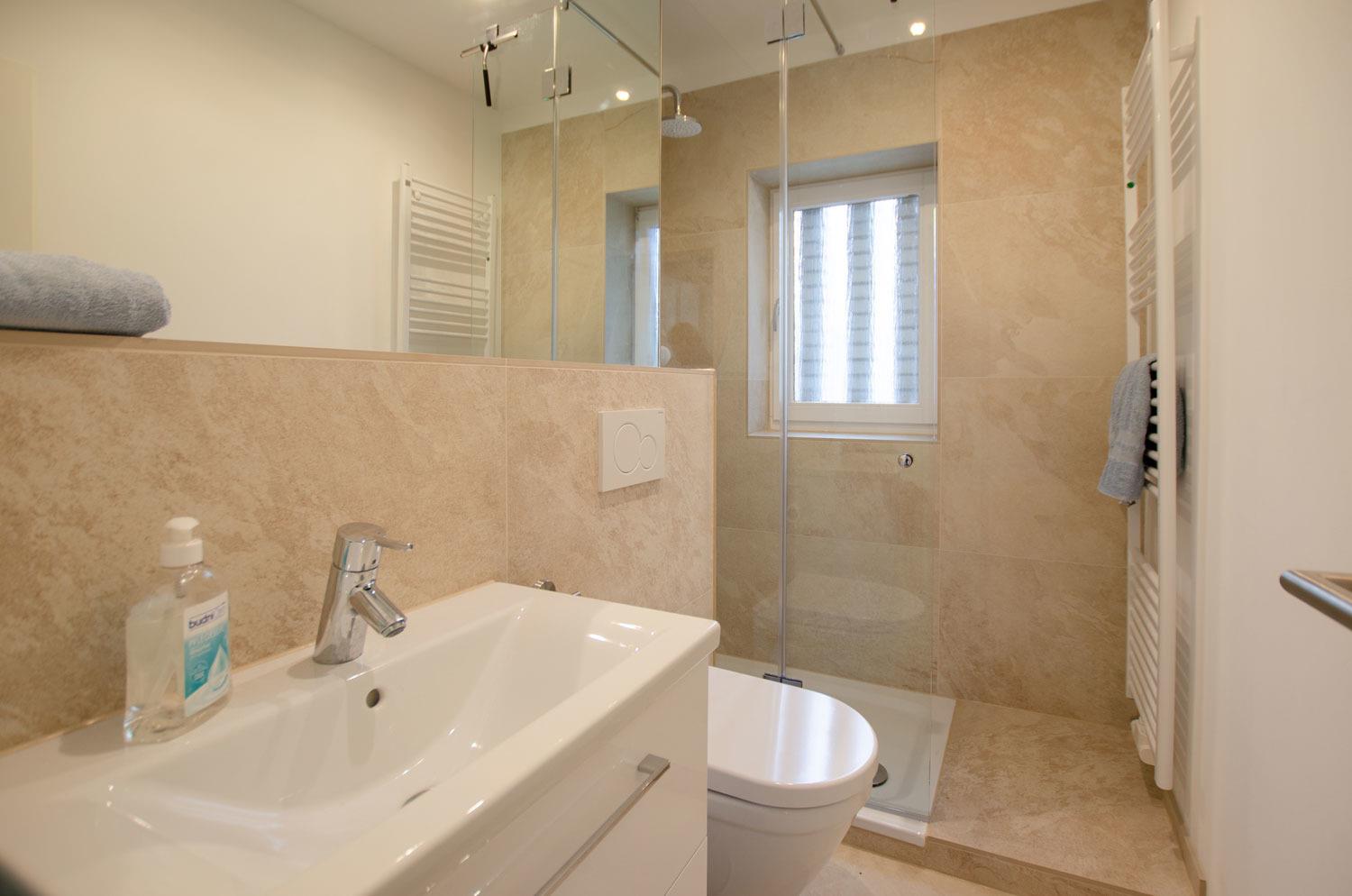 Das Badezimmer im Erdgeschoss verfügt über Dusche und WC.