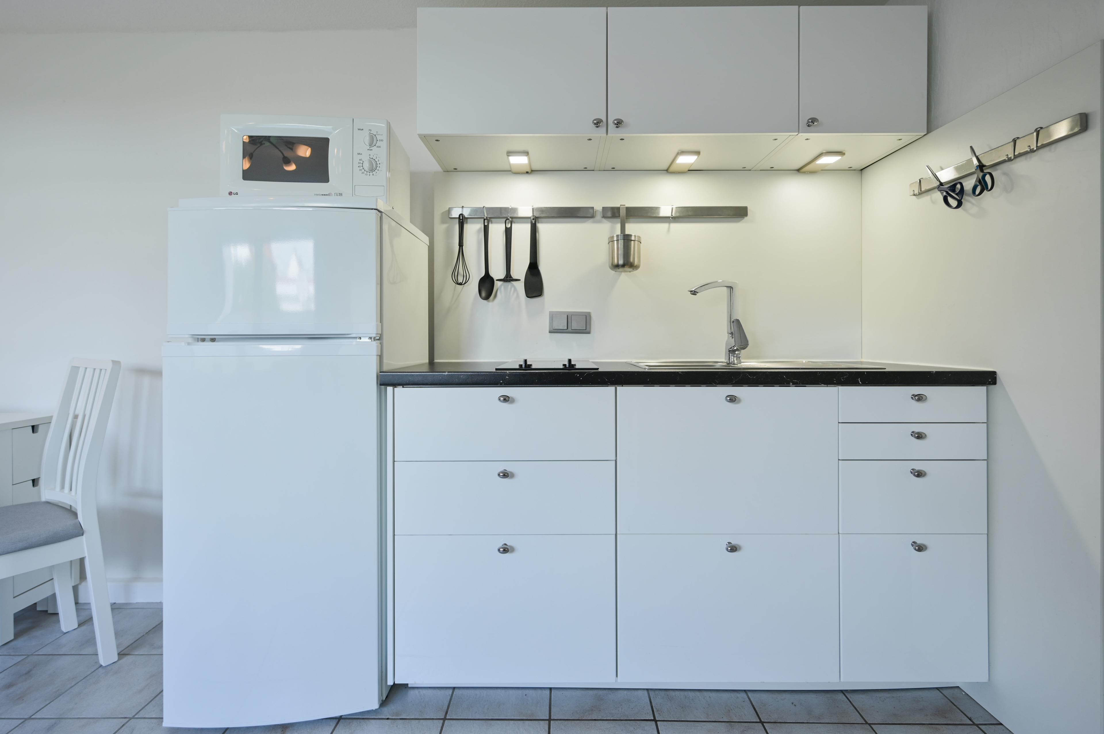 Hier finden Sie eine gemütliche Schlafcouch, einen Sessel, einen Couchtisch, einen Esstisch mit 2 Stühlen (3ter Stuhl vorhanden), TV-Möbel mit Flachbild-TV, Küchenzeile mit 2-Platten Induktionskochfeld, freistehender Kühlschrank mit Gefriermöglichkeit.