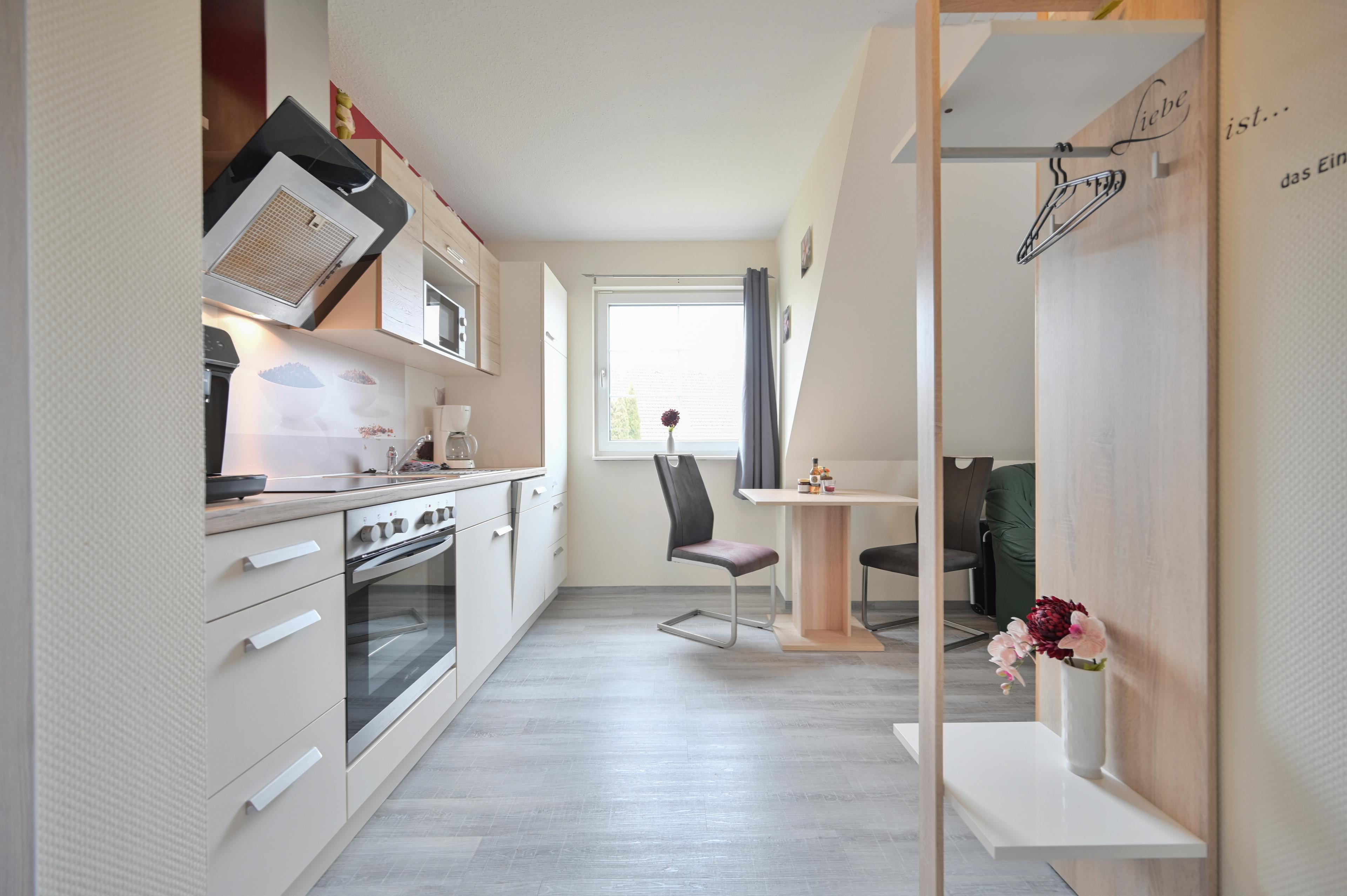 Die "Ferienwohnung meine mittlere Auszeit" liegt im Obergeschoss auf der rechten Seite. Der Garderobenbereich verfügt über ein Schuhregal und grenzt direkt an die offene Küche an, welche zur Saison 2017 neueingebaut worden ist. Die Küche verfügt über einen Backofen, ein Ceranfeld sowie eine Spülmaschine und einen Kaffeevollautomaten. Ebenfalls befindet sich ein Essplatz für zwei Personen im Küchenbereich.
