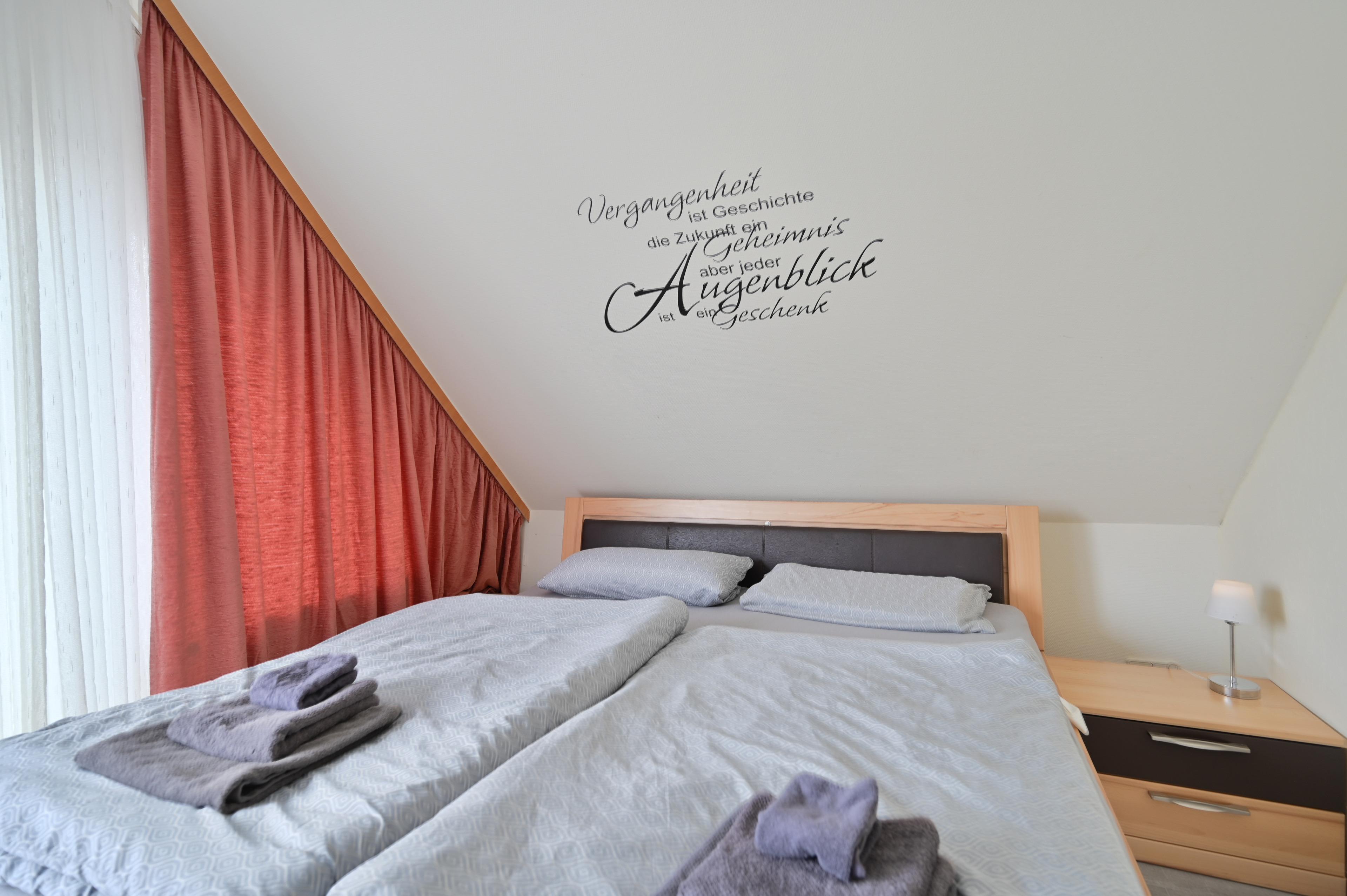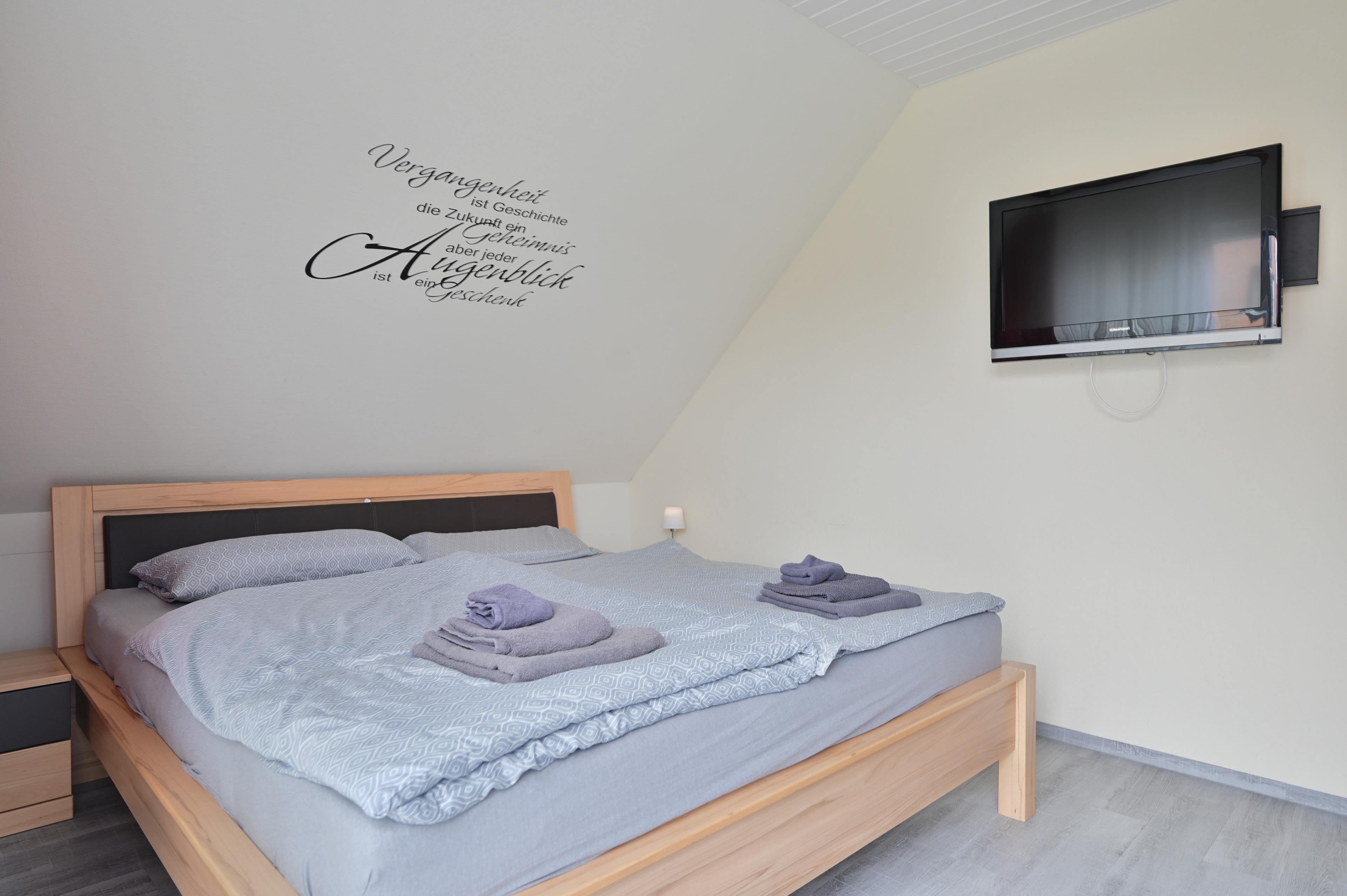 Das geräumige Wohnschlafzimmer verfügt über ein Doppelbett mit zwei Nachtischen und dimmbaren Nachtischlampen, sowie einem Kleiderschrank.