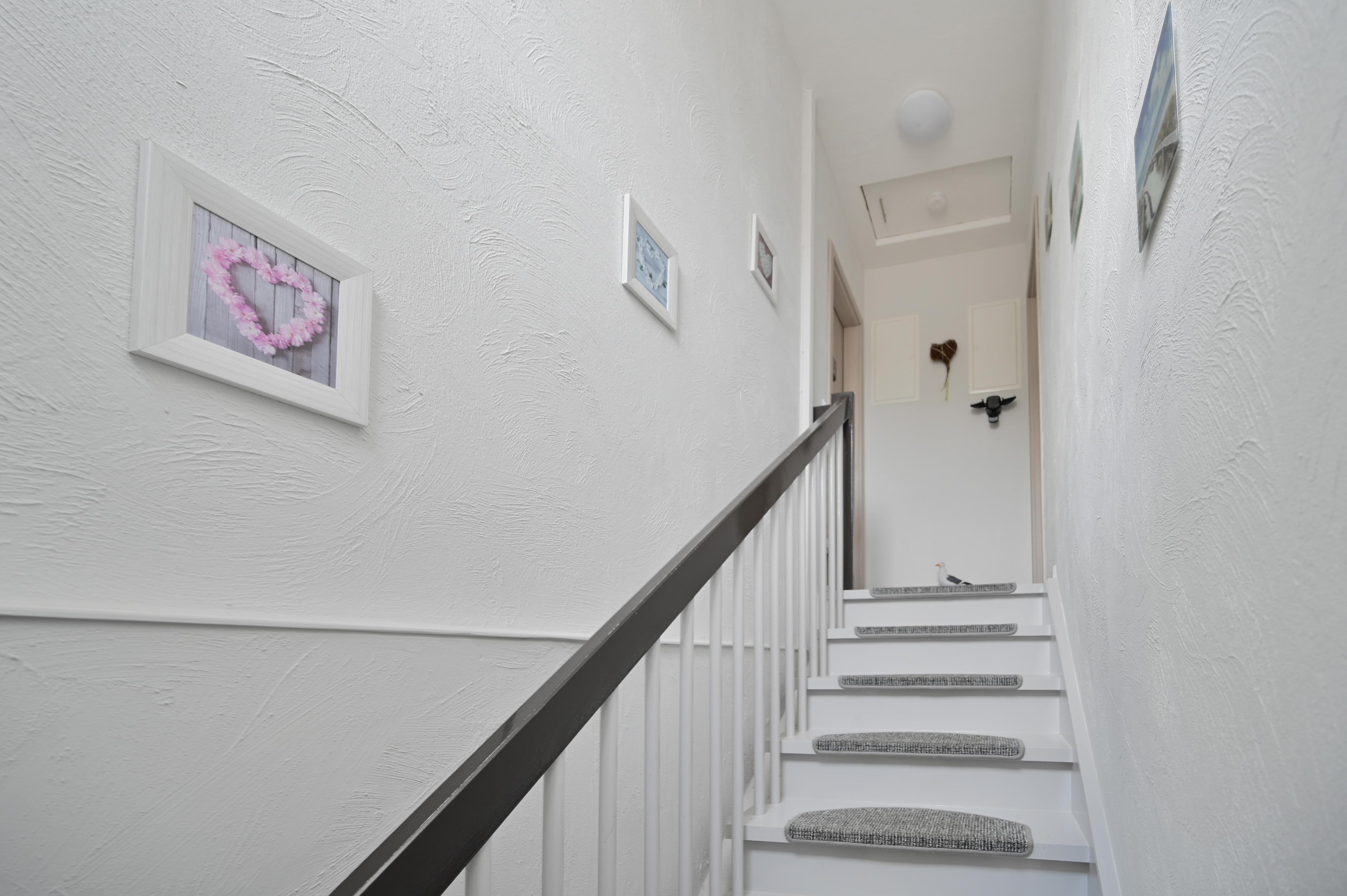 Die "Ferienwohnung meine kleine Auszeit" liegt im Obergeschoss auf der linken Seite. Der Garderobenbereich verfügt über ein Schuhregal und grenzt direkt an die offene Küche an, welche zur Saison 2017 neueingebaut worden ist.