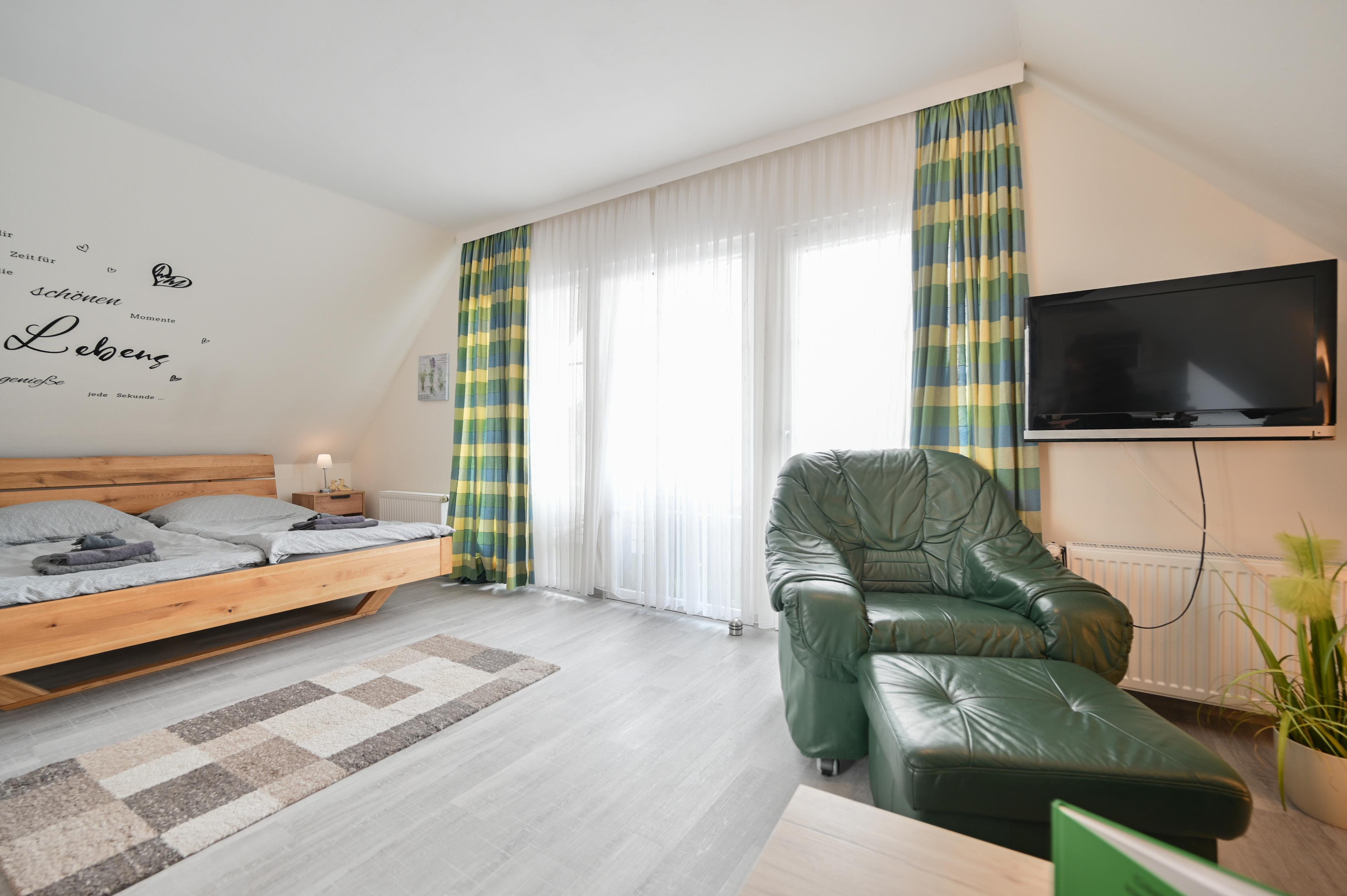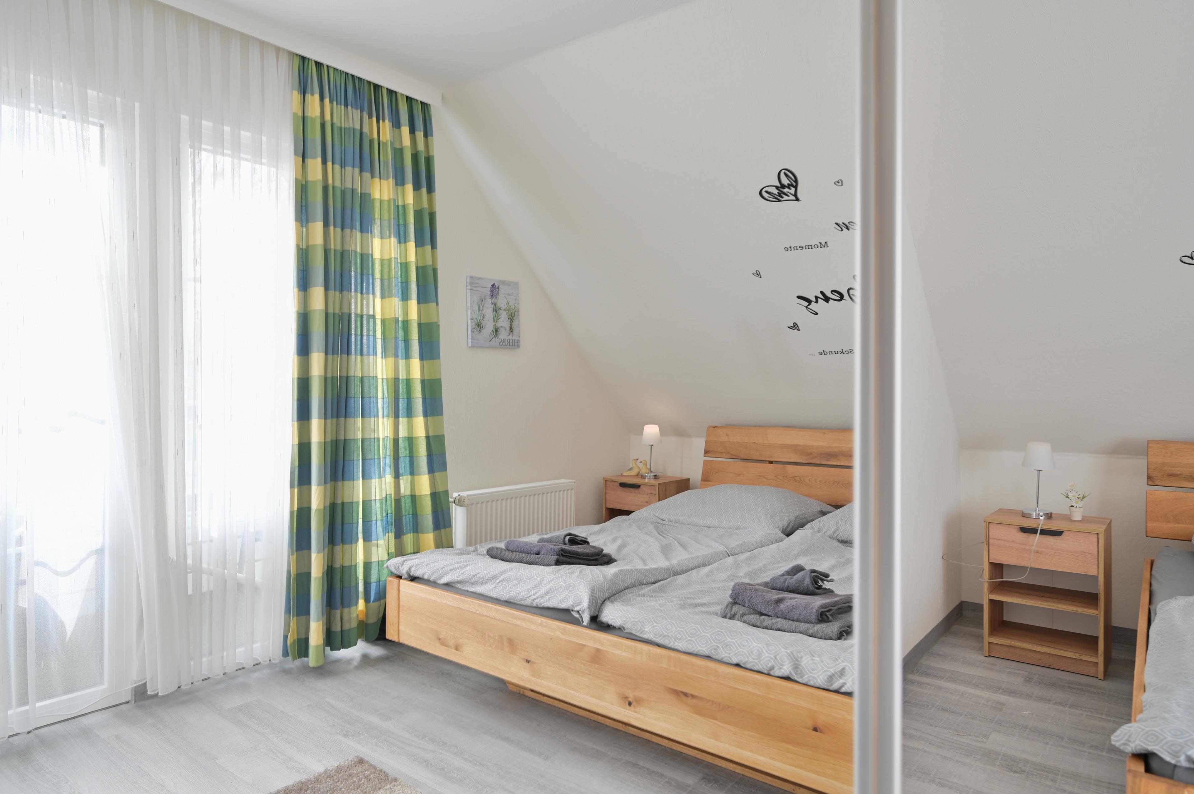 Das geräumige Wohnschlafzimmer verfügt über ein Doppelbett mit zwei Nachtischen und dimmbaren Nachtischlampen, sowie einem Kleiderschrank.