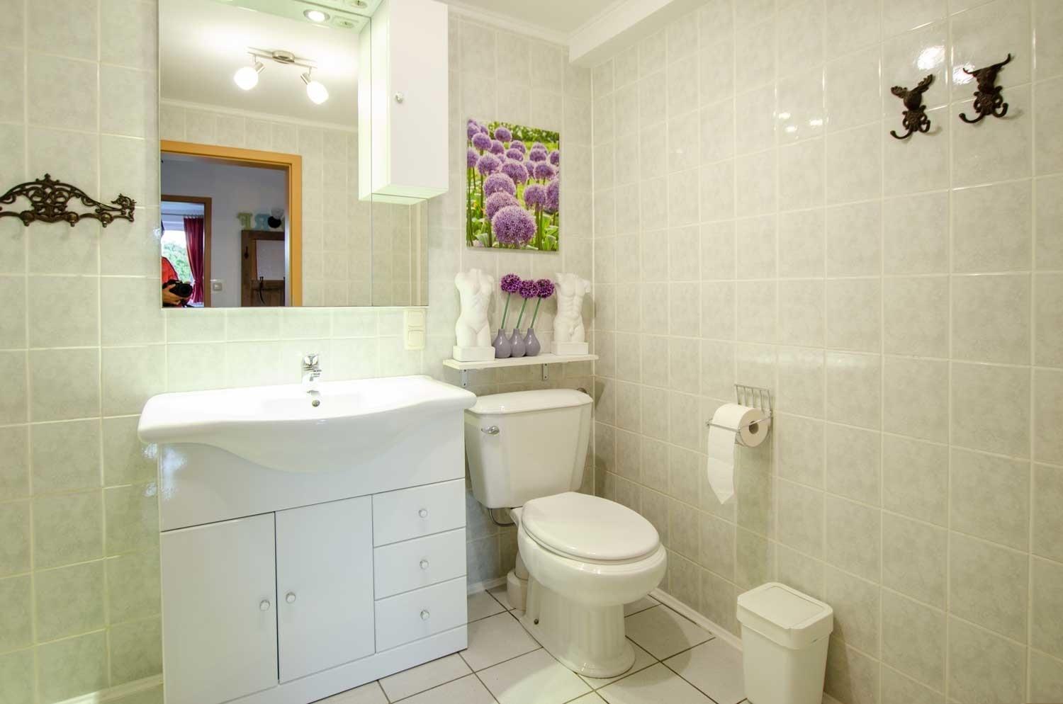 Das Badezimmer verfügt über Dusche, Waschtisch und WC