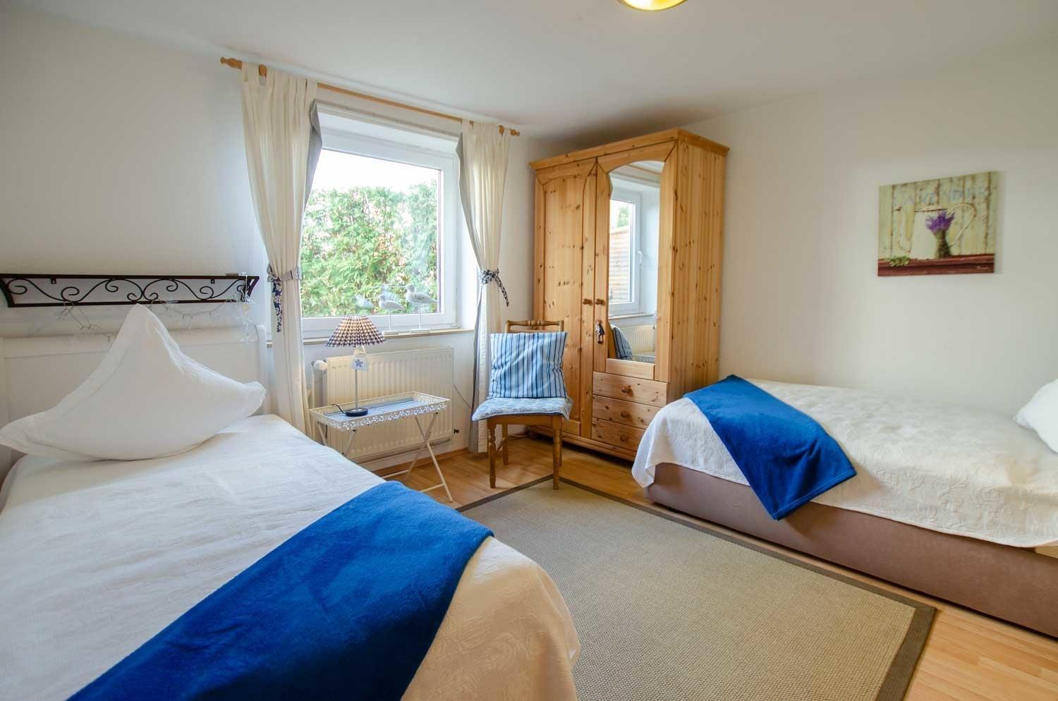 Ein Schlafzimmer ist mit Doppelbett und Kleiderschrank eingerichtet, ein zweites Schlafzimmer mit zwei Einzelbetten und Kleiderschrank.