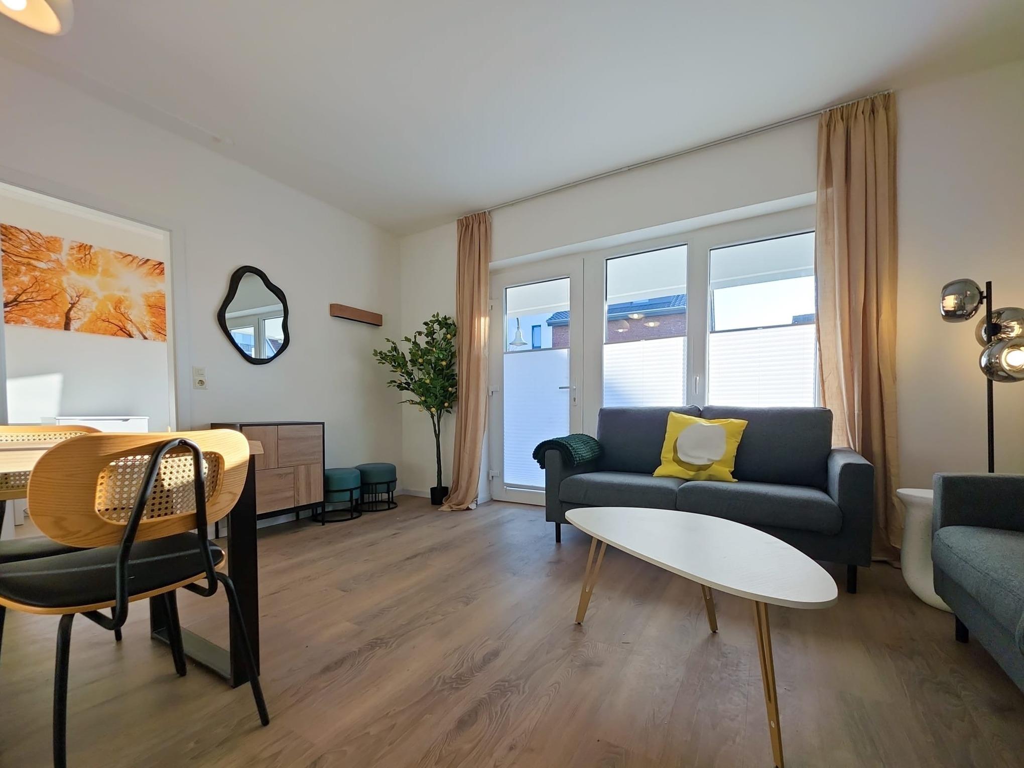 Die Ferienwohnung "Jutta" verfügt über ein Wohn-Esszimmer mit Zugang zur großen möblierten Terrasse, die teilweise überdacht ist. Im Wohnraum befinden sich zwei 2er Sofas mit Sofatisch, Esstisch mit 4 Stühlen, TV-Schrank.