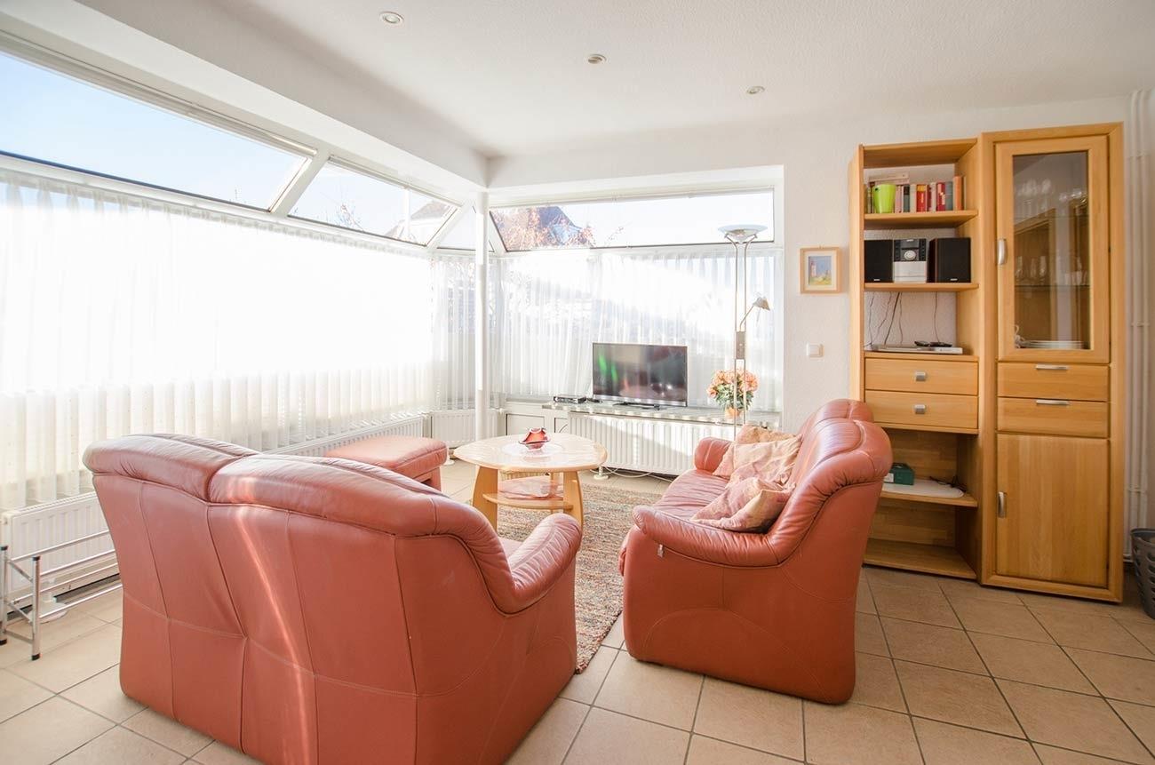 Das Wohnzimmer ist mit zwei Leder-Couchen, einem Wohnzimmertisch, TV, DVD, und HiFi-Anlage ausgestattet. Eine Essecke für 4 Personen befindet sich ebenfalls im Wohnzimmer.