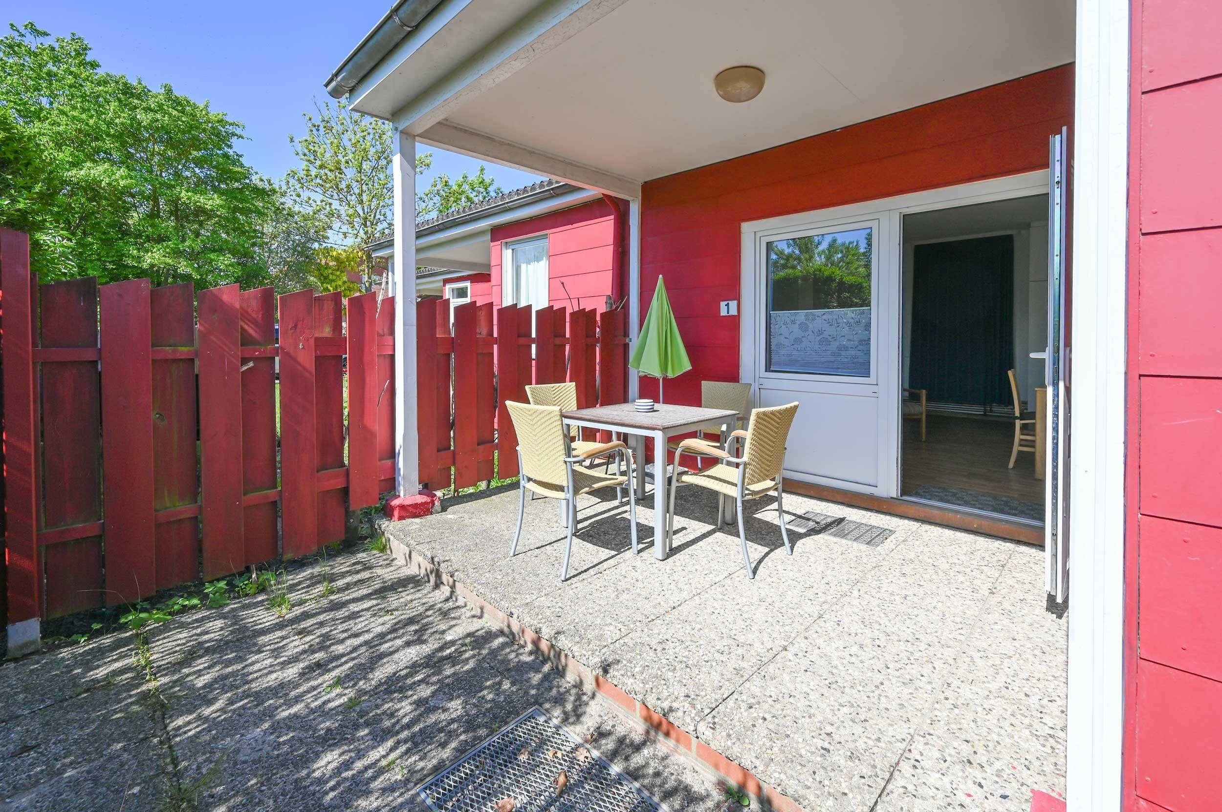 Sie betreten den Bungalow über die möblierte Terrasse.