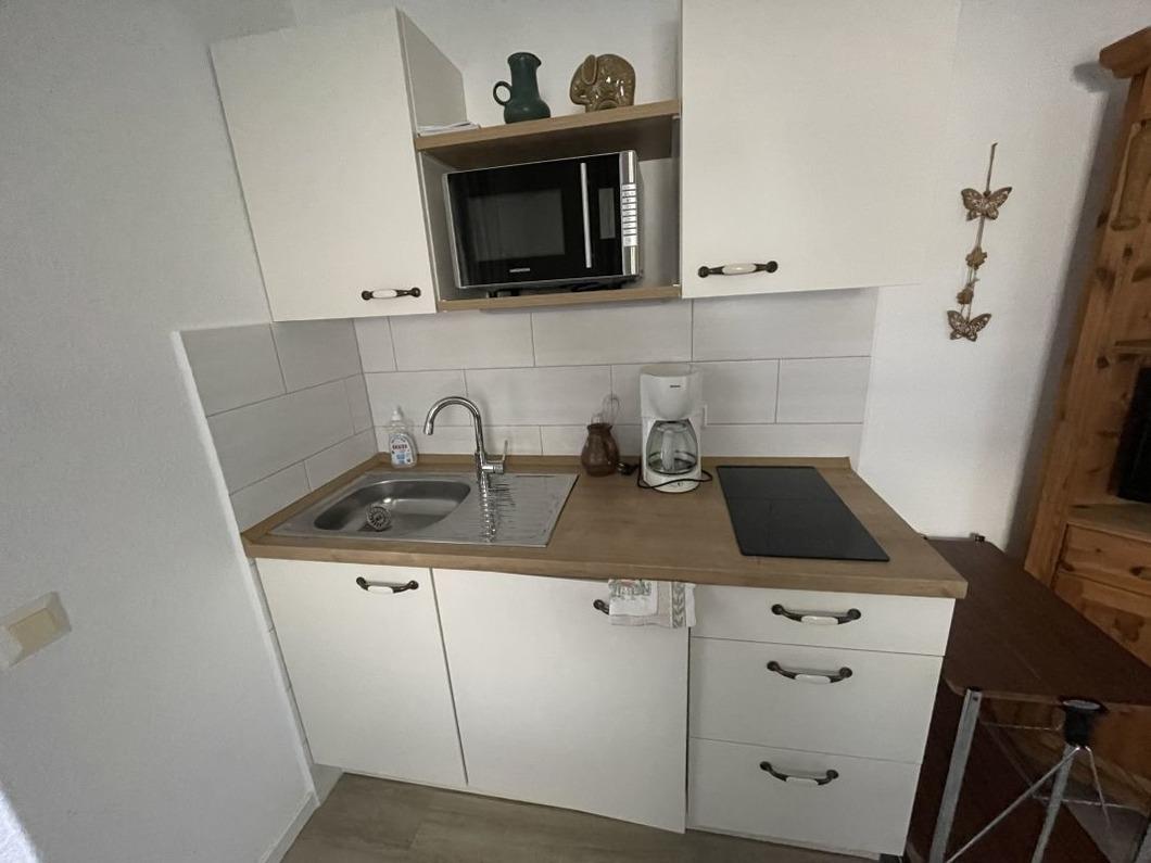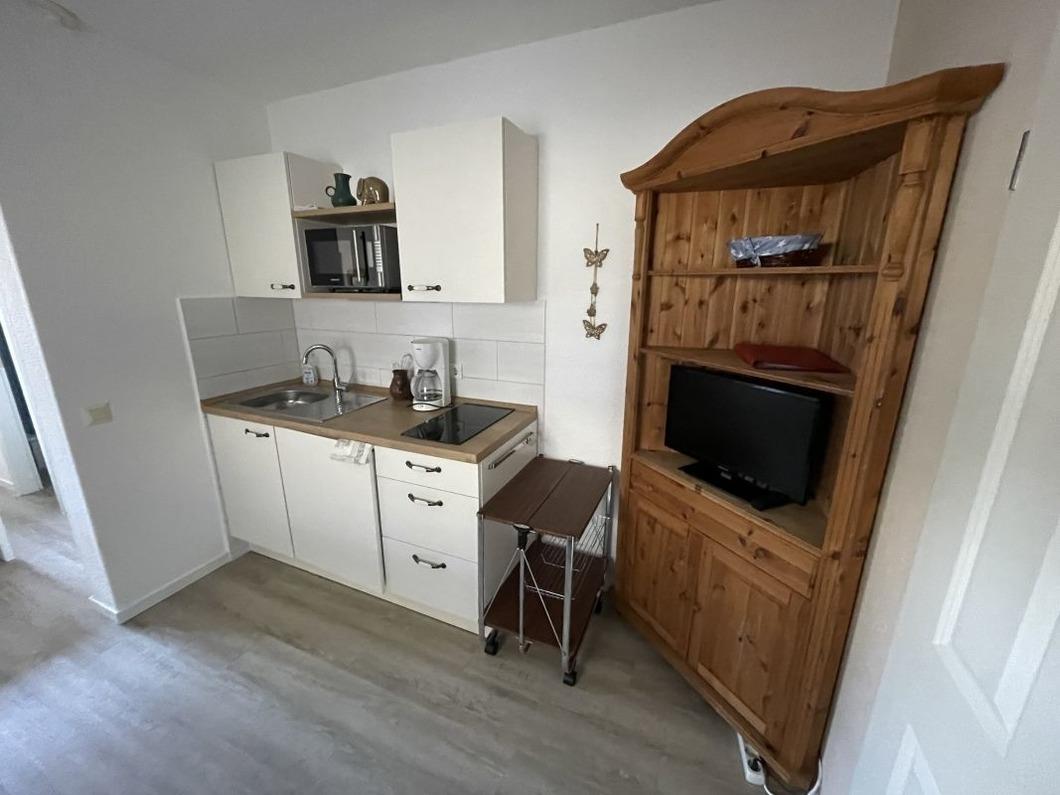 Sie ist ideal für 2 Personen mit einem Hund geeignet . Vorne befindet sich ein kleiner Wohnbereich mit einer neuen Küchenzeile und einem Flach-TV.