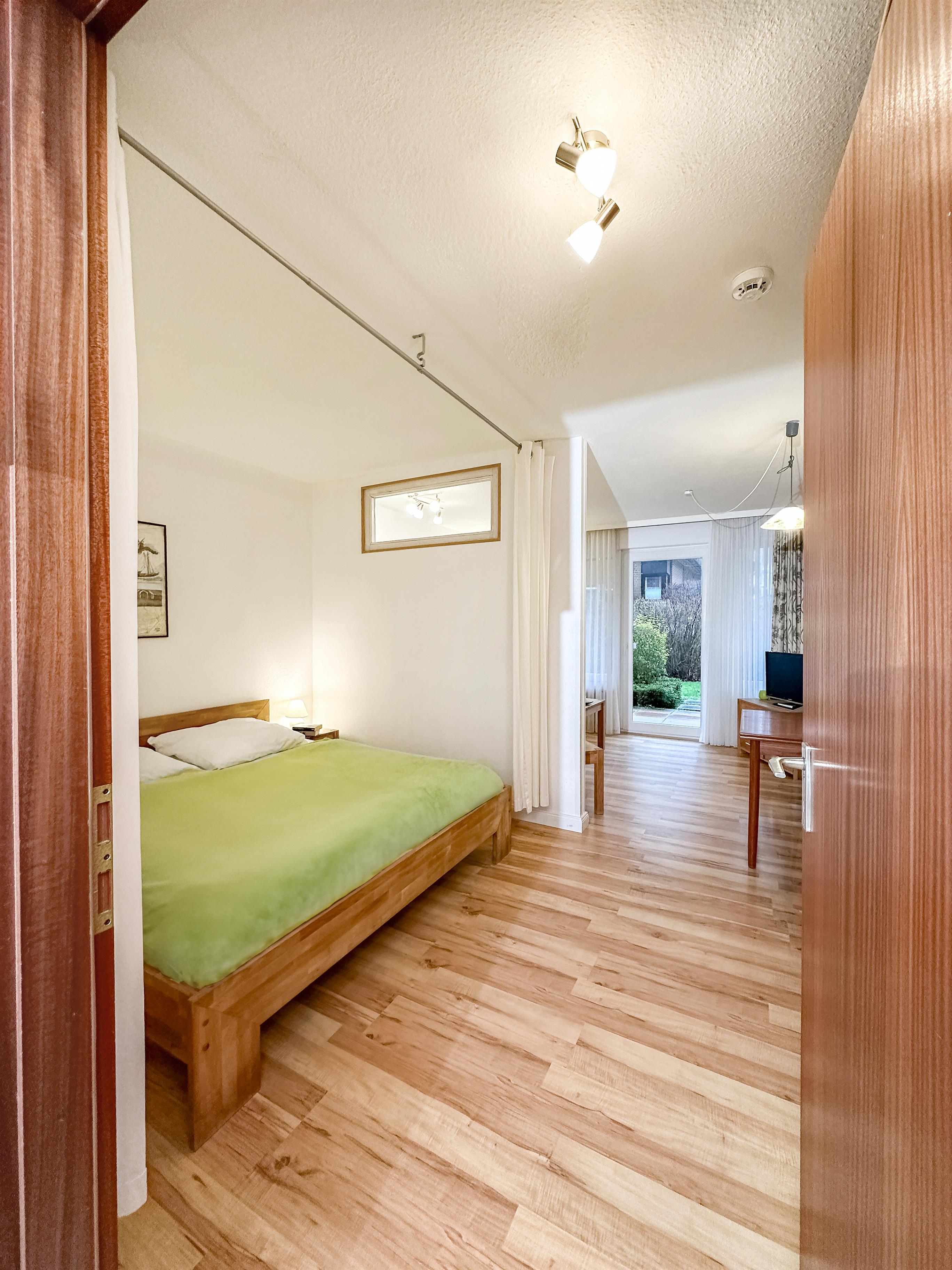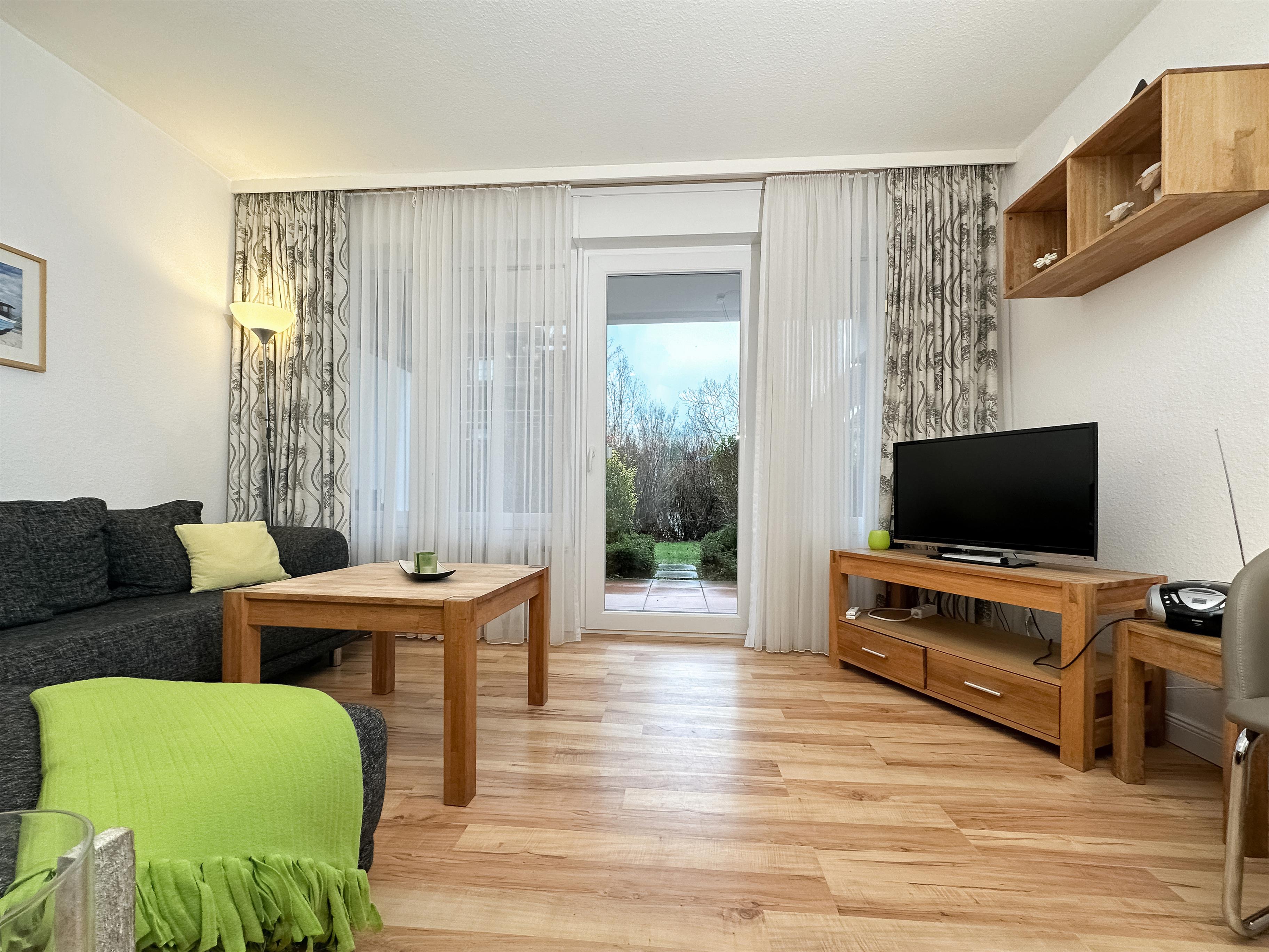 Im kombinierten Wohn-Schlafraum befinden sich eine Ess- und eine Couchecke sowie eine abgeteilte Schlafnische mit Doppelbett (2x 80x200). Von der Couchecke aus können Sie sich von einem SAT-TV-Flachbildschirm oder einem Radio unterhalten lassen. Die Fensterfront lässt sich mit den Aussen-Rollläden verdunkeln. Oder genießen Sie die gute Ostseeluft auf der großzügigen, mit Sitzmöbeln ausgestatteten Terrasse mit Gartenzugang.