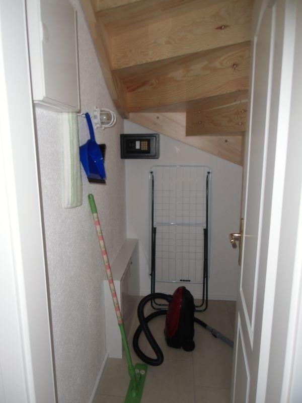 Vorhanden sind Gartenstühle und Tisch, Grill, Tresor und Staubsauger.