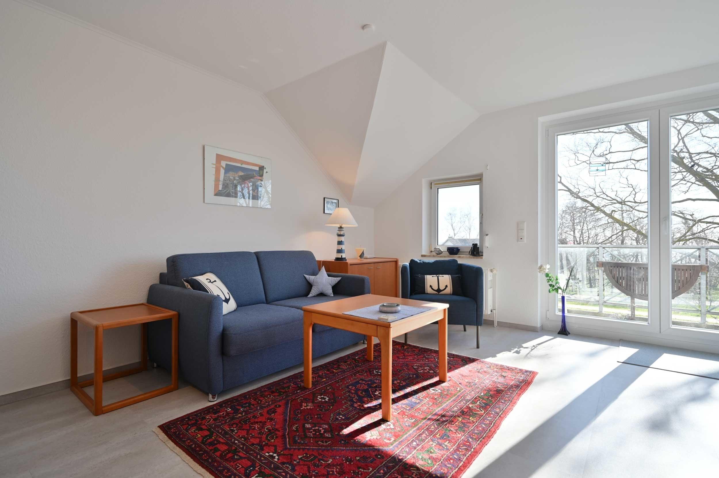 Das Wohnzimmer ist mit einer Couch, Couchtisch, Sessel, TV-Möbel mit TV, Essbereich mit 4 Stühlen und einer integrierten Küchennische eingerichtet. Von hier aus haben Sie Zugang zum Balkon und zum Schlafzimmer.