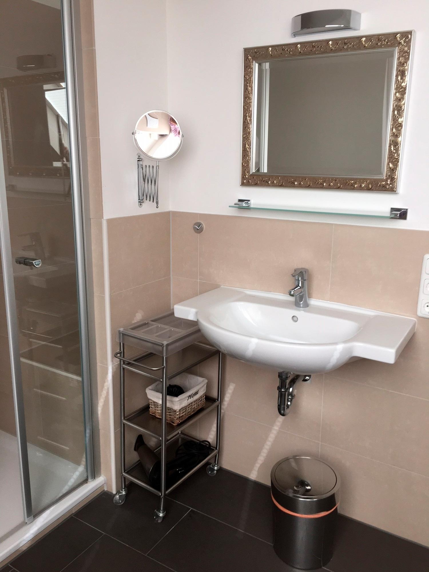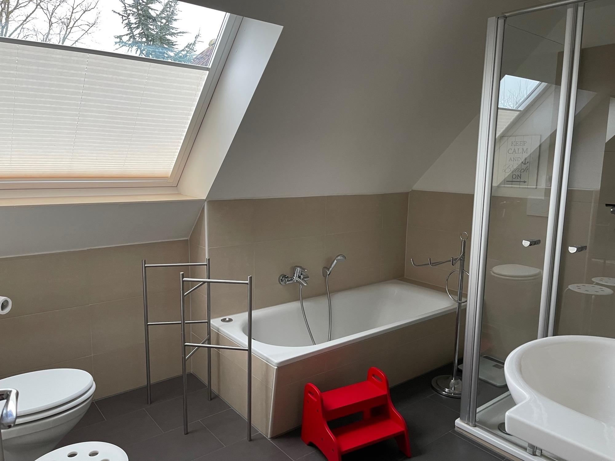 Das Bad verfügt über Fußbodenheizung sowie eine Badewanne und Dusche.