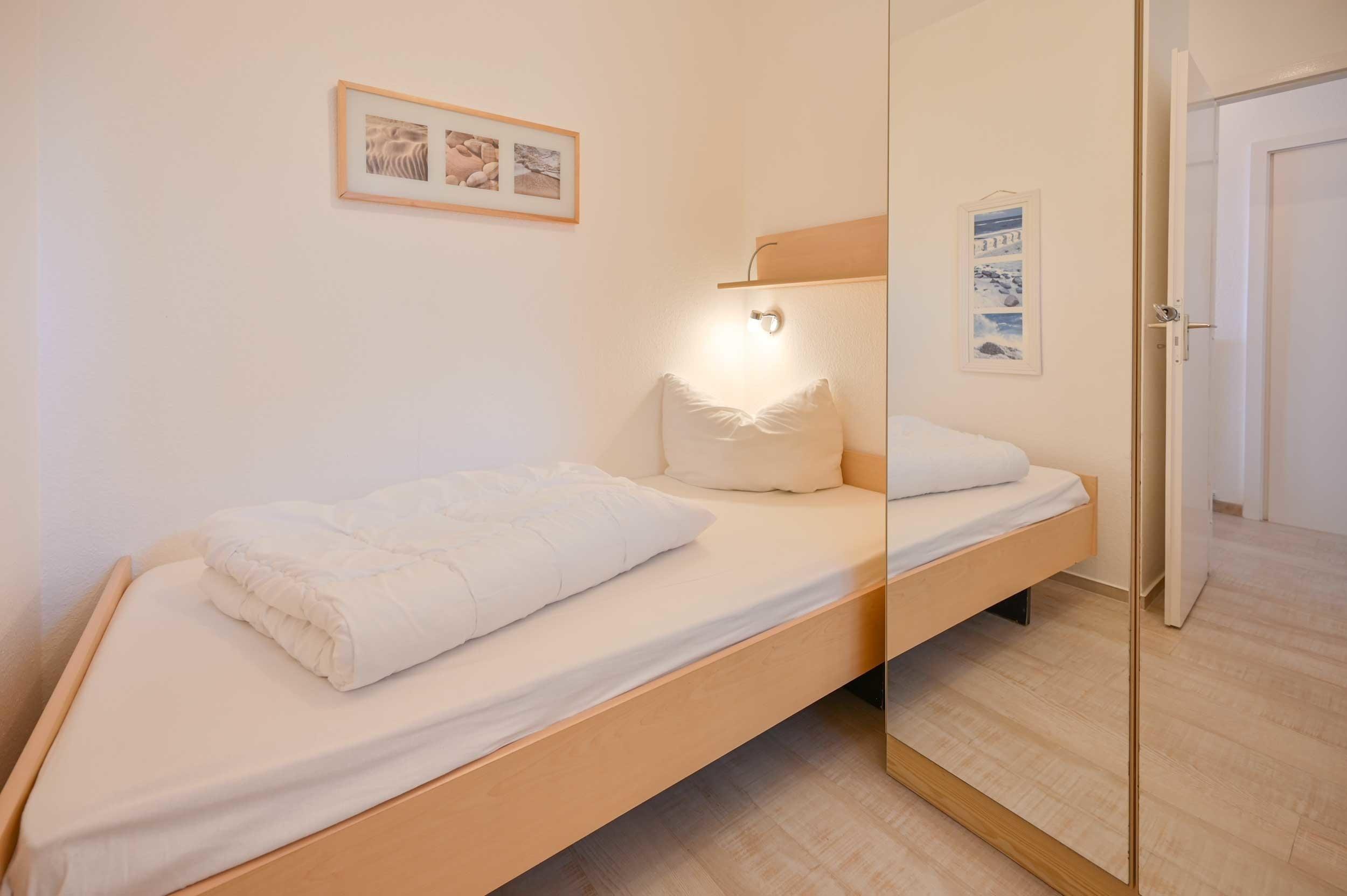 Ebenfalls bietet Ihnen die Wohnung ein separates Schlafzimmer. Dieses ist mit zwei getrennt stehenden Betten und einem Kleiderschrank möbeliert.