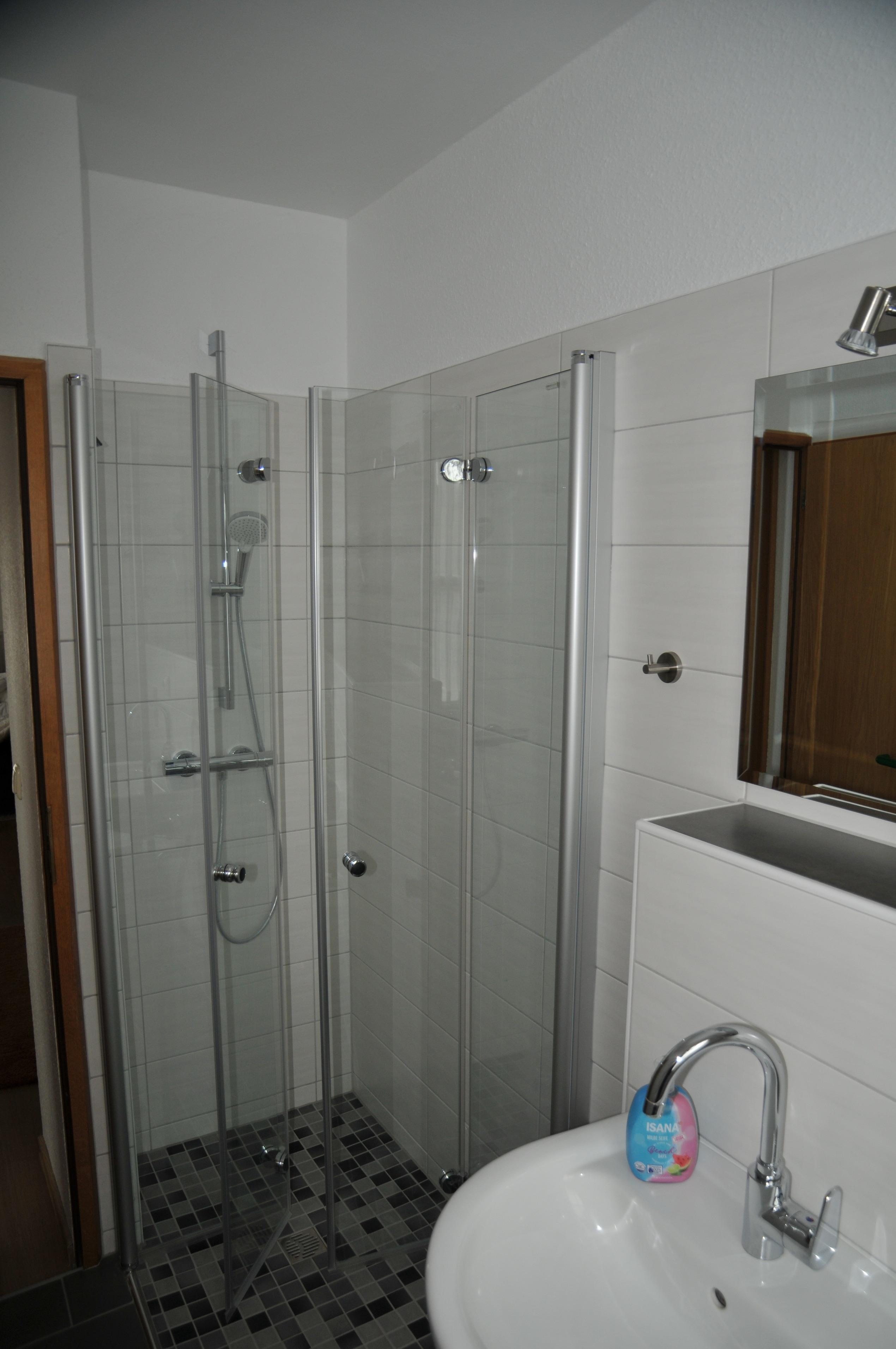 Das Bad hat eine ebenerdige Dusche mit einer Glas-Faltwand, einen Waschtisch, WC und ein Fenster zum Lüften.