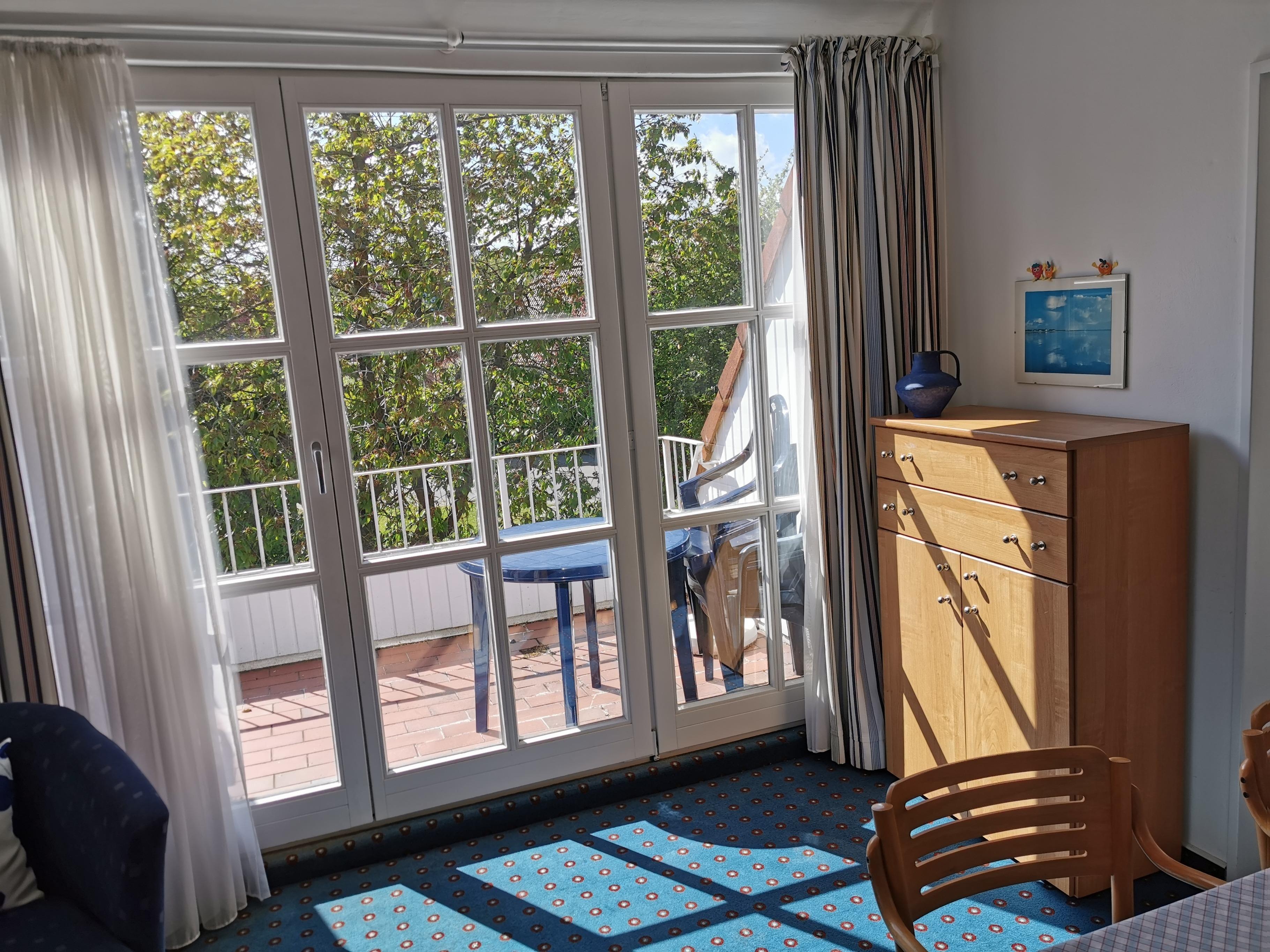 Wohnzimmer mit 2 anschließenden Balkonen nach Süden ( überdacht), und nach Südwesten ,Doppelschlafcouch