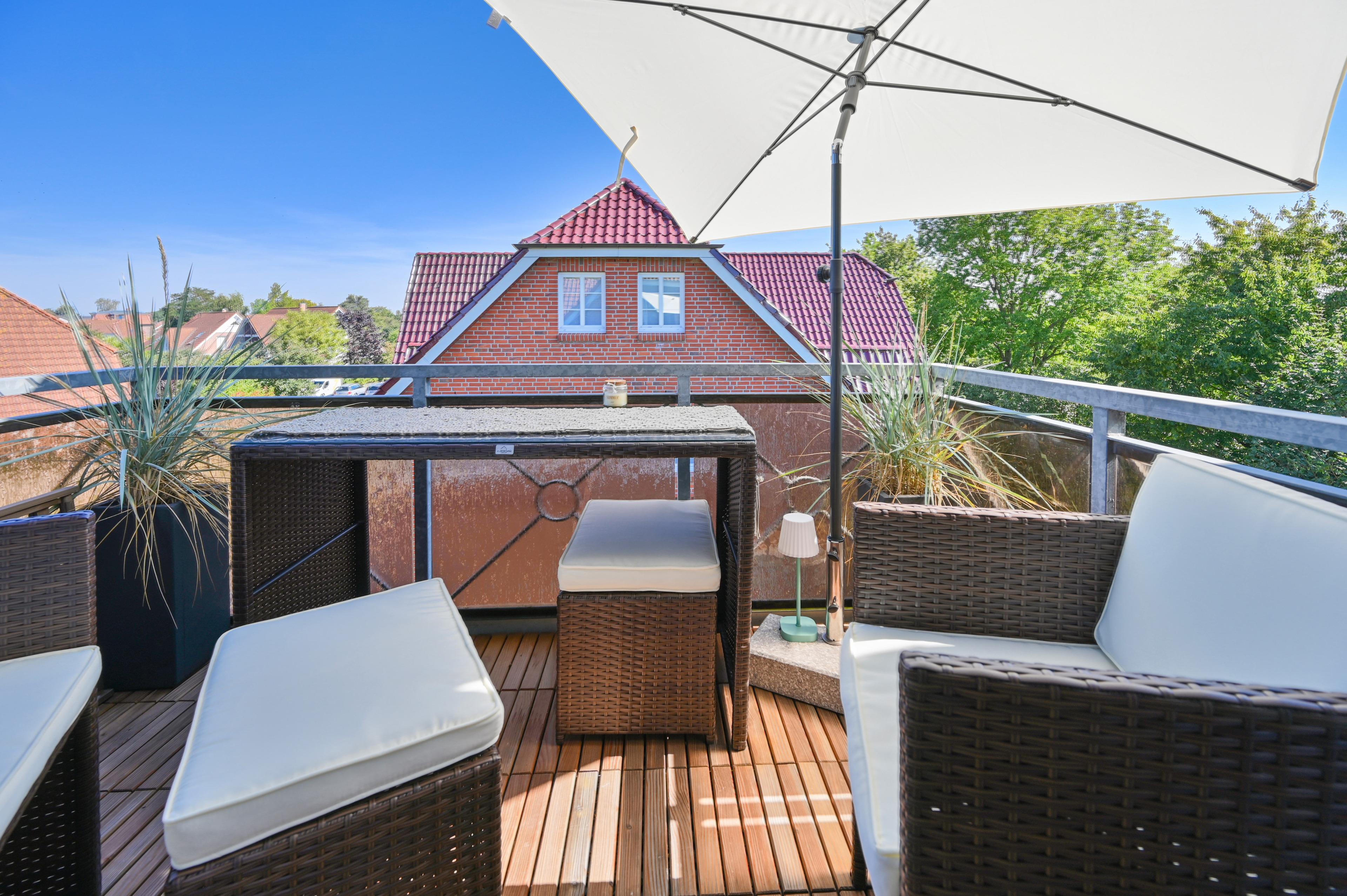Von hier aus gelangen Sie auf den möblierten Balkon, der nach Osten ausgerichtet ist. Hier können Sie Ihren Morgenkaffee genießen.