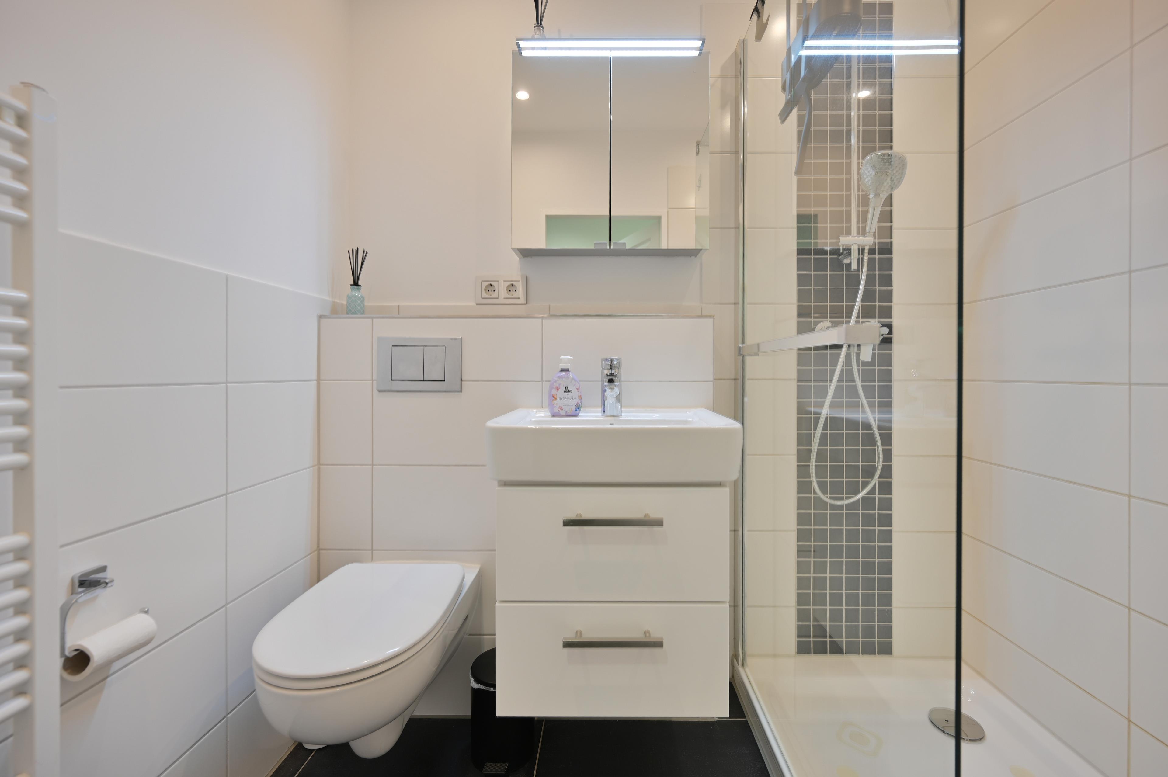 Das Badezimmer verfügt über eine Dusche und ein WC und bietet einen gepflegten, angenehmen Raum für Ihre tägliche Nutzung.