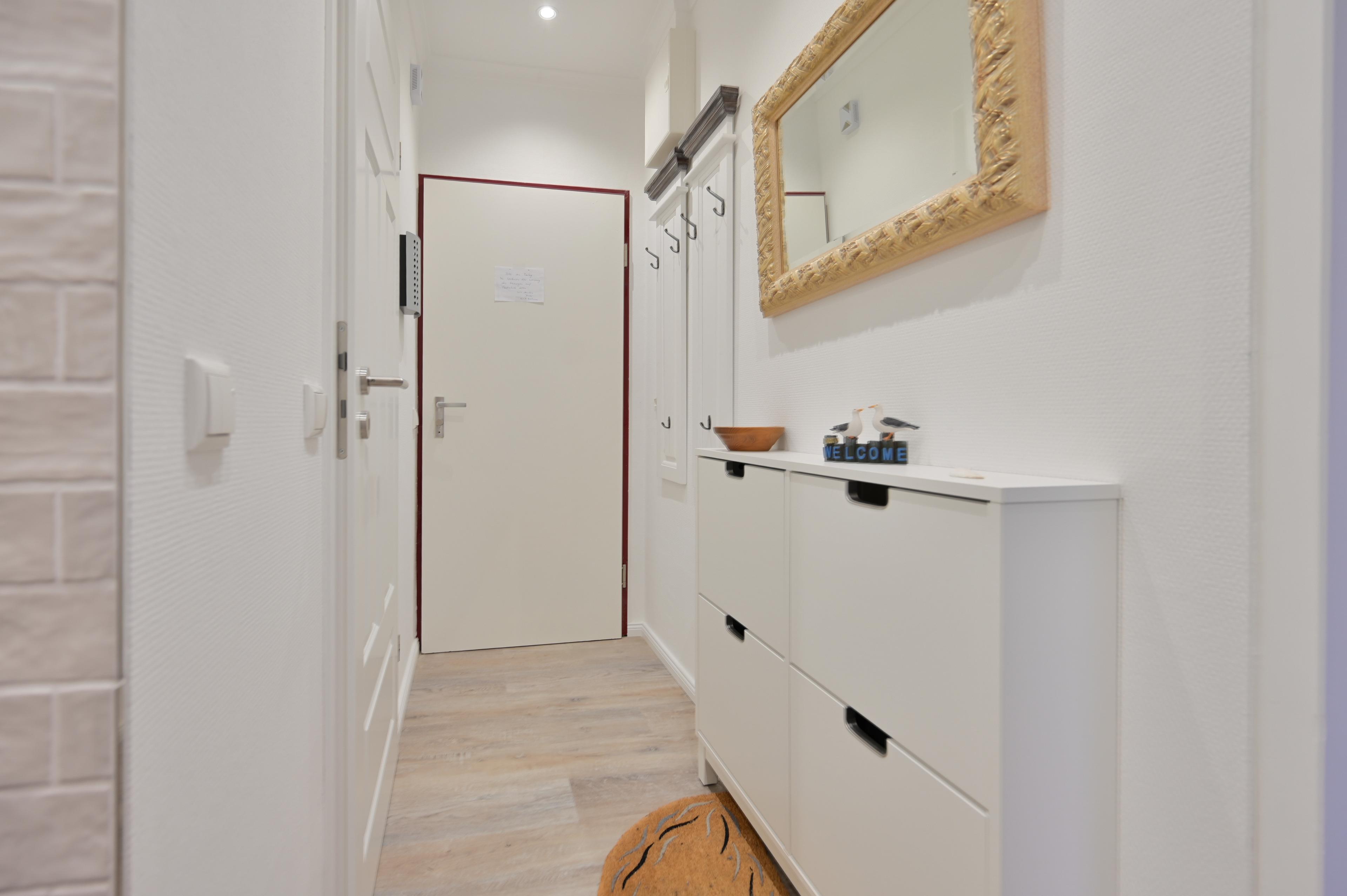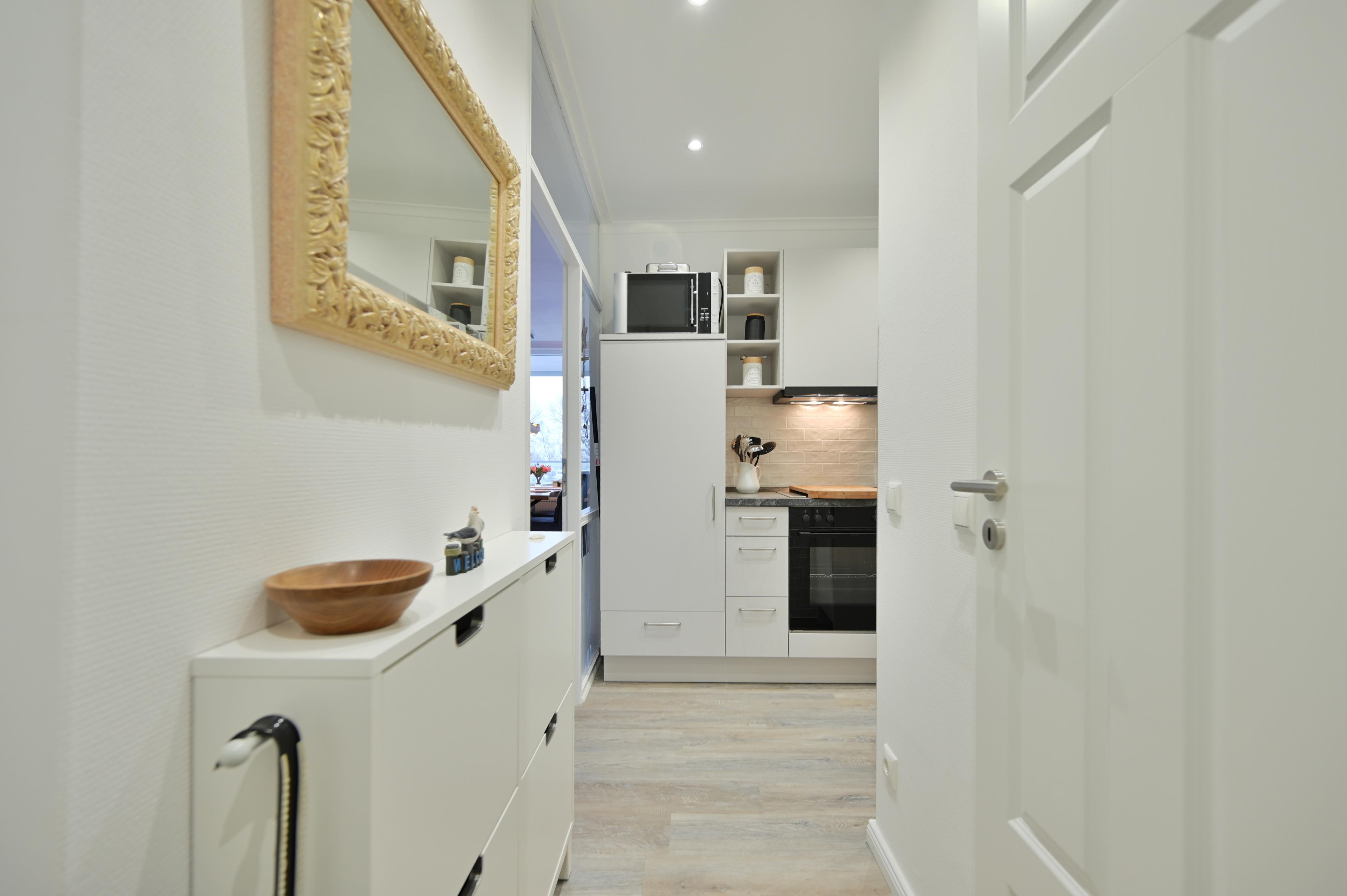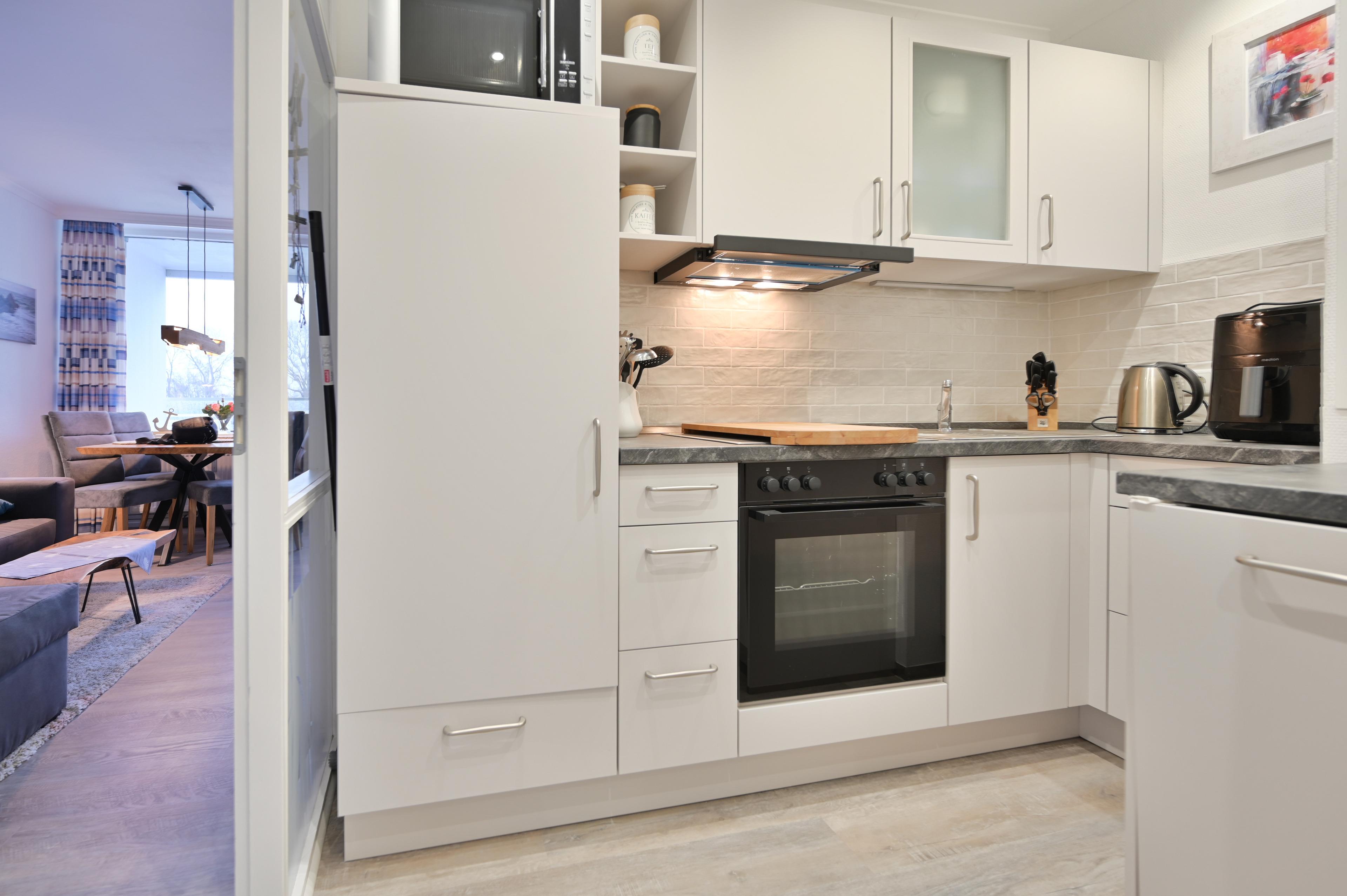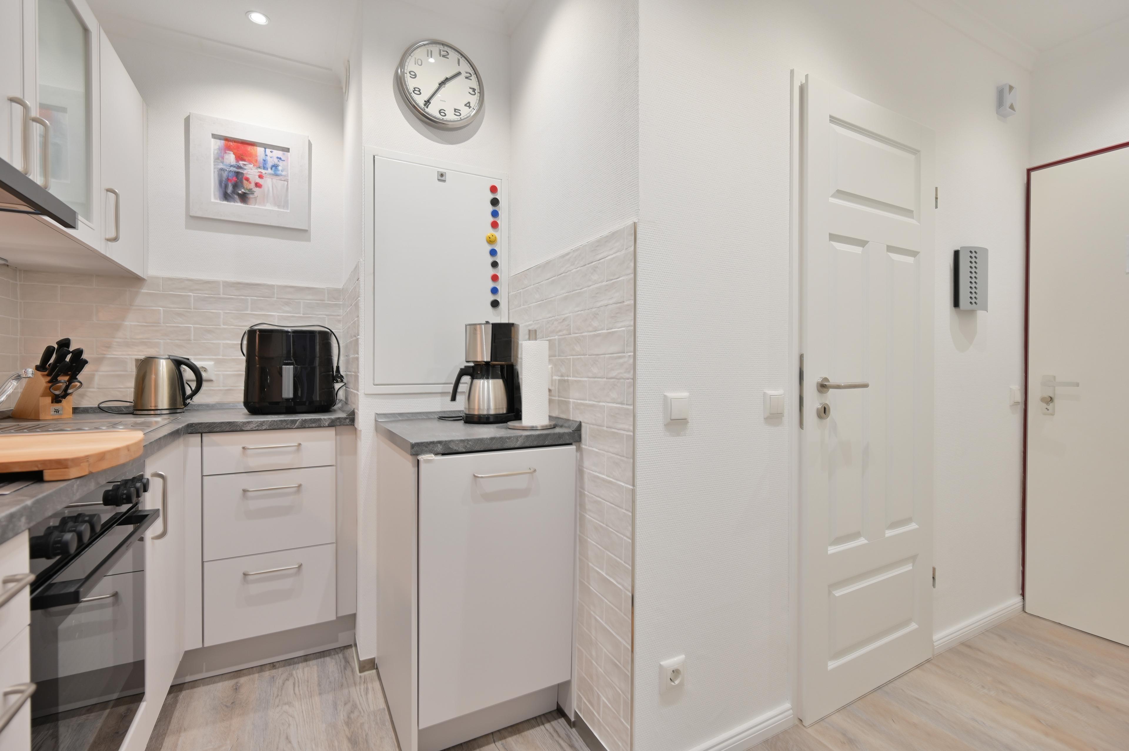 Die Küche ist im Flur integriert und gut ausgestattet (Spülmaschine, Mikrowelle mit Grillfunktion, Heißluftfriteuse, Handrührgerät, Passierstab und mehr) Sie bietet alles, was Sie für die Zubereitung Ihrer Mahlzeiten benötigen.