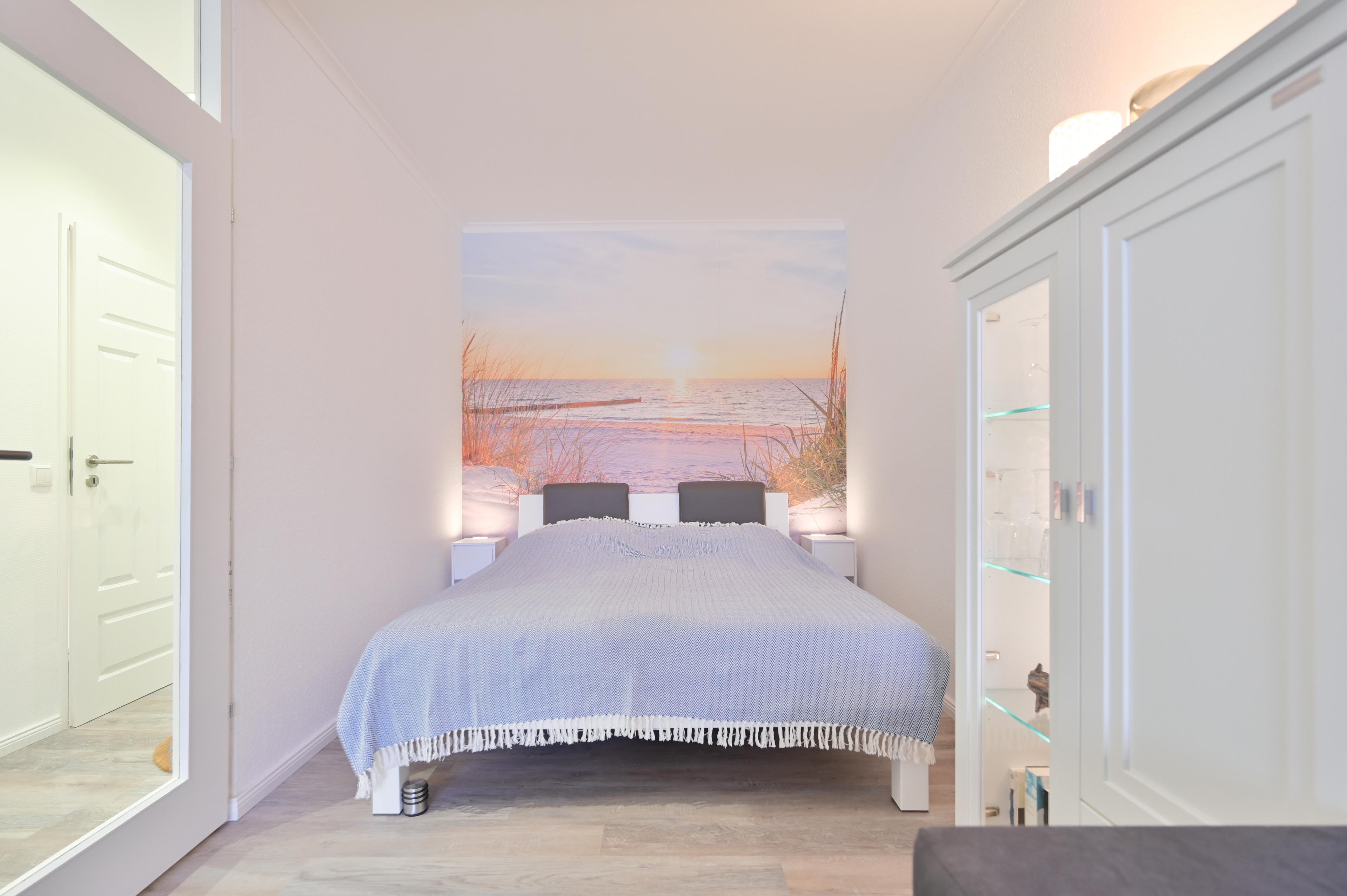 Der helle und gemütliche Wohn Schlafraum bildet das Herzstück der Wohnung. Hier befindet sich ein komfortables Doppelbett in der Größe 160 x 200 cm sowie ein großer Esstisch mit vier Stühlen, der direkt am Fenster steht. Von hier aus genießen Sie nicht nur Ihre Mahlzeiten, sondern auch den Blick nach draußen. Der angrenzende Balkon lädt dazu ein, die frische Ostseeluft zu genießen und den Ausblick auf die Ostsee auf sich wirken zu lassen.