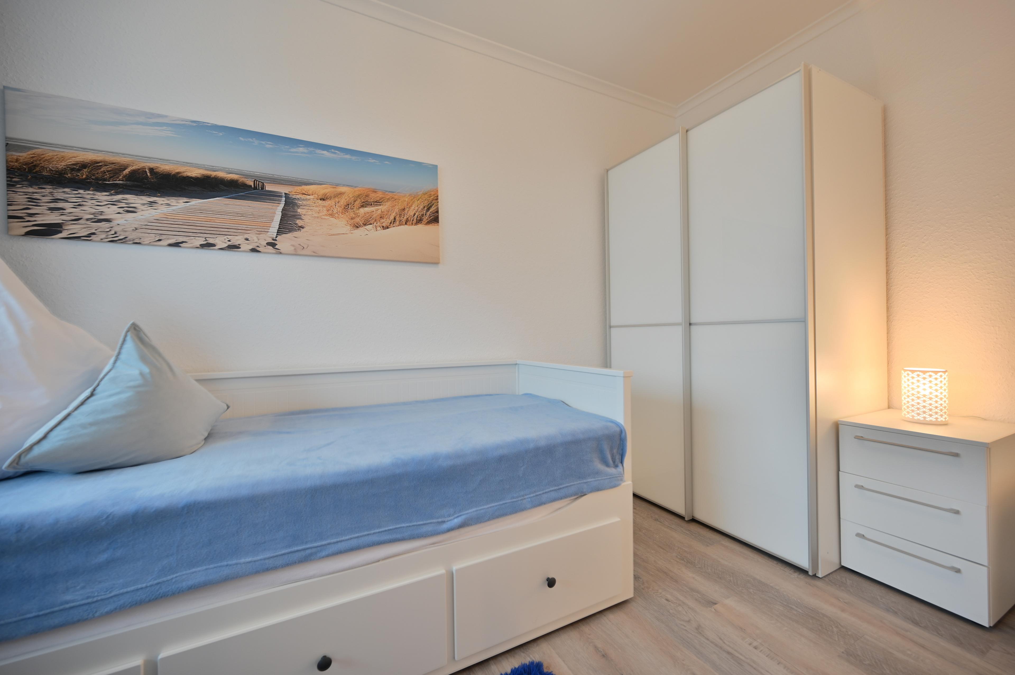 Im separaten Kinderzimmer steht ein Einzelbett in der Größe 80 x 200 cm, das sich bei Bedarf auf 160 x 200 cm ausziehen lässt und somit Platz für zwei Personen bietet. Zusätzlich ist ein Kleiderschrank vorhanden, der ausreichend Stauraum bietet.