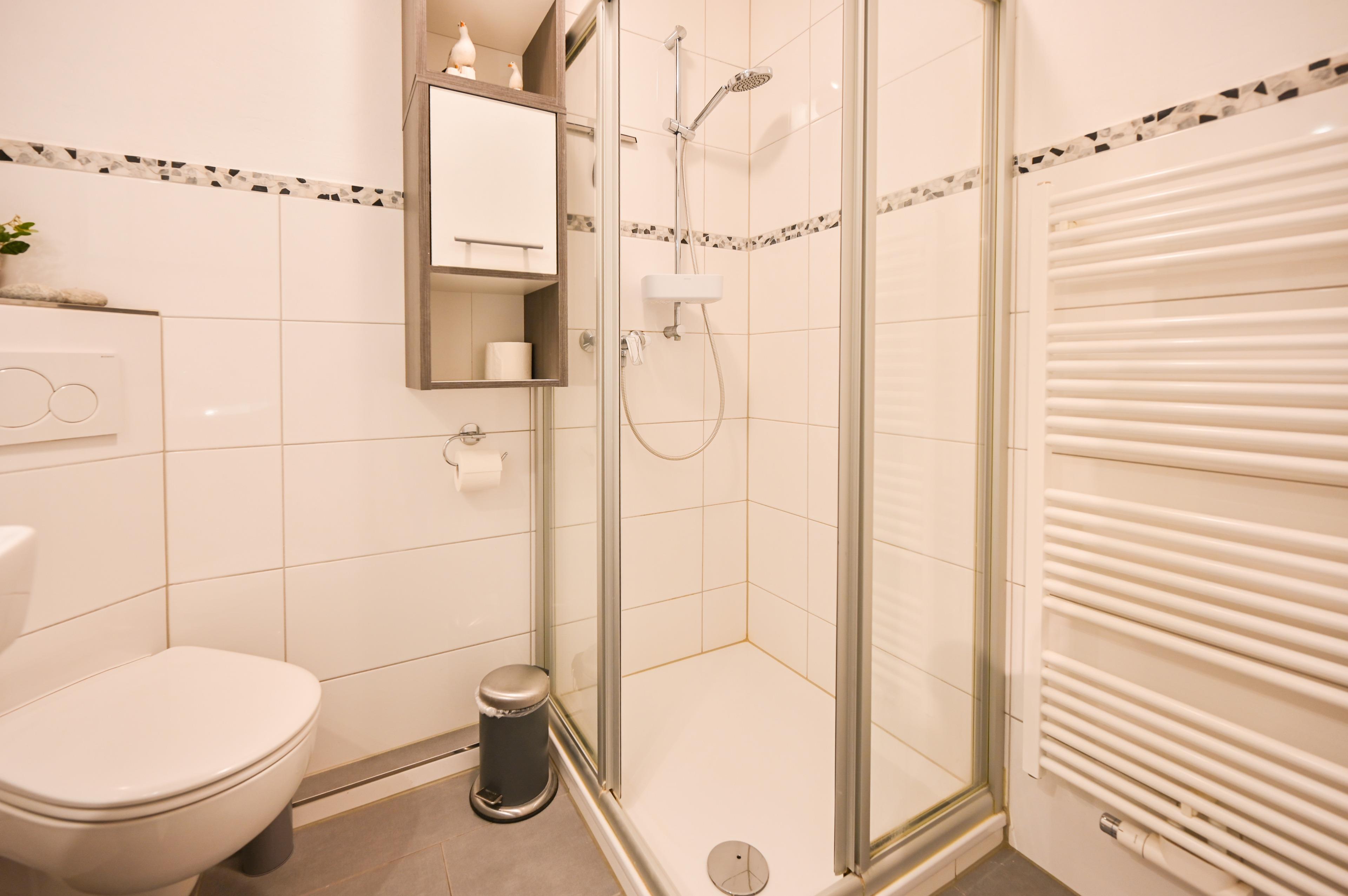 Das Badezimmer mit moderner Dusche und WC sowie die praktische Küchenzeile machen Ihren Ostseeurlaub perfekt.